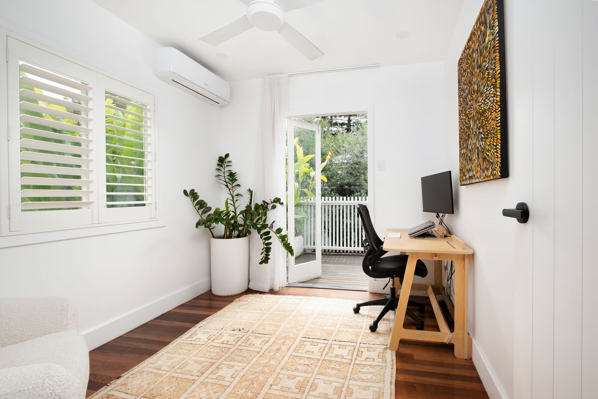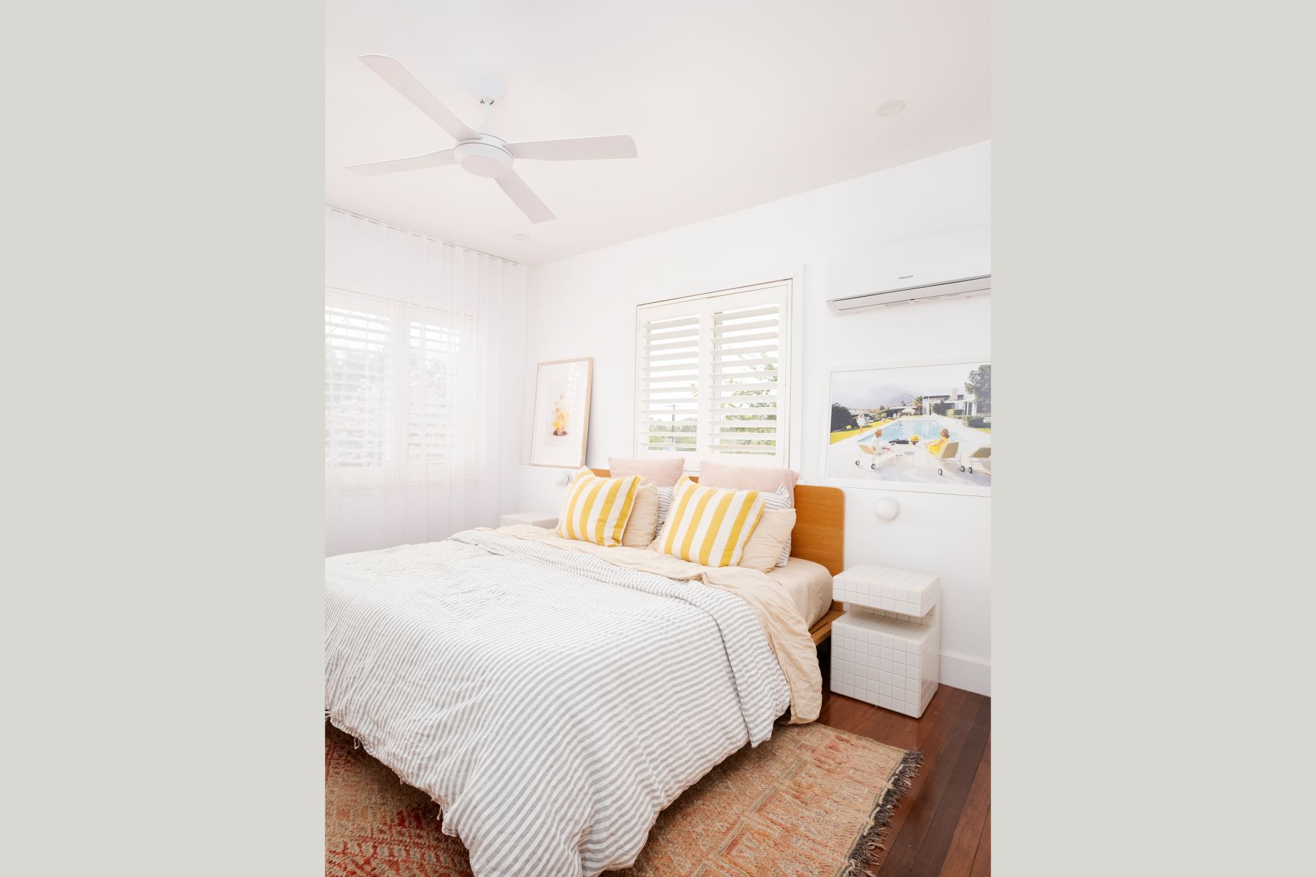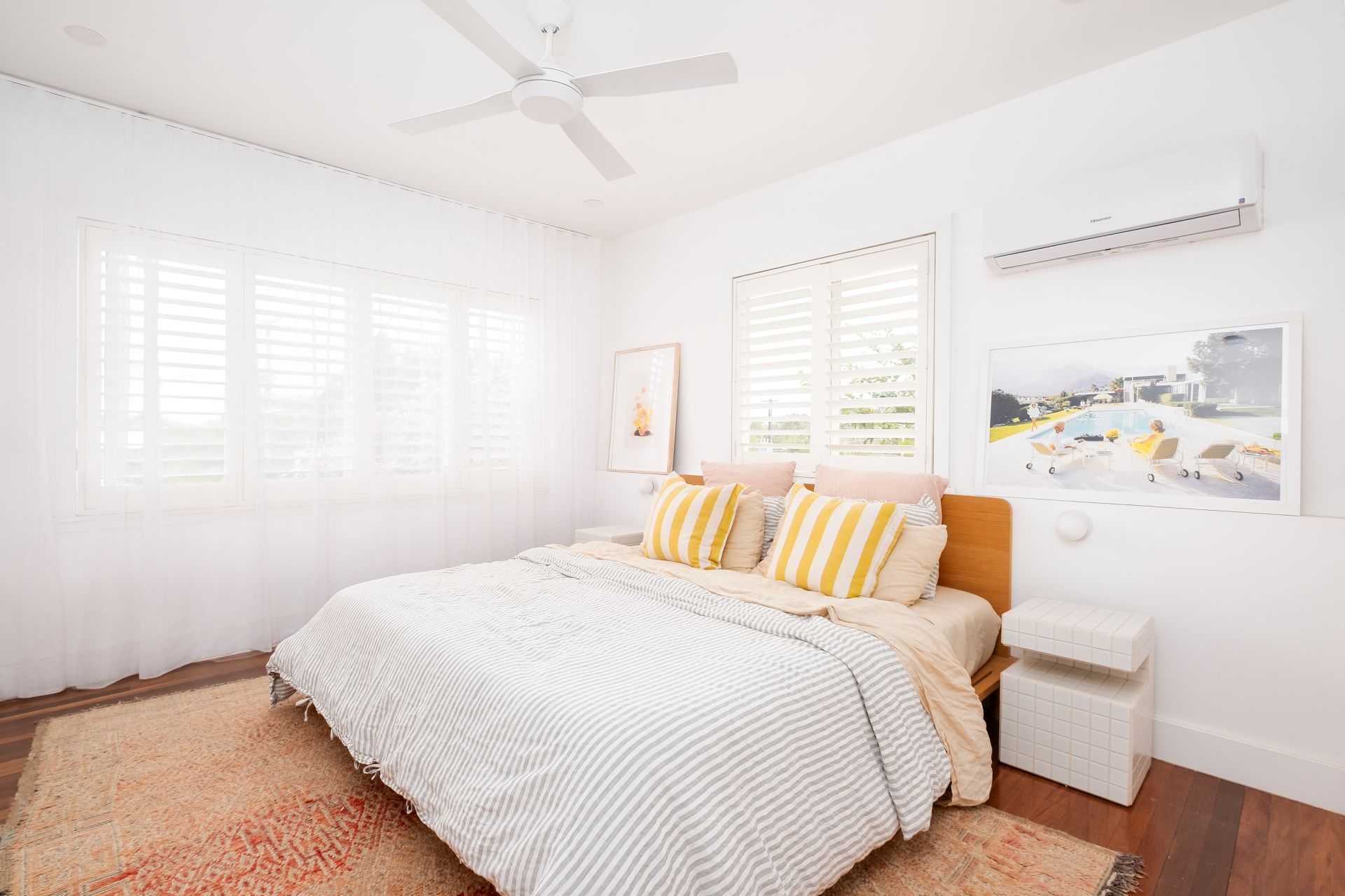 > Bedroom 2 features extra-high ceilings, rich timber flooring, split-system air-conditioning, ceiling fan, down lighting, built-in robes, casement windows with sheer curtains and plantation shutters.