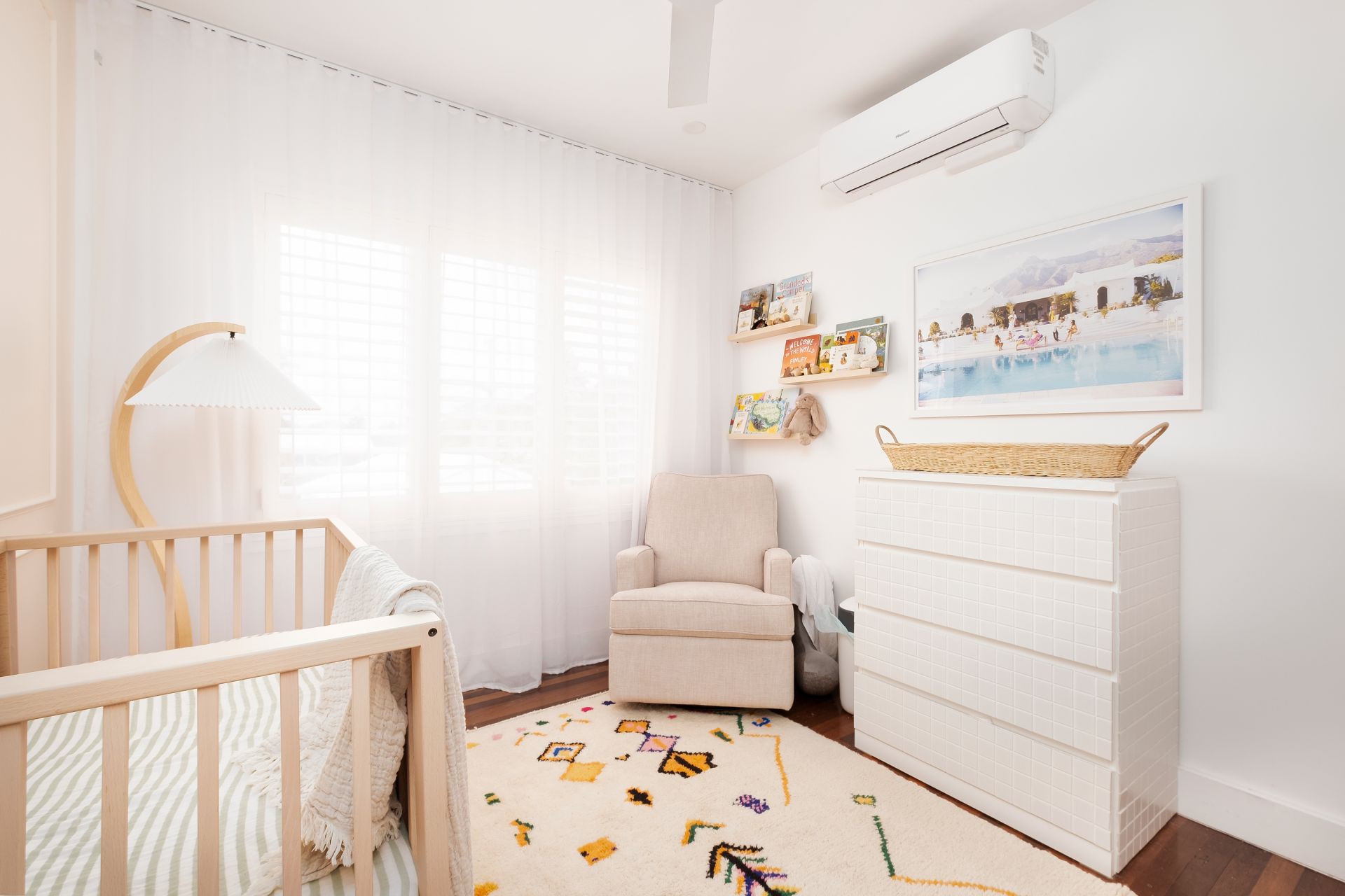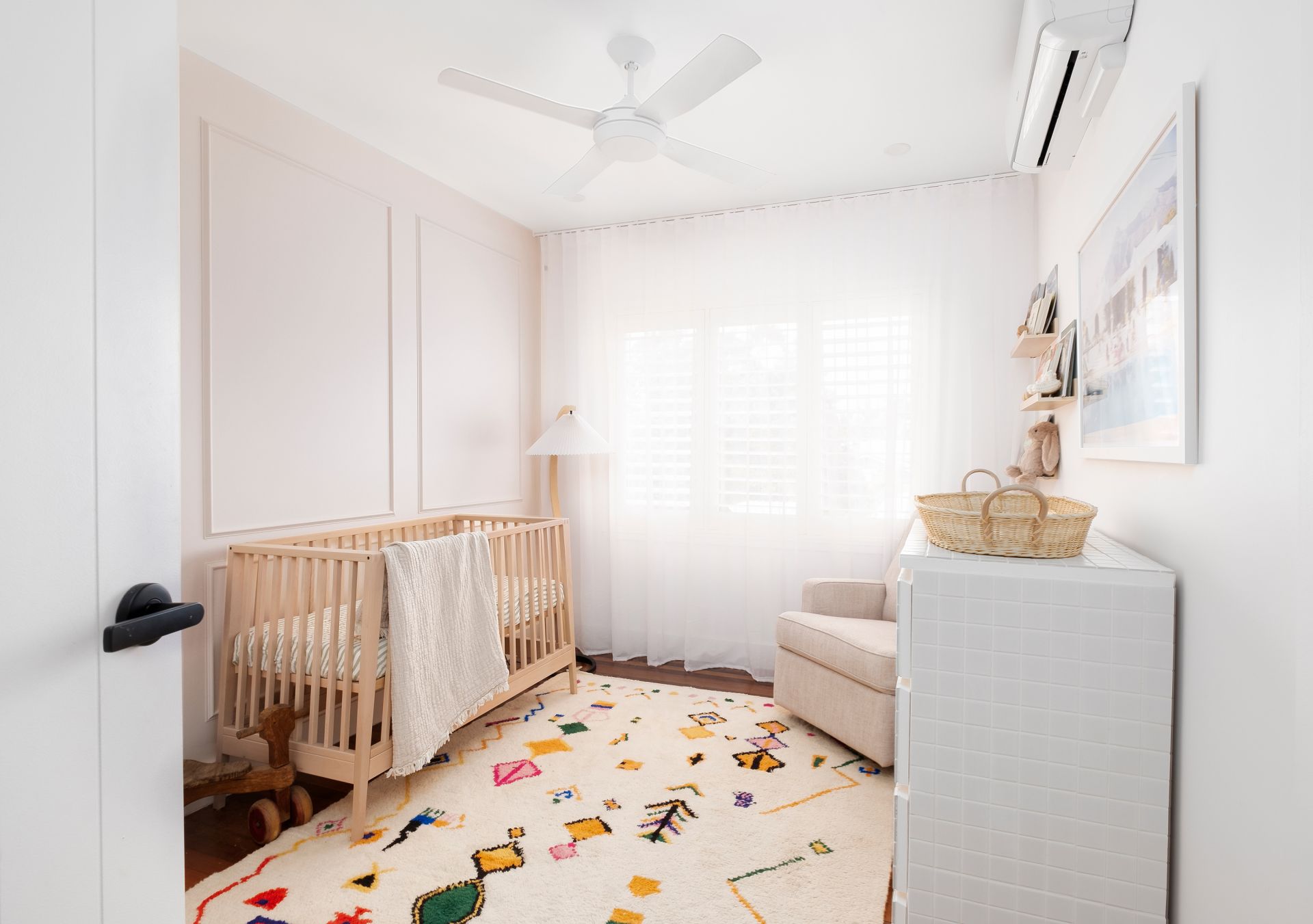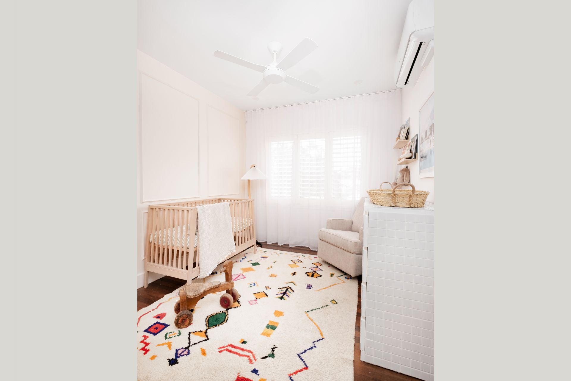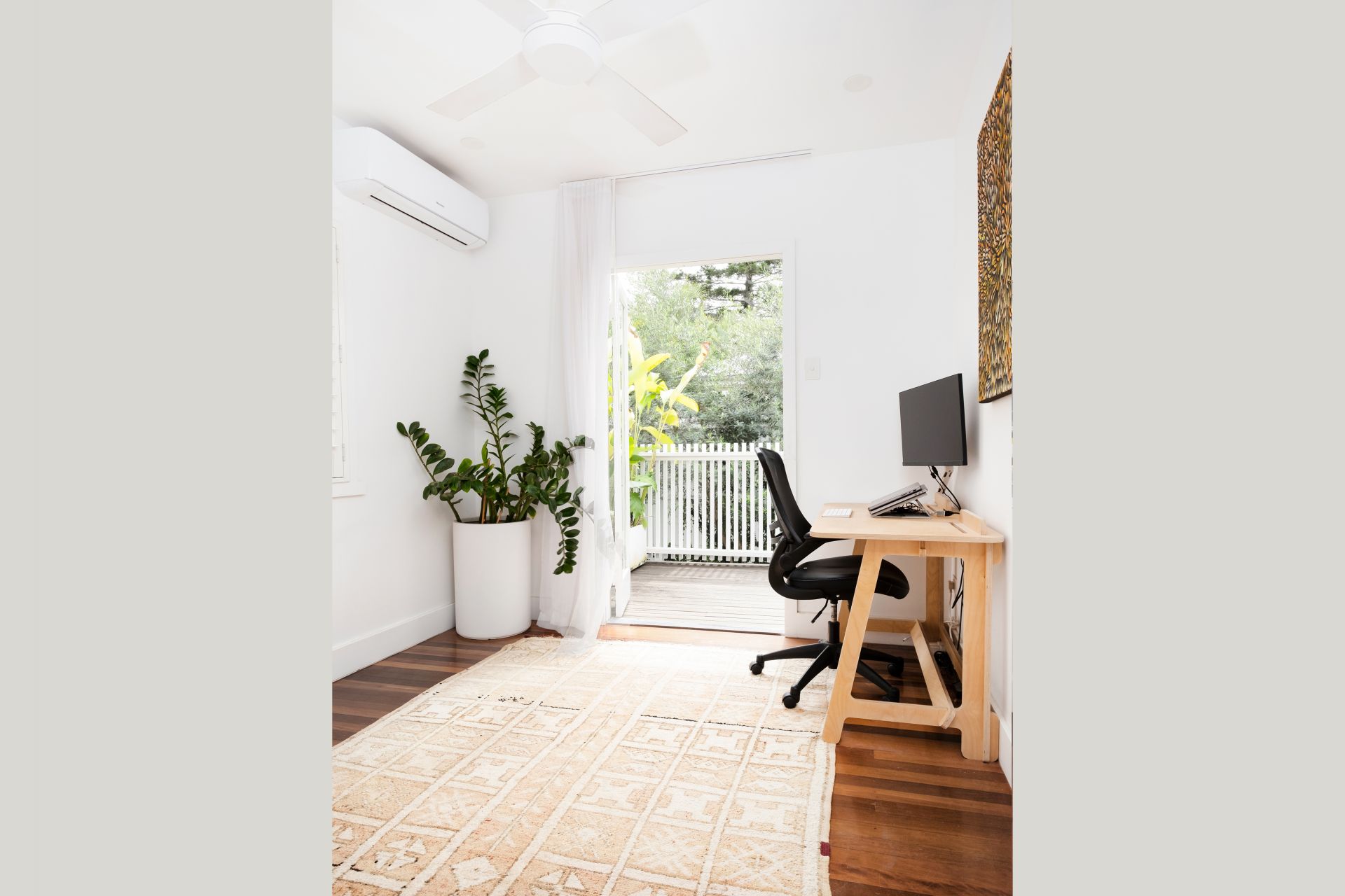 > Bedroom 2 features extra-high ceilings, rich timber flooring, split-system air-conditioning, ceiling fan, down lighting, built-in robes, casement windows with sheer curtains and plantation shutters.