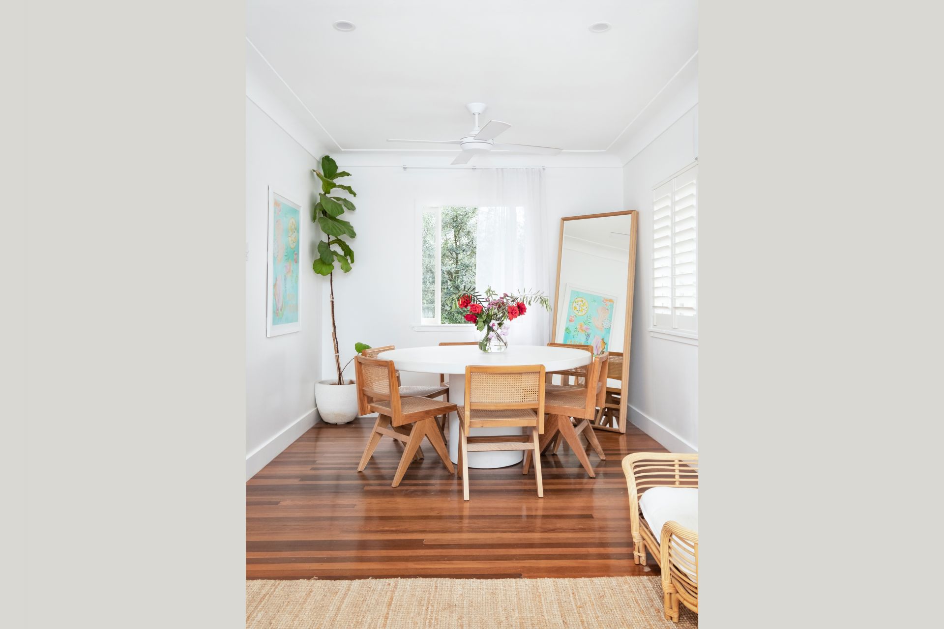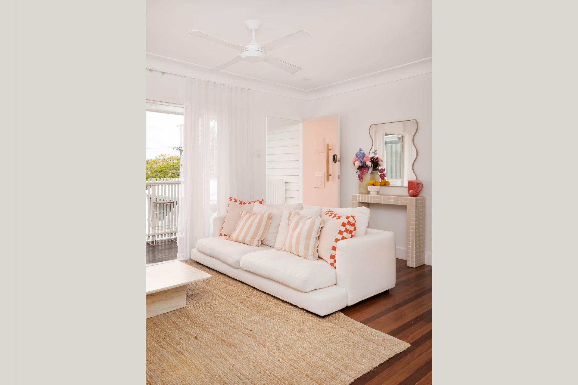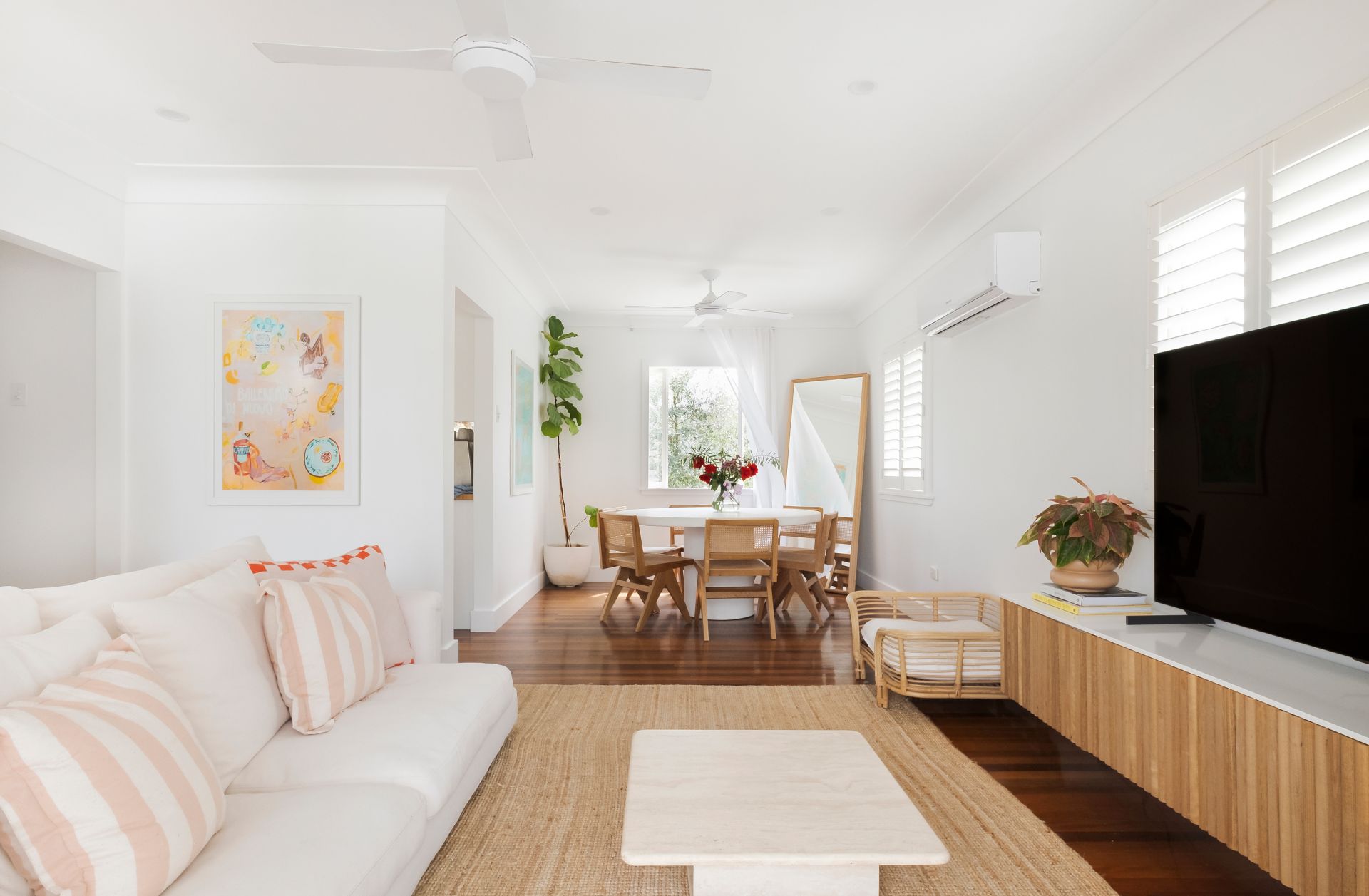 > The living area flows effortlessly to the kitchen/dining and through to the rear alfresco entertaining area. Featuring extra-high ceilings, rich timber flooring, down-lighting, dual ceiling fans, casement windows with a combination of curtains and plantation shutters, custom floating wall unit and with access to the front porch a seamless flow of living space.