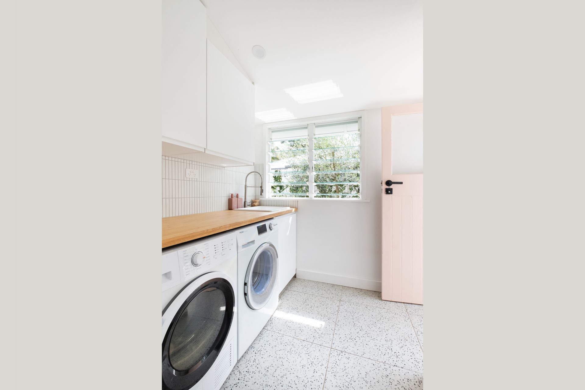 - Laundry located in the European butler pantry features pitched ceiling, tiled flooring, laminate cabinetry, timber bench top, custom finger tiled splashback, wash tub and external access.