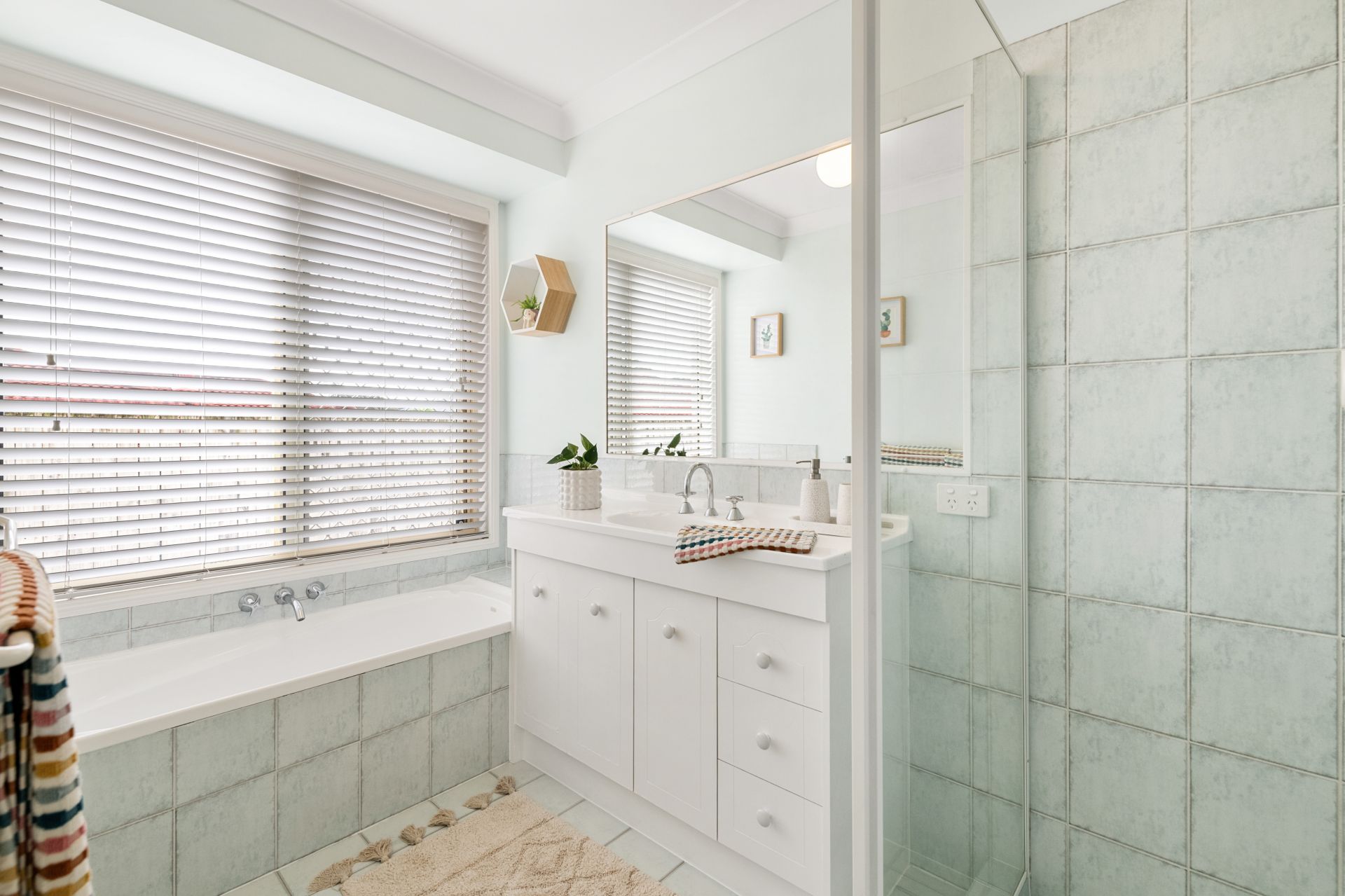 - Bathroom one is the home’s main bathroom and features tiled flooring, shower, bath, single vanity and separate toilet.