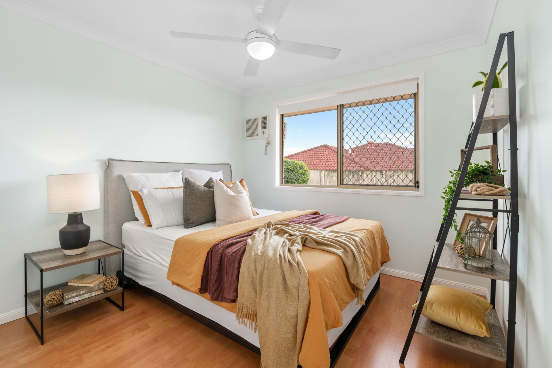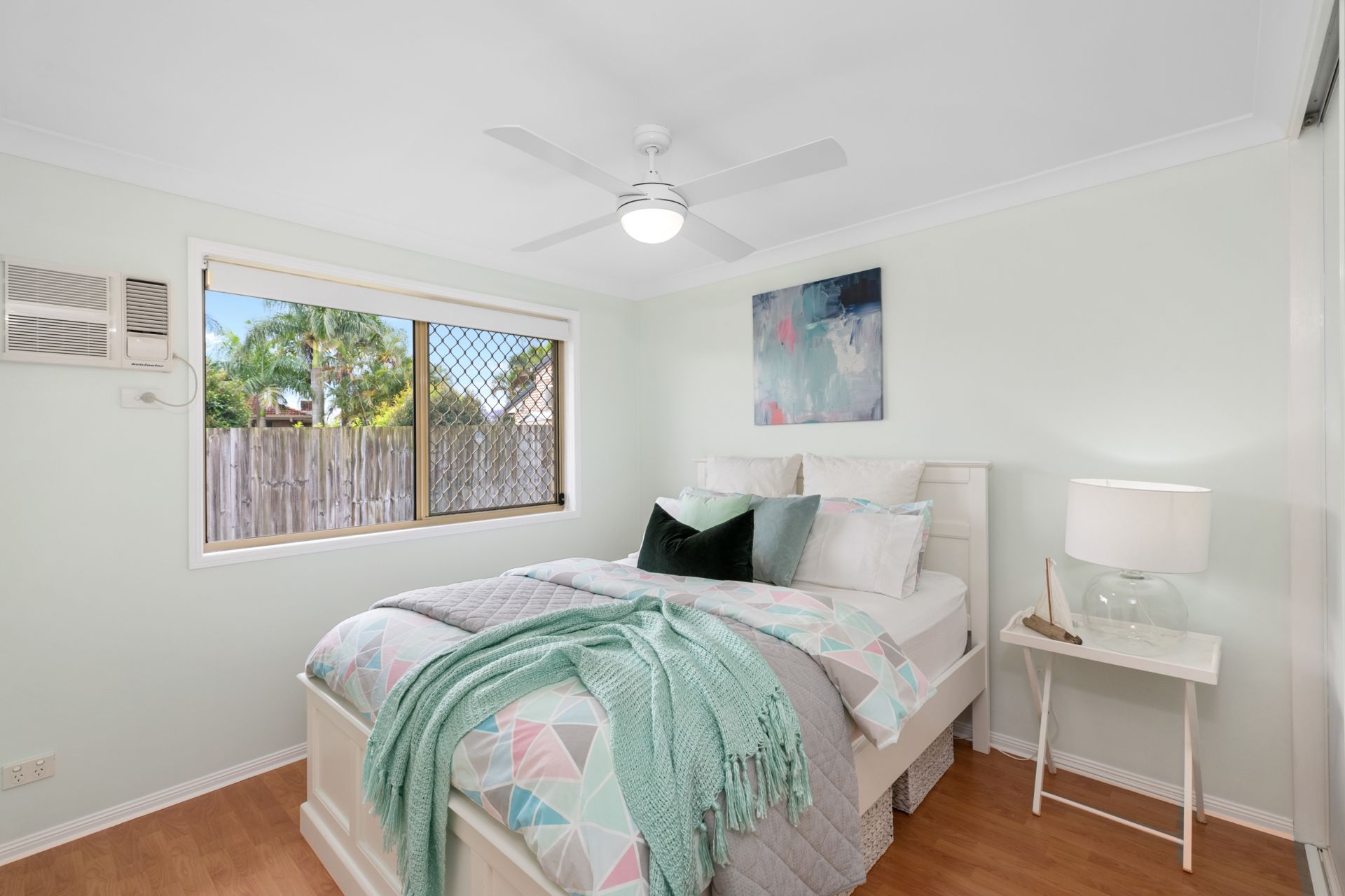 - Bedroom two features timber flooring, air-conditioning, ceiling fan, built-in-robe and roll-down blinds.