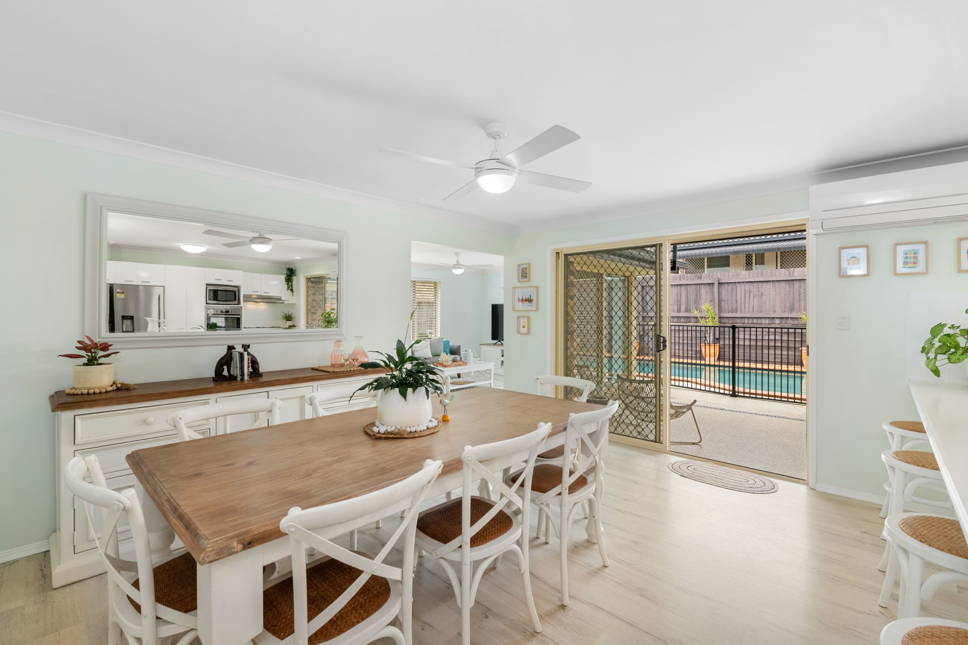 - Dining room shares a great open plan with the home’s kitchen and features timber-look flooring, split system air-conditioning, ceiling fan with access to the covered entertainment area.