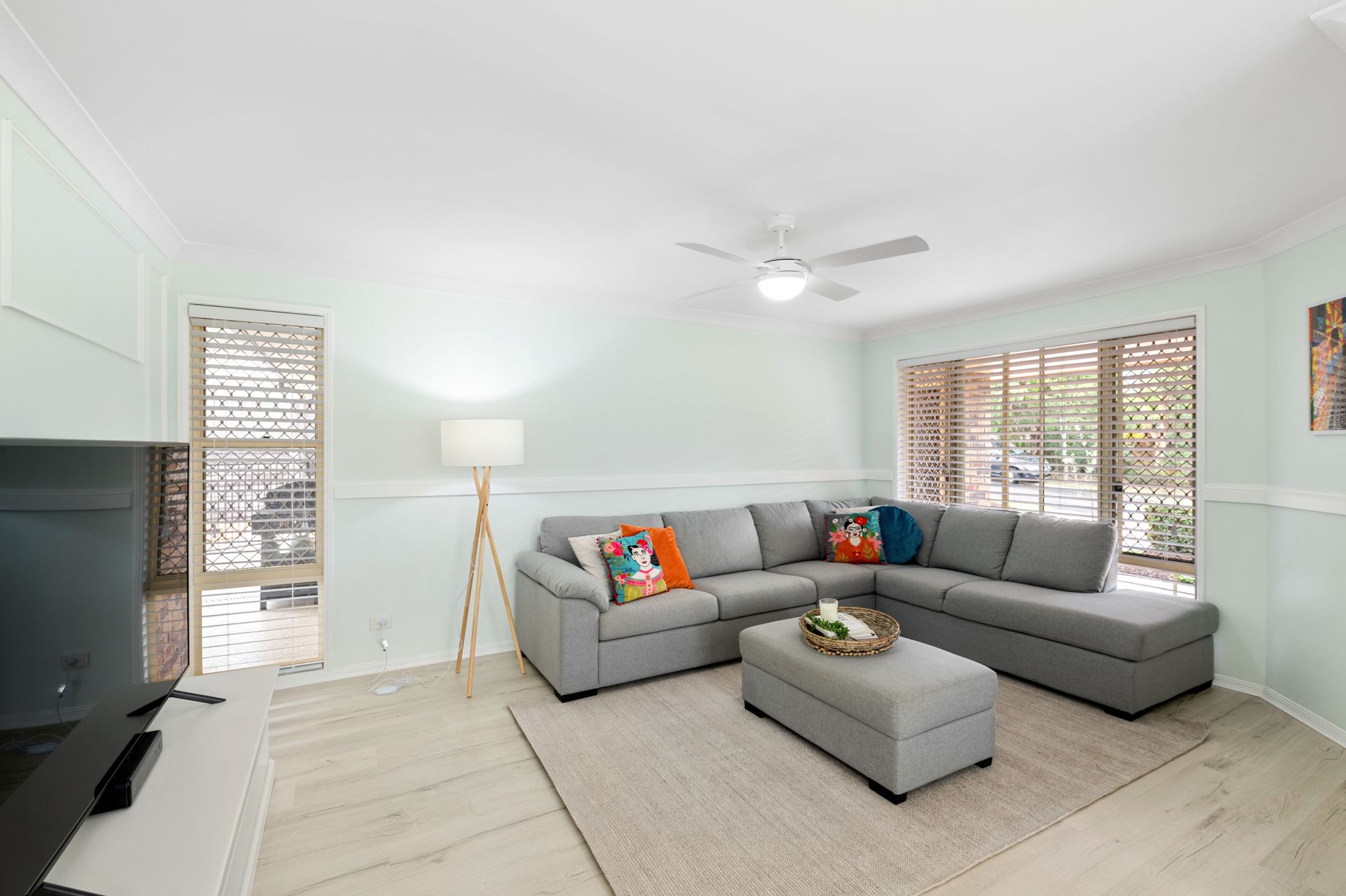 - Formal lounge is a good size living space located at the front of the home and features timber-look flooring and ceiling fan.
