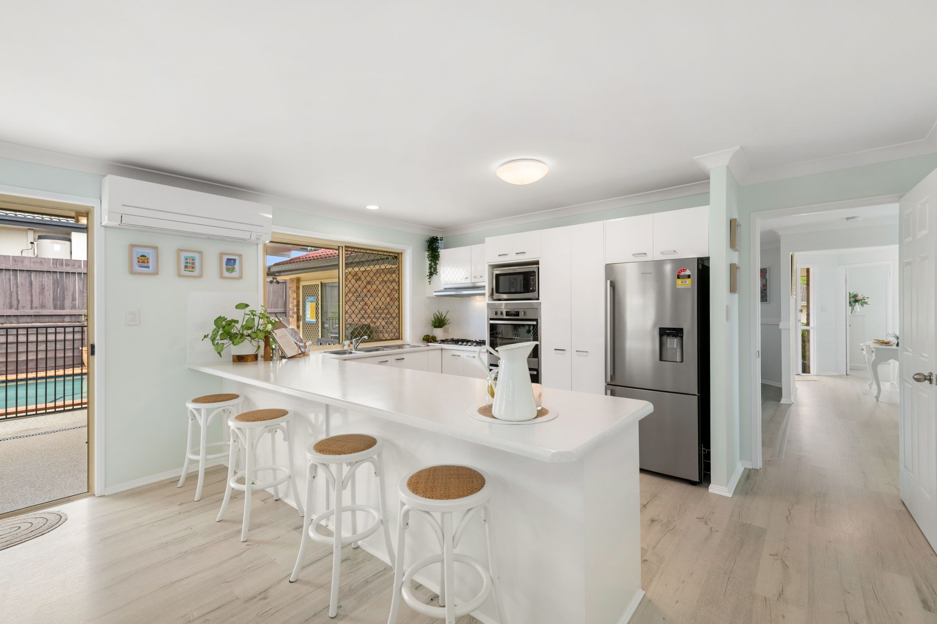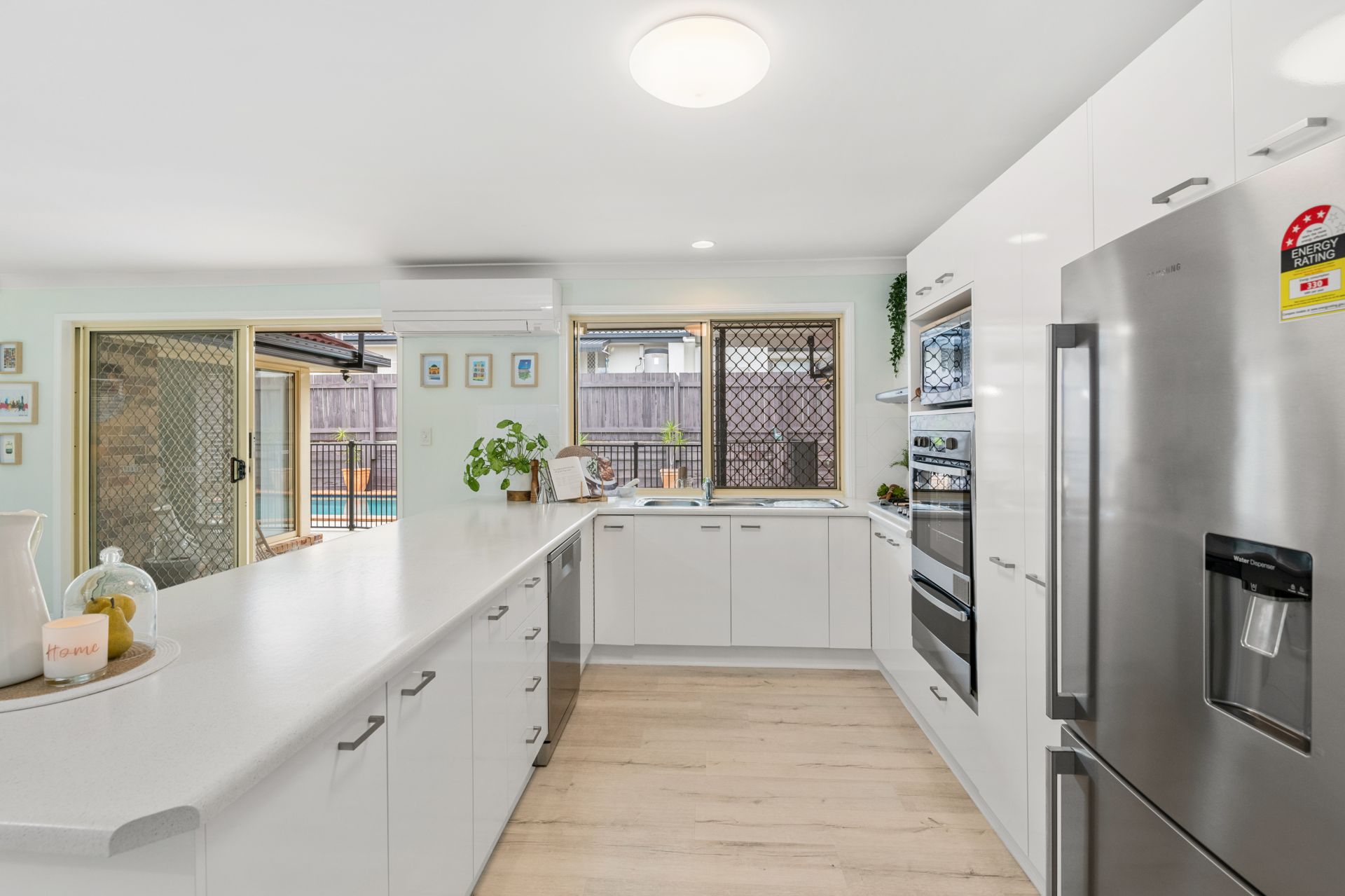 The home’s large, open kitchen overlooks the outdoor entertainment area and in-ground swimming pool while sharing a great open plan with the dining area.