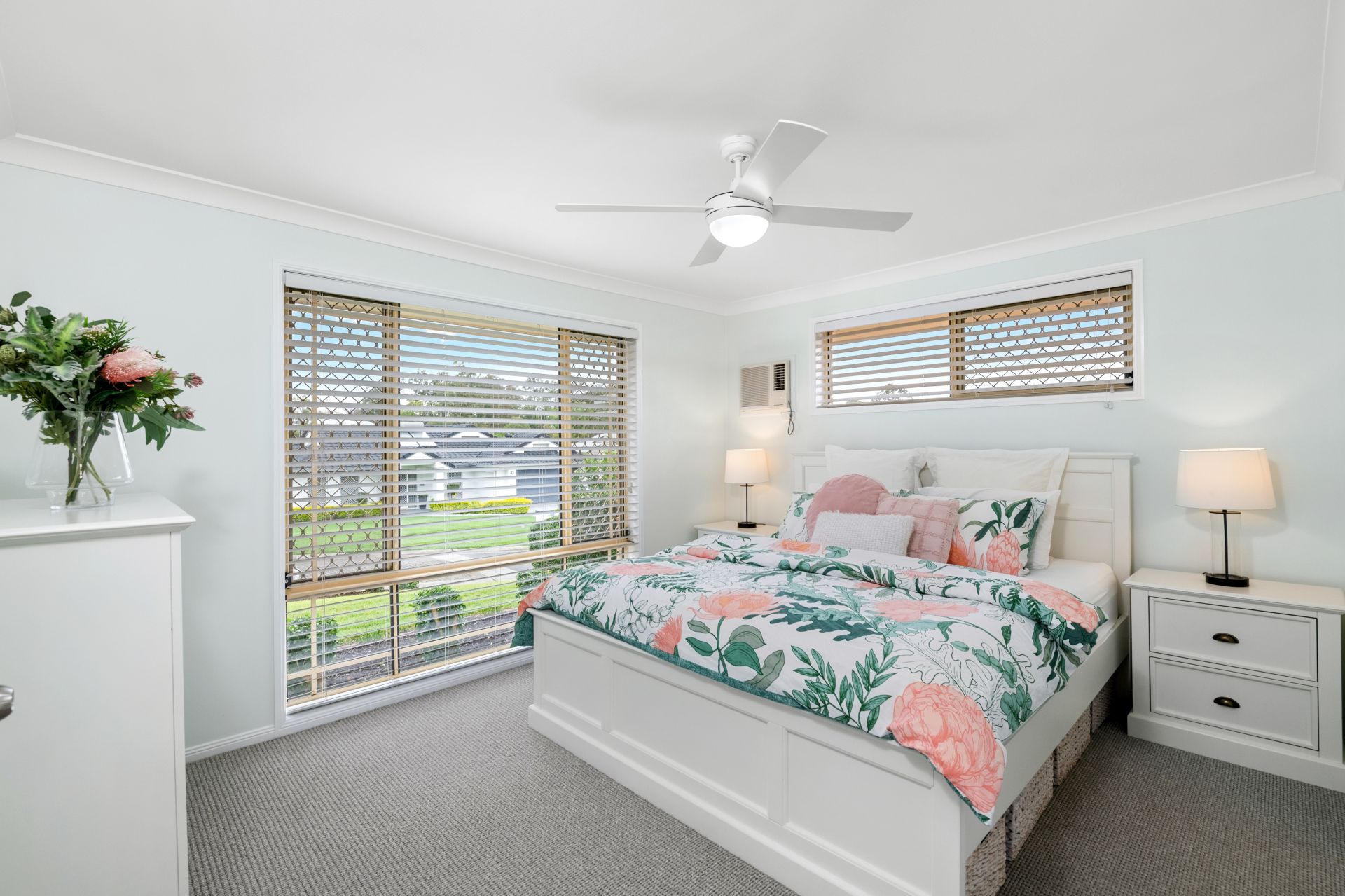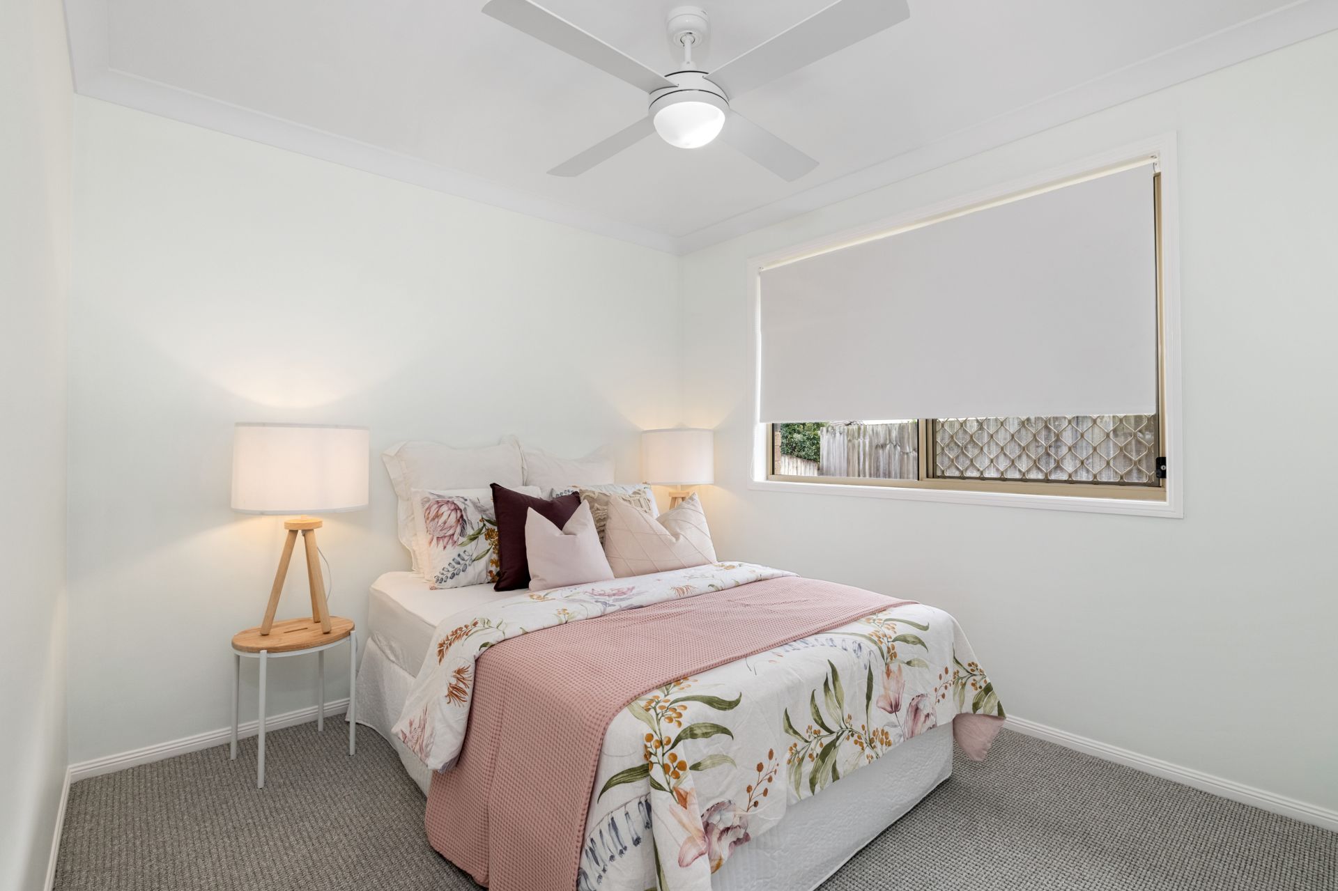 - Bedroom three features carpeted flooring, ceiling fan, built-in-robe and roll-down blinds.