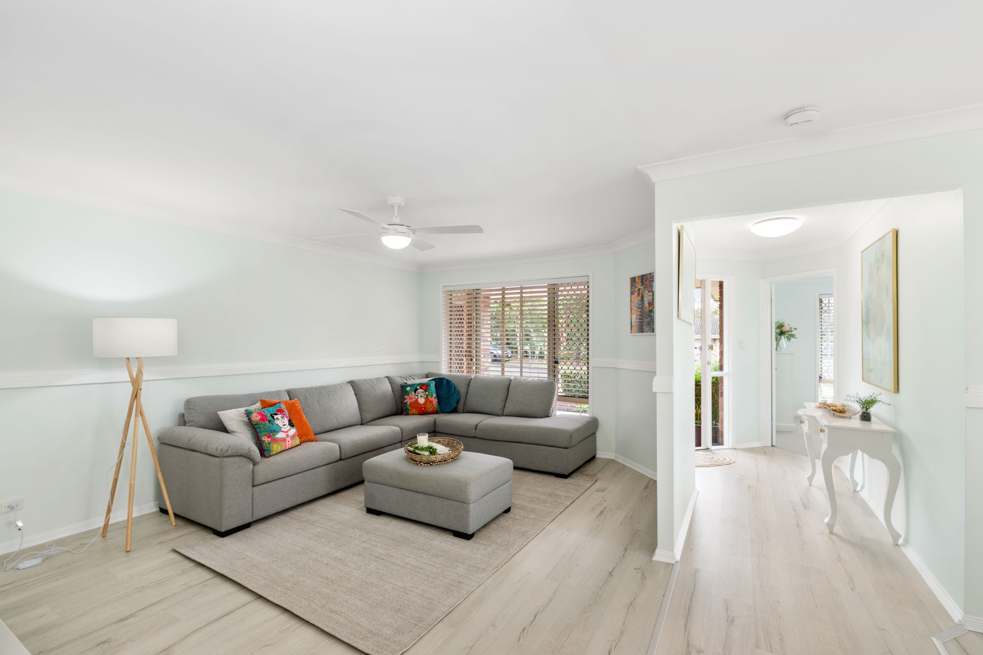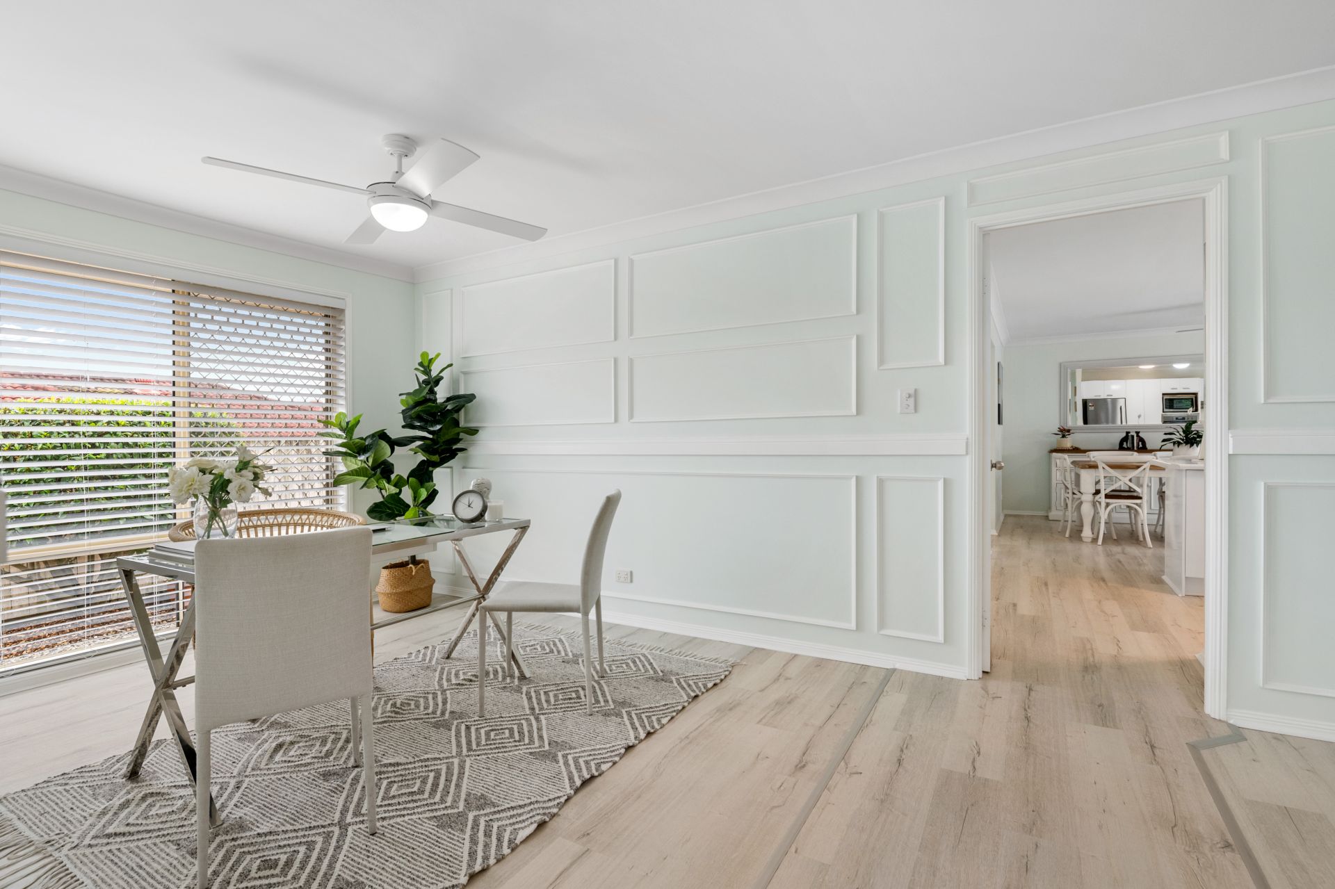 - Study sits across from the home’s formal lounge in a light, open area and features timber-look flooring and ceiling fan.