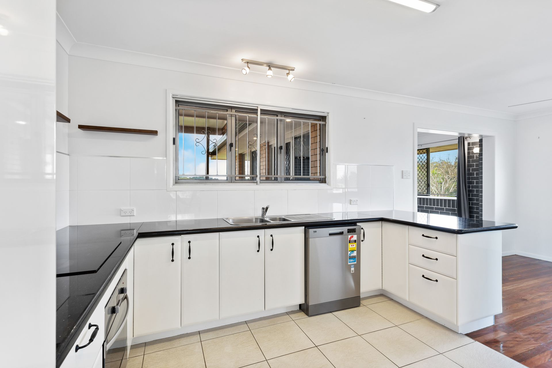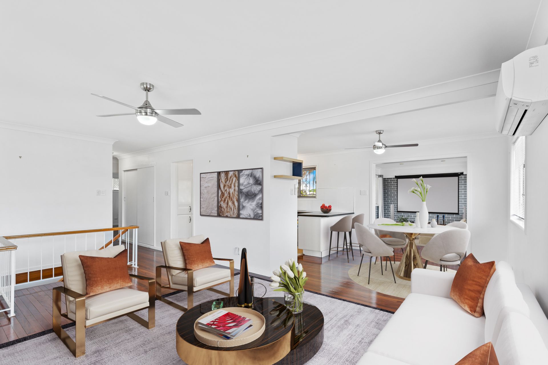 - Lounge and dining rooms share a large, combined space beside the home's kitchen and feature polished flooring, new split system air-conditioning, new ceiling fans and access to the front balcony.