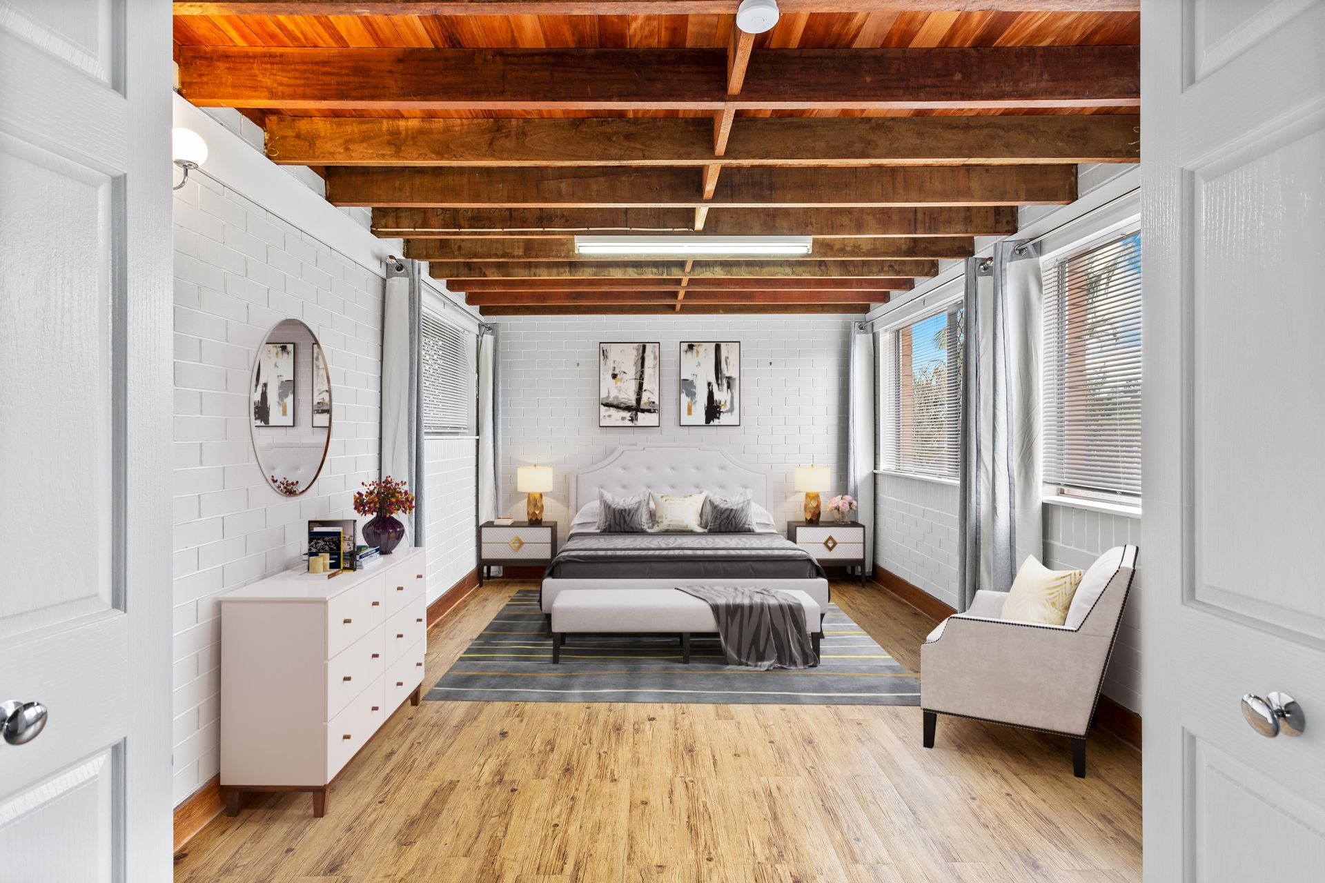 - Multi-purpose room one is located downstairs. Being just shy of legal height, this large room is currently utilised as a fourth bedroom and features new timber-look flooring and double brick.
