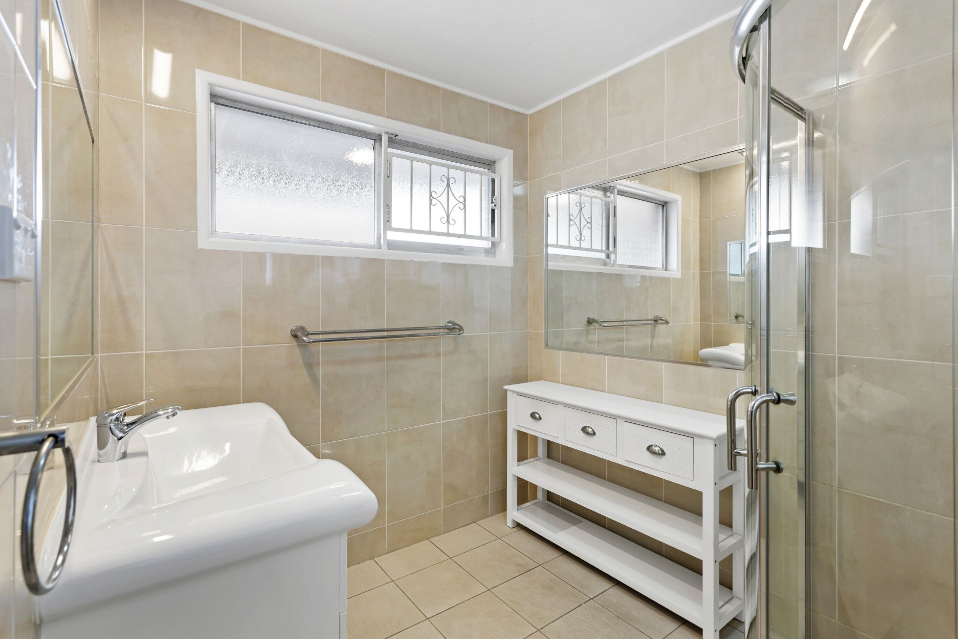 - Bathroom one is the home's main bathroom and features tiled flooring, shower, single vanity, floor-to-ceiling tiles and separate toilet.