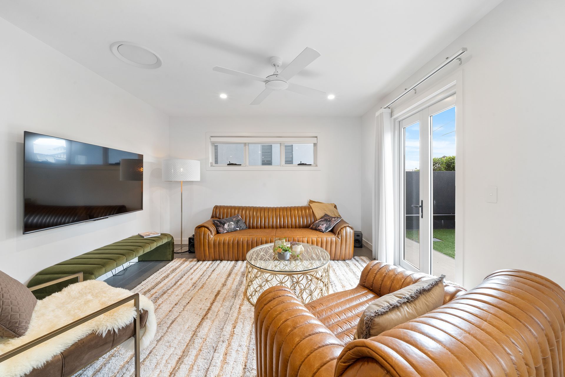 > Located on the lower level of the home is the rumpus room featuring down-lighting, carpet flooring, sliding windows and sliding doors opening to the side courtyard & access to the garage