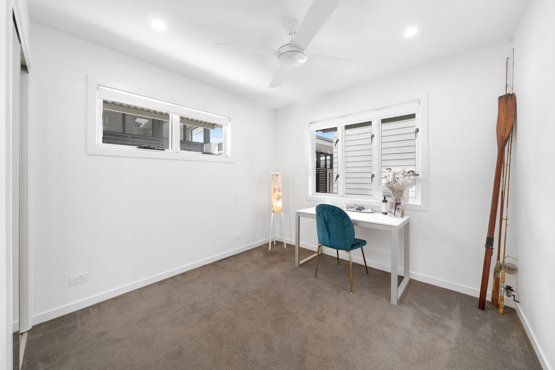 > Bedroom 5 located on the entry level features built-in-robe, carpet flooring, ceiling fan, casement and awning windows, roller blinds and down lighting