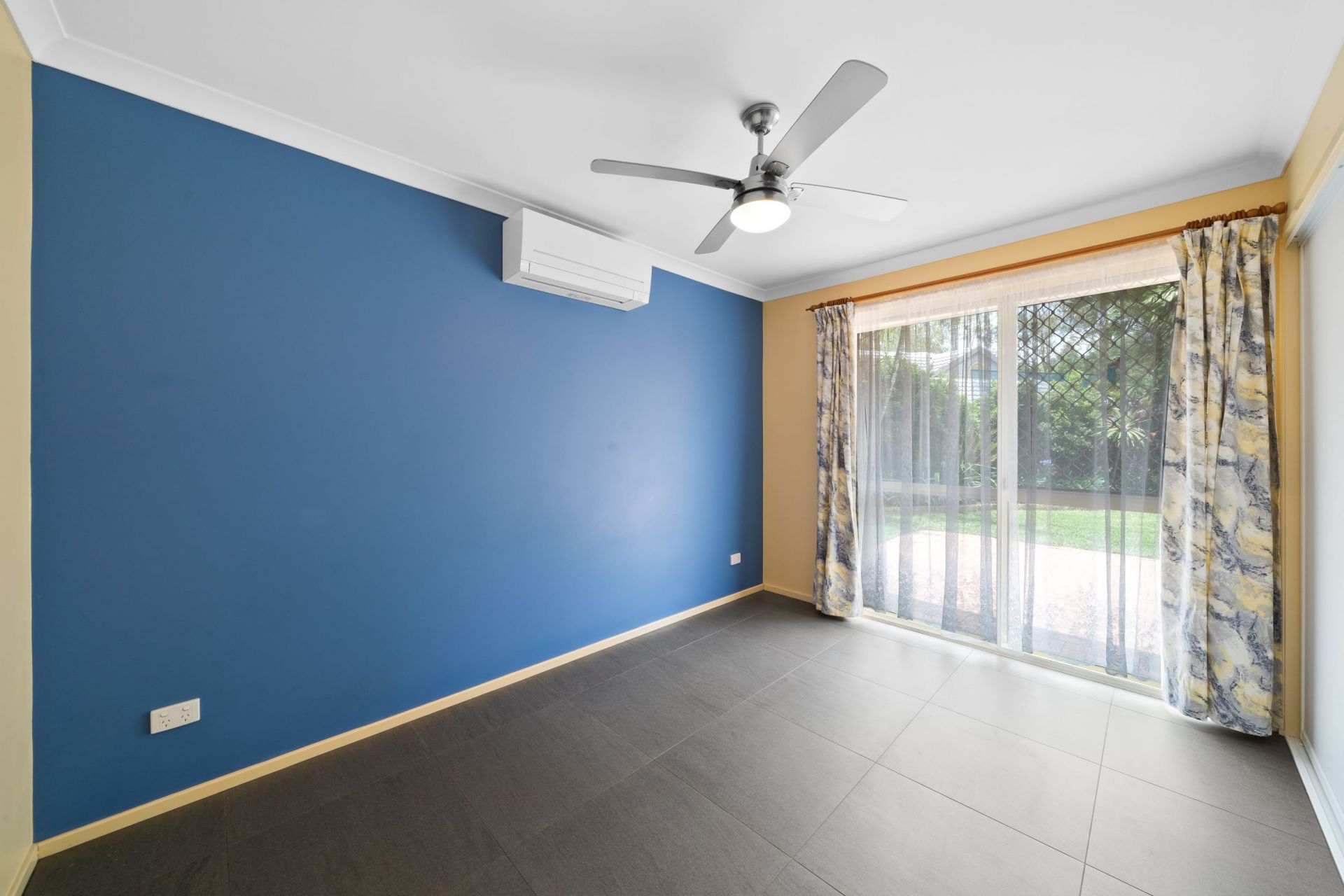 > Bedroom 4 features tile flooring, Mitsubishi split system air-conditioning, ceiling fan with in-built lighting, and sliding double glazed windows with security screens and roller blind.