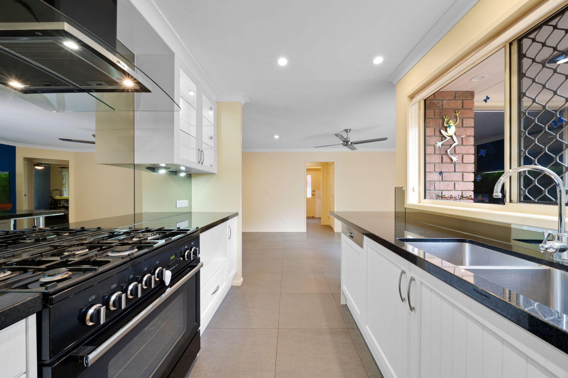 > Custom black and glass rangehood matched to cooktop