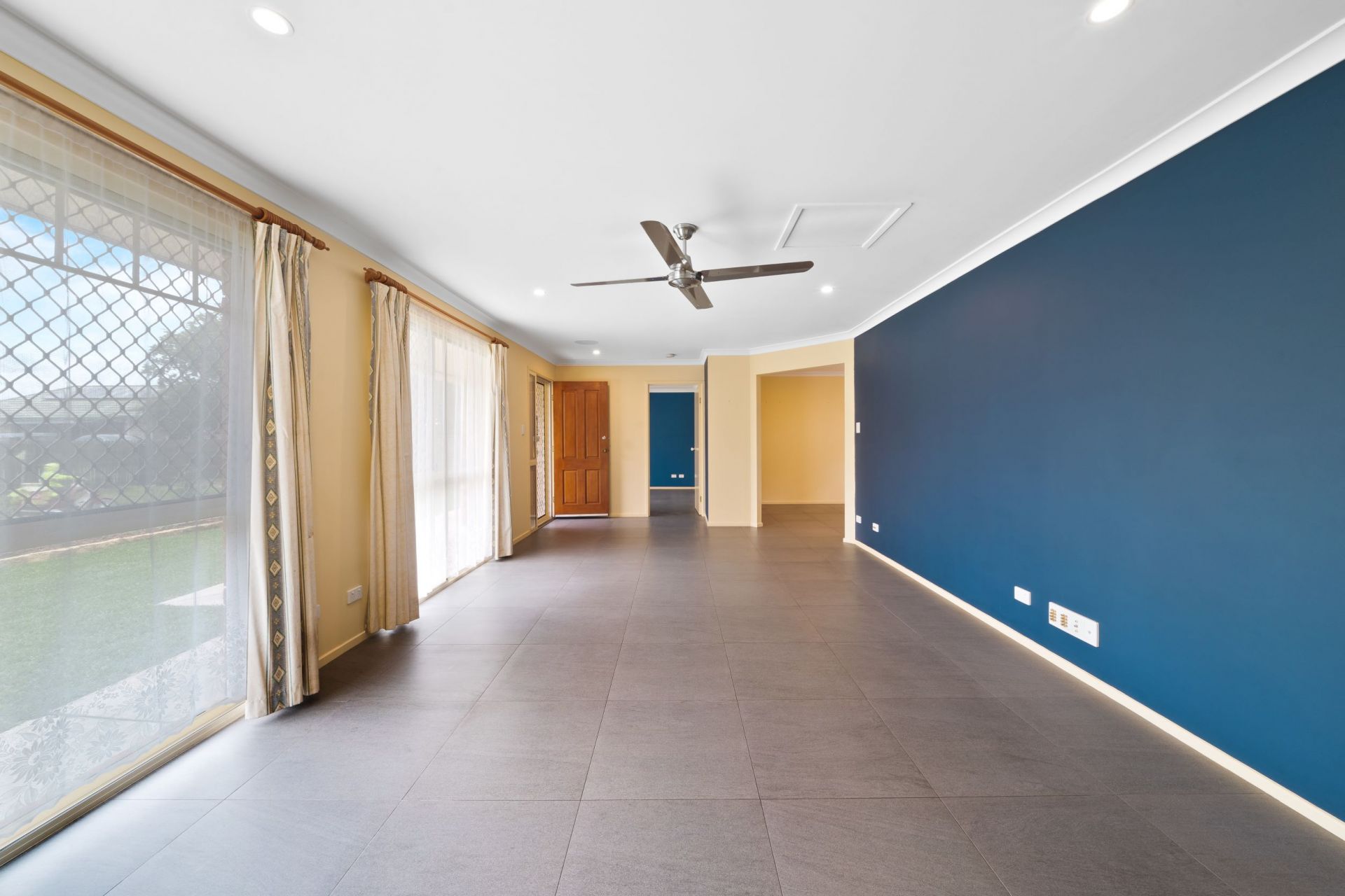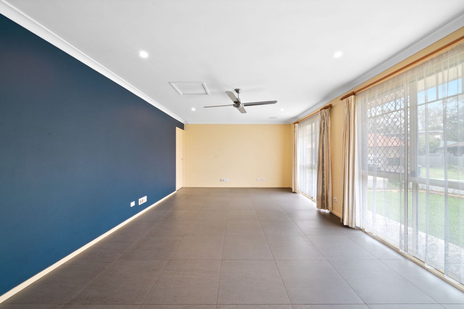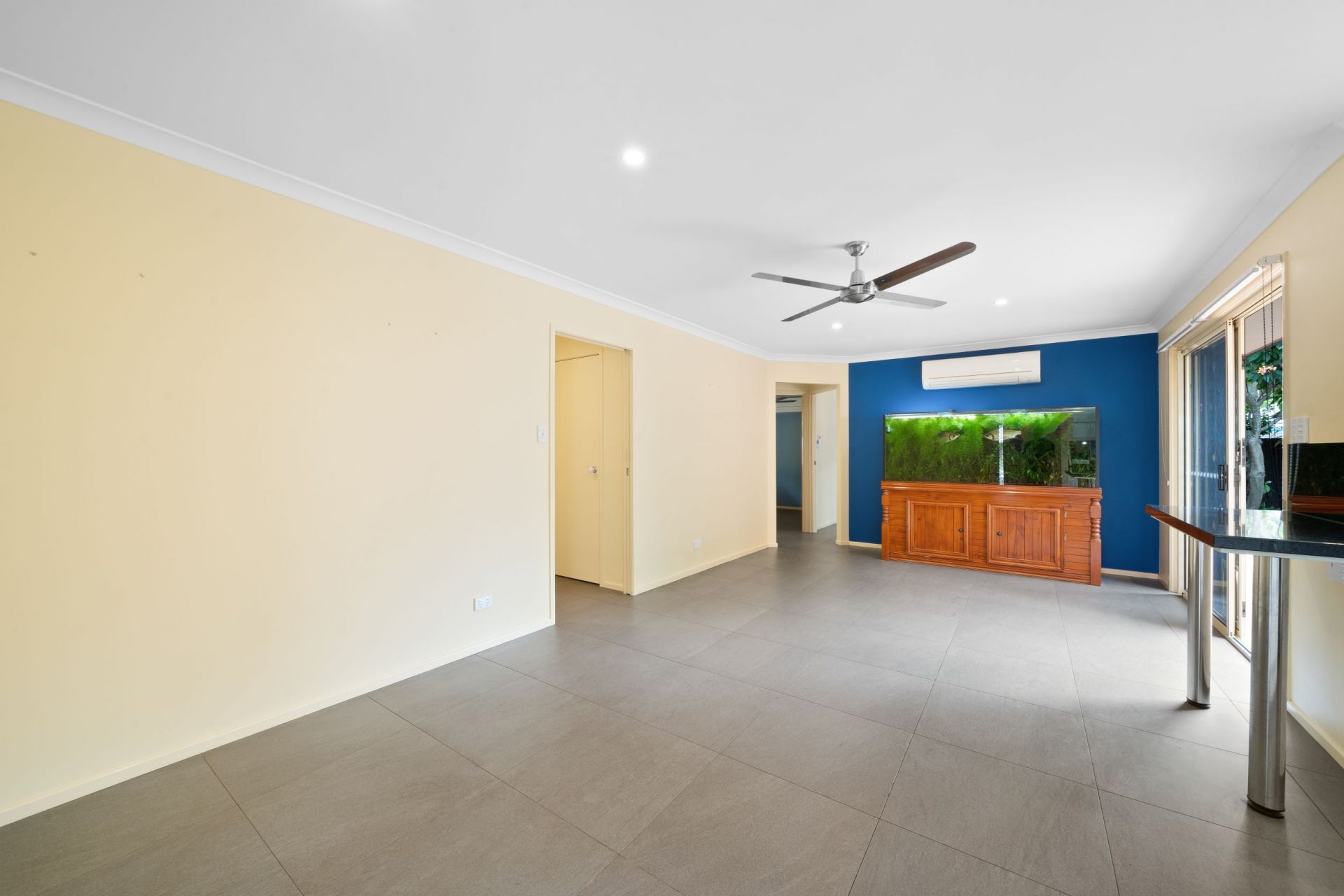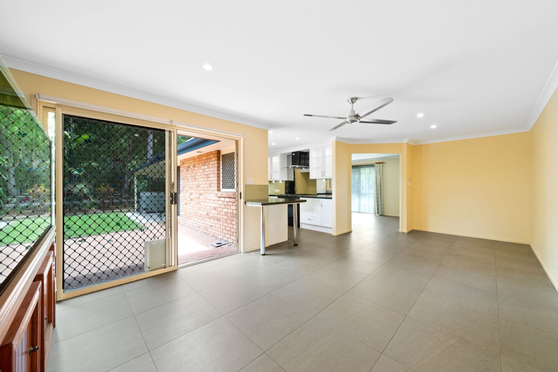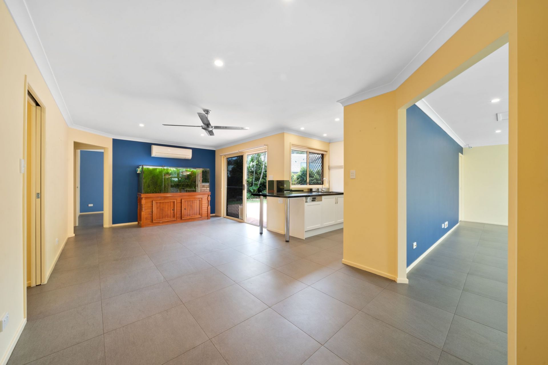 > The main family/dining area located in the heart of the home offers Mitsubishi split system air-conditioning, ceiling fan, down lighting, tile flooring, roller blinds and sliding door with security screen giving you access the yard.