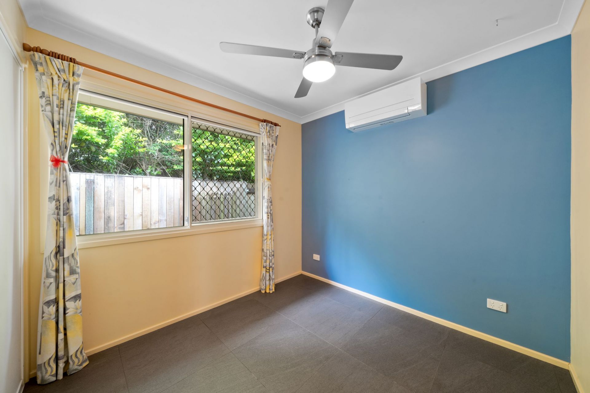 > Bedrooms 2 and 3 feature tile flooring, Mitsubishi split system air-conditioning, ceiling fan with in-built lighting, and sliding double glazed windows with security screens and combination of roller blinds and curtains.