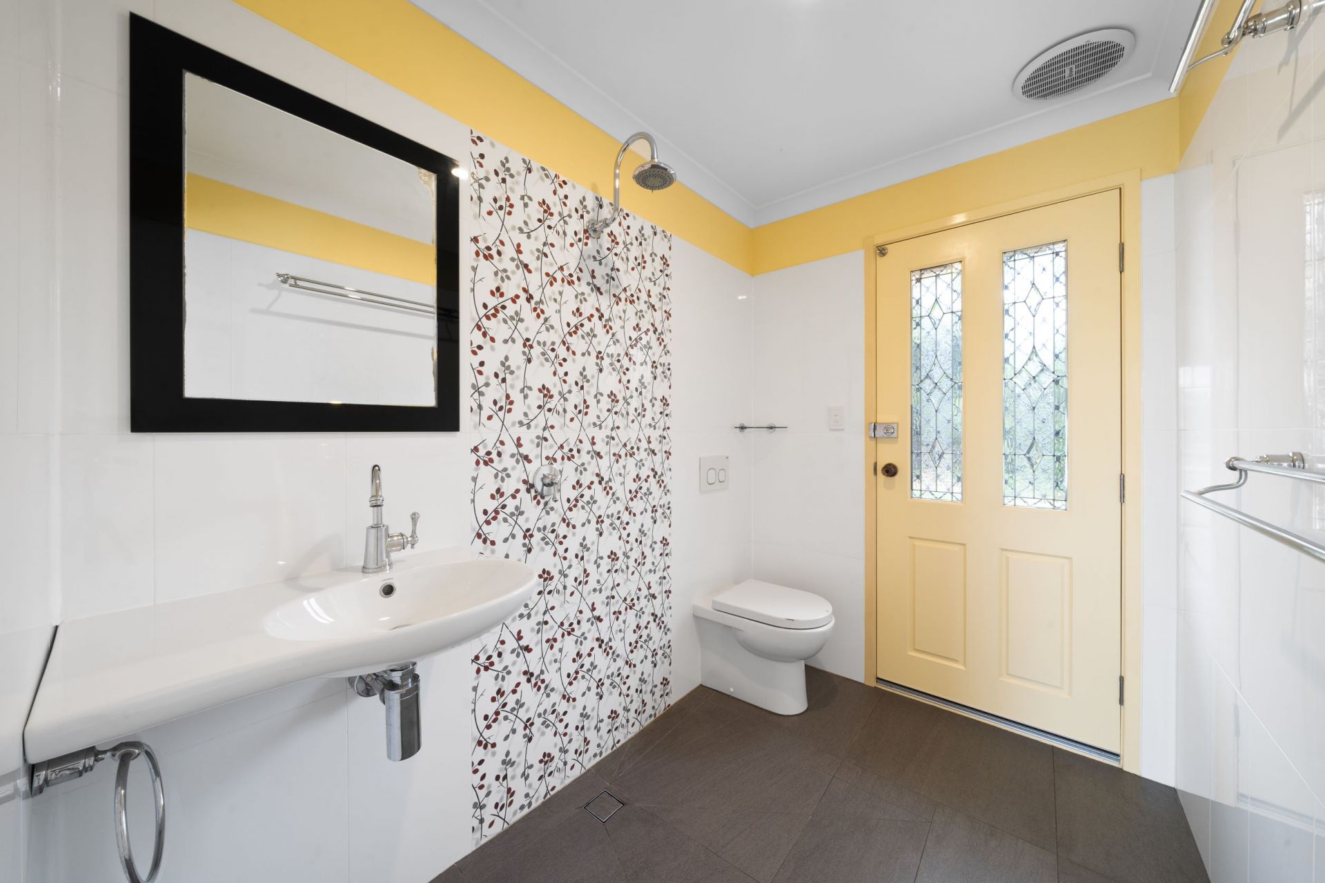 > Bathroom 2 located just off the main living features a frameless shower, floating basin, vanity mirror, toilet, dual towel racks, hand towel rail, extractor, and access to the back yard.