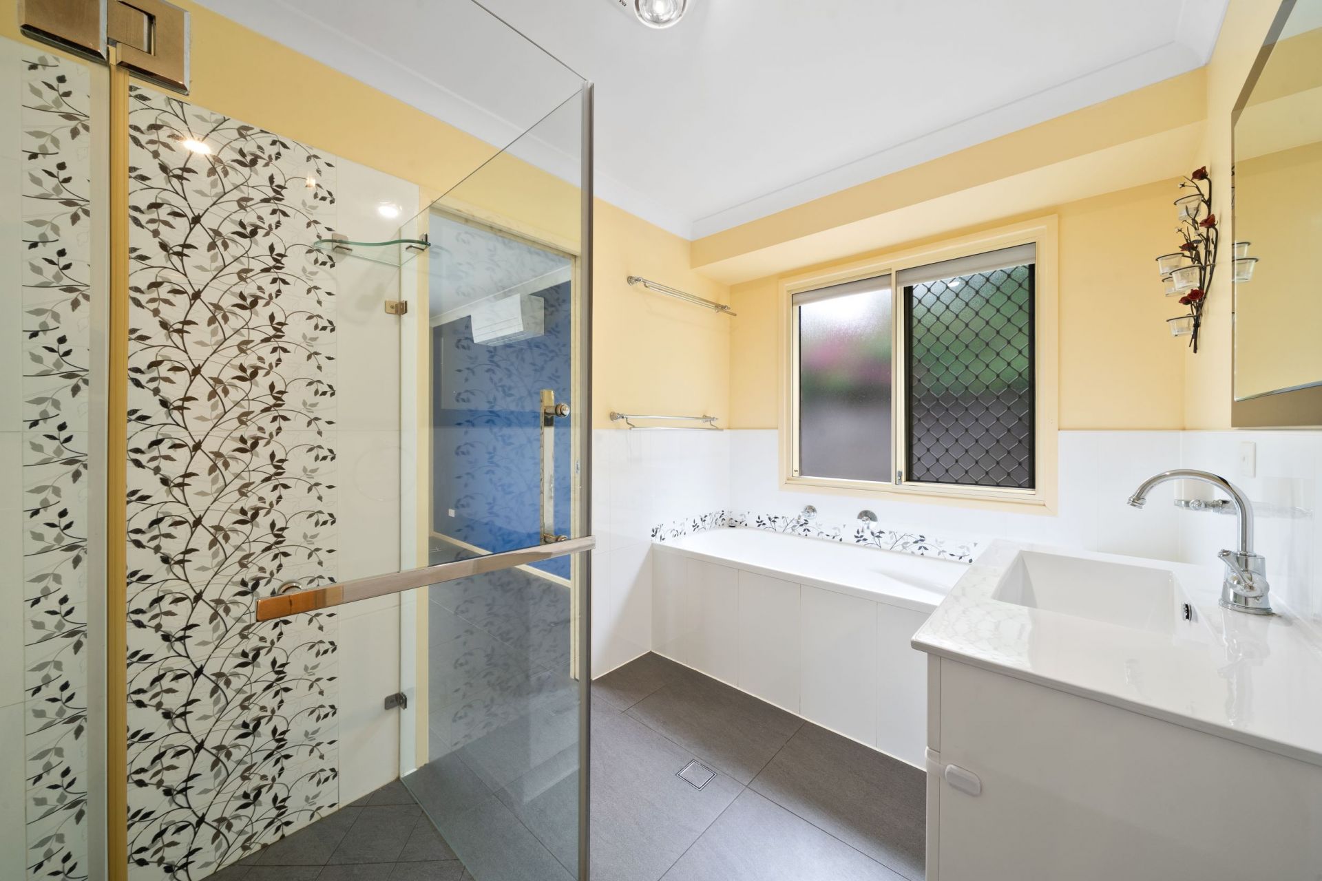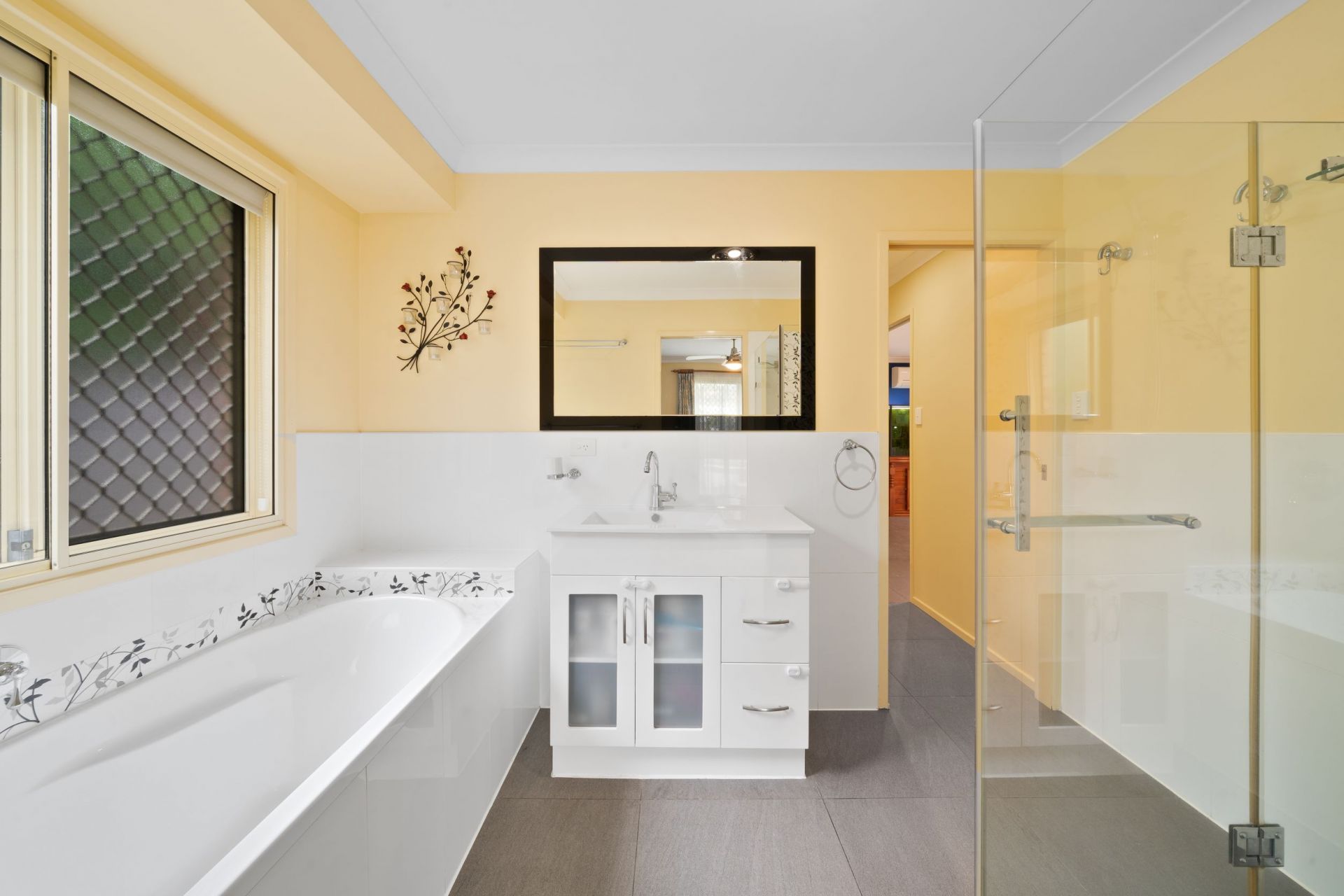 > The main/2-way bathroom features a shower with detachable showerhead, separate bath, single basin vanity with plenty of storage, tile splashback, tile flooring, large vanity mirror, hand towel rail, towel rails, light/extractor combo, sliding double glazed windows with security grilles, roller blinds and separate toilet.