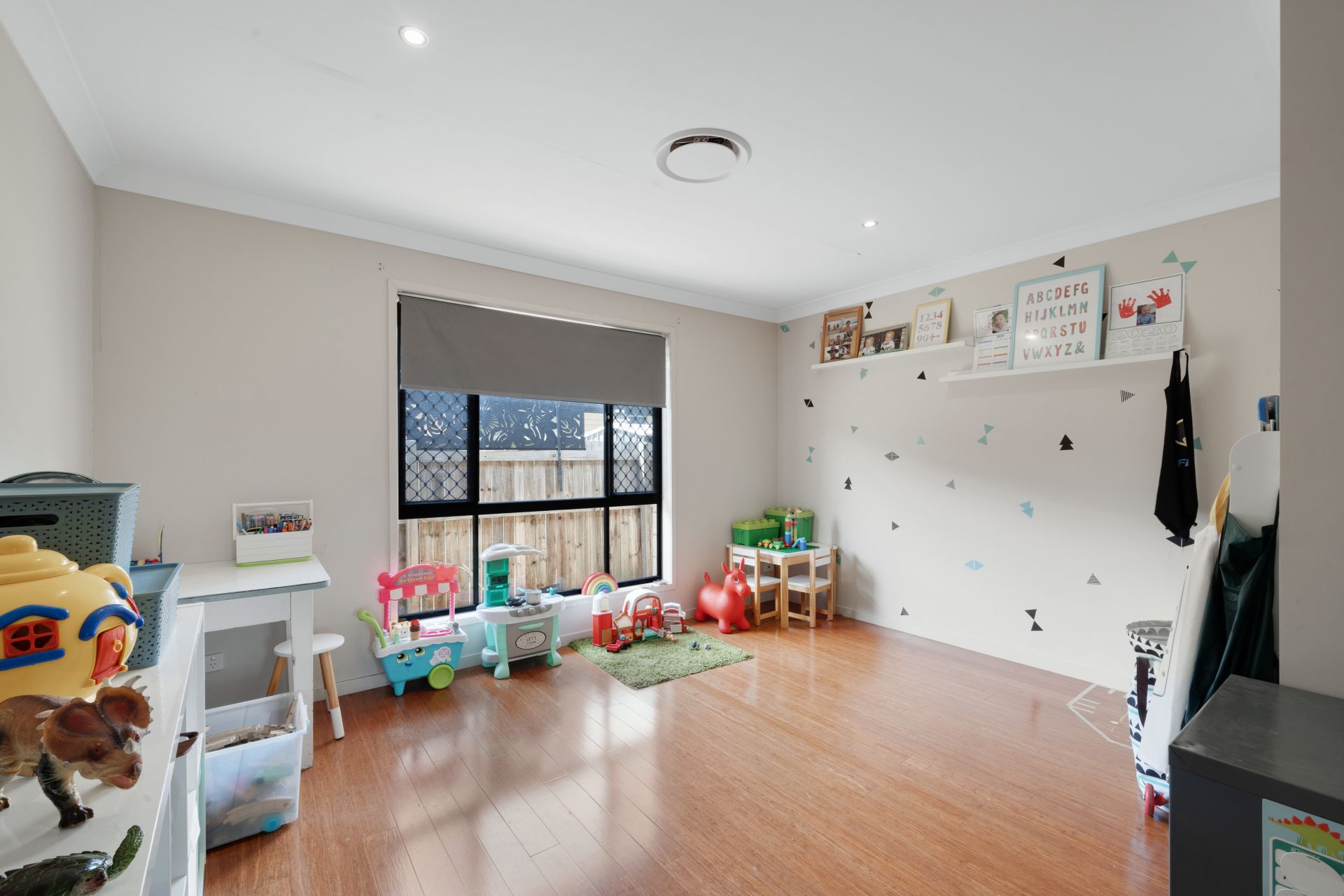 > Located in the middle of the home is the second living area featuring Dakin ducted air-conditioning, bamboo wood flooring, down lighting, modern traditional sliding windows with roller blind, security + fly screens and is the perfect place for teenagers to enjoy their own space or as an informal/formal living area.