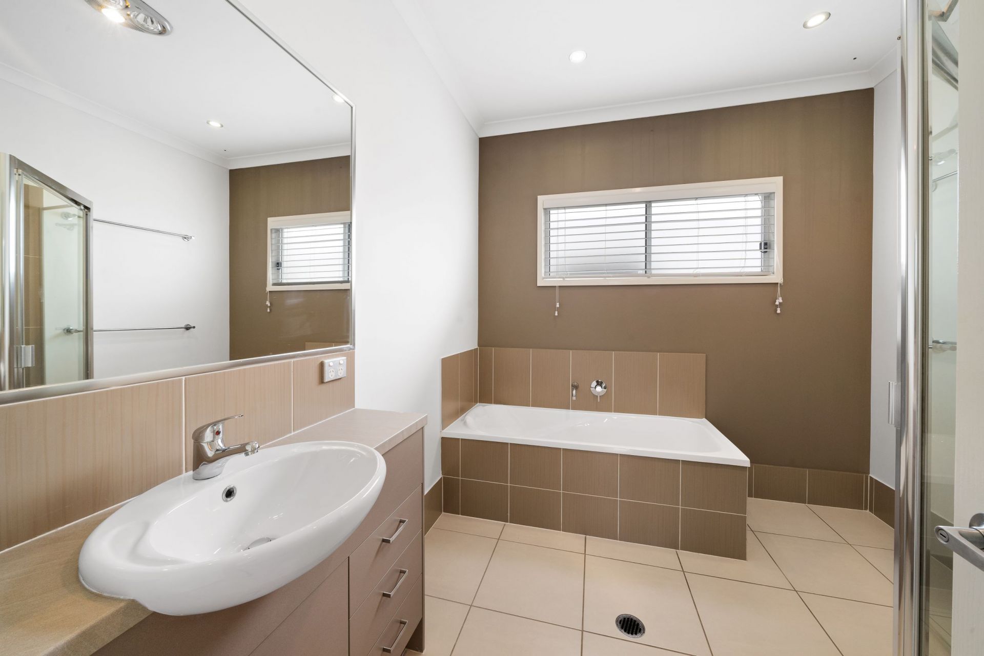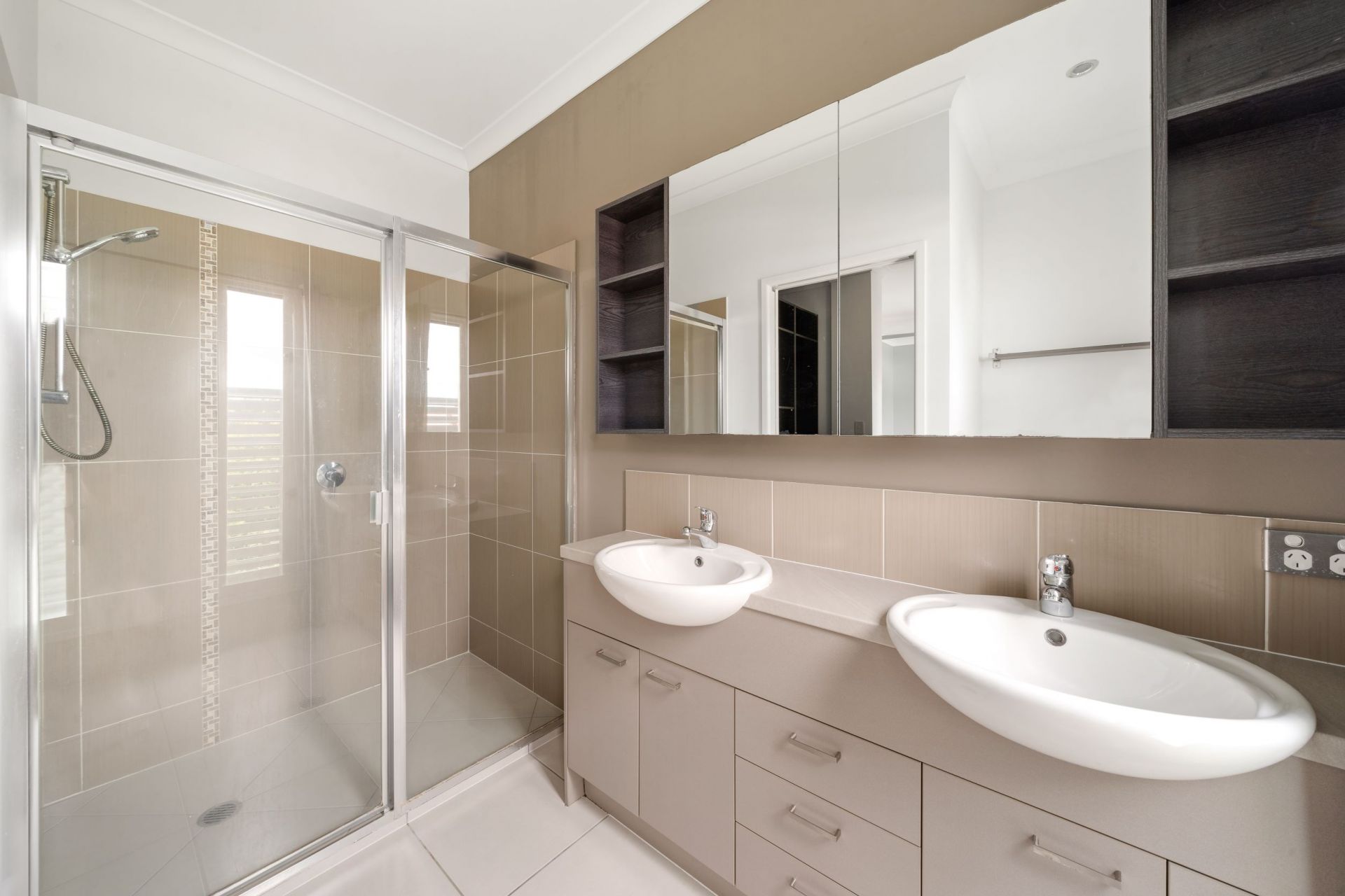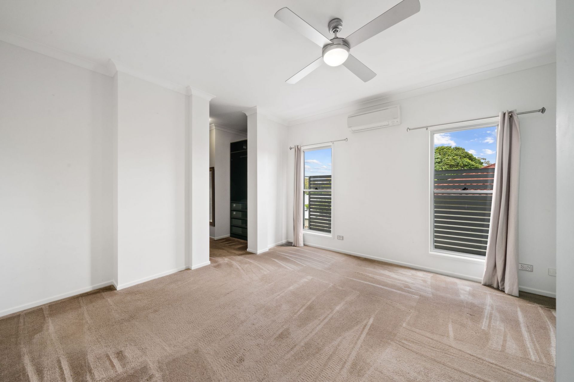 The air-conditioned main bedroom offers a walk-in wardrobe with custom shelving as well as an ensuite (who doesn't love a double vanity?).