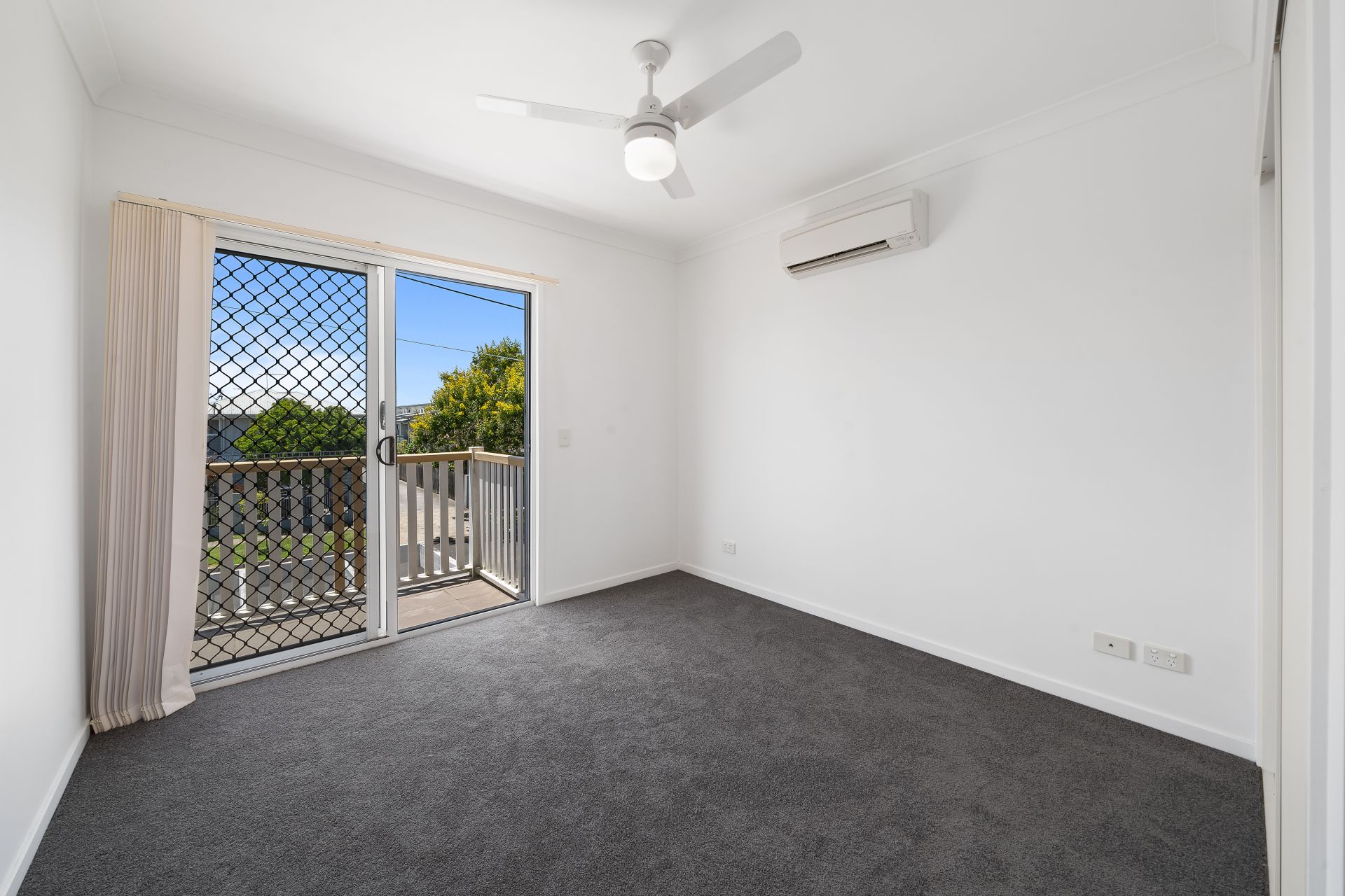 > The master bedroom features an ensuite, Juliet balcony, Daikin split-system air conditioning, plush carpet floors, built in robe, vertical blinds, sliding windows with security/fly screens and ceiling fan with light.