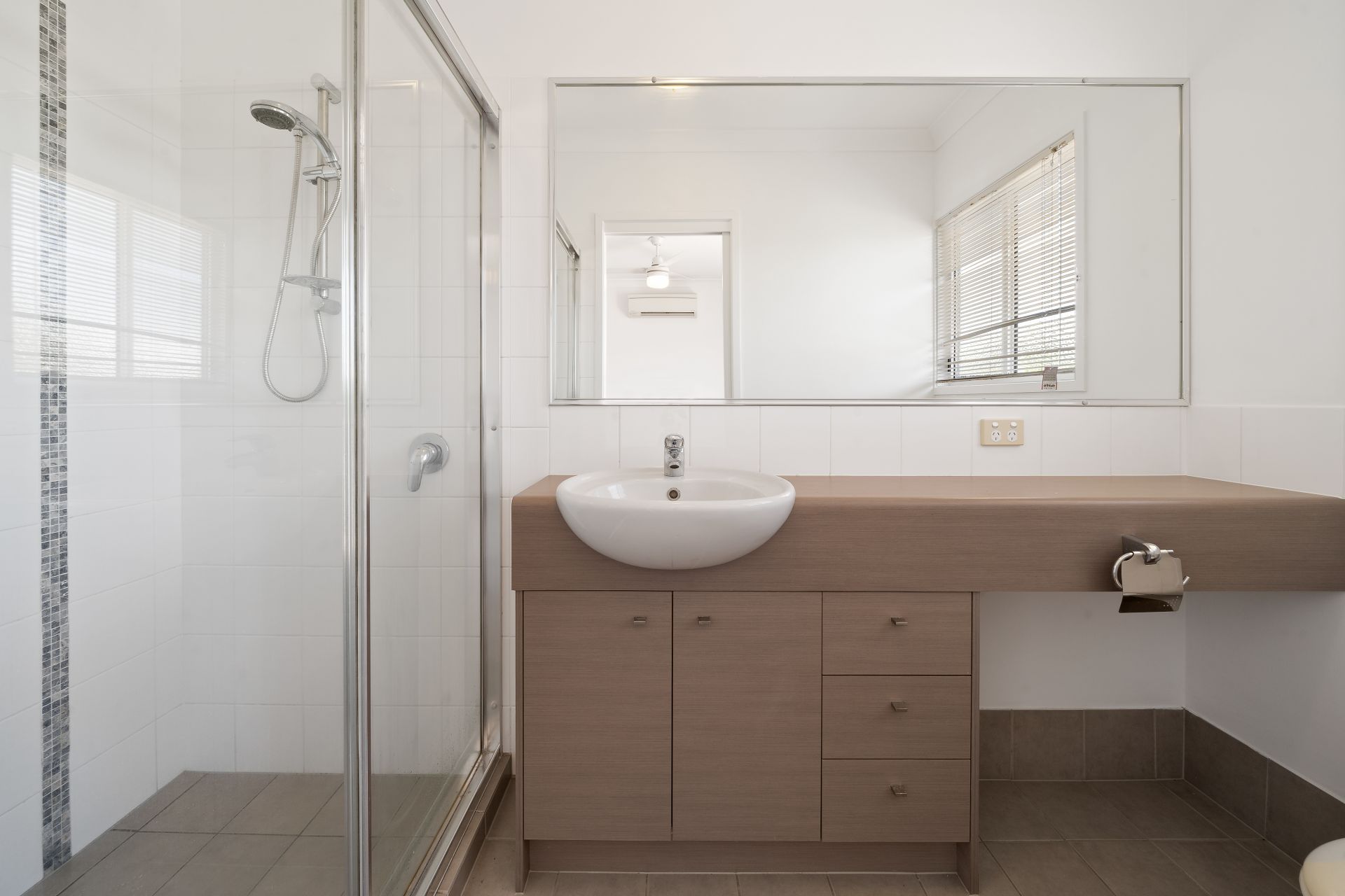 > The ensuite to master bedroom features a single basin vanity with plenty of storage, large vanity mirror, dual towel rail, walk in shower with detachable showerhead, frosted window with venetian blind, oyster lighting and toilet.
