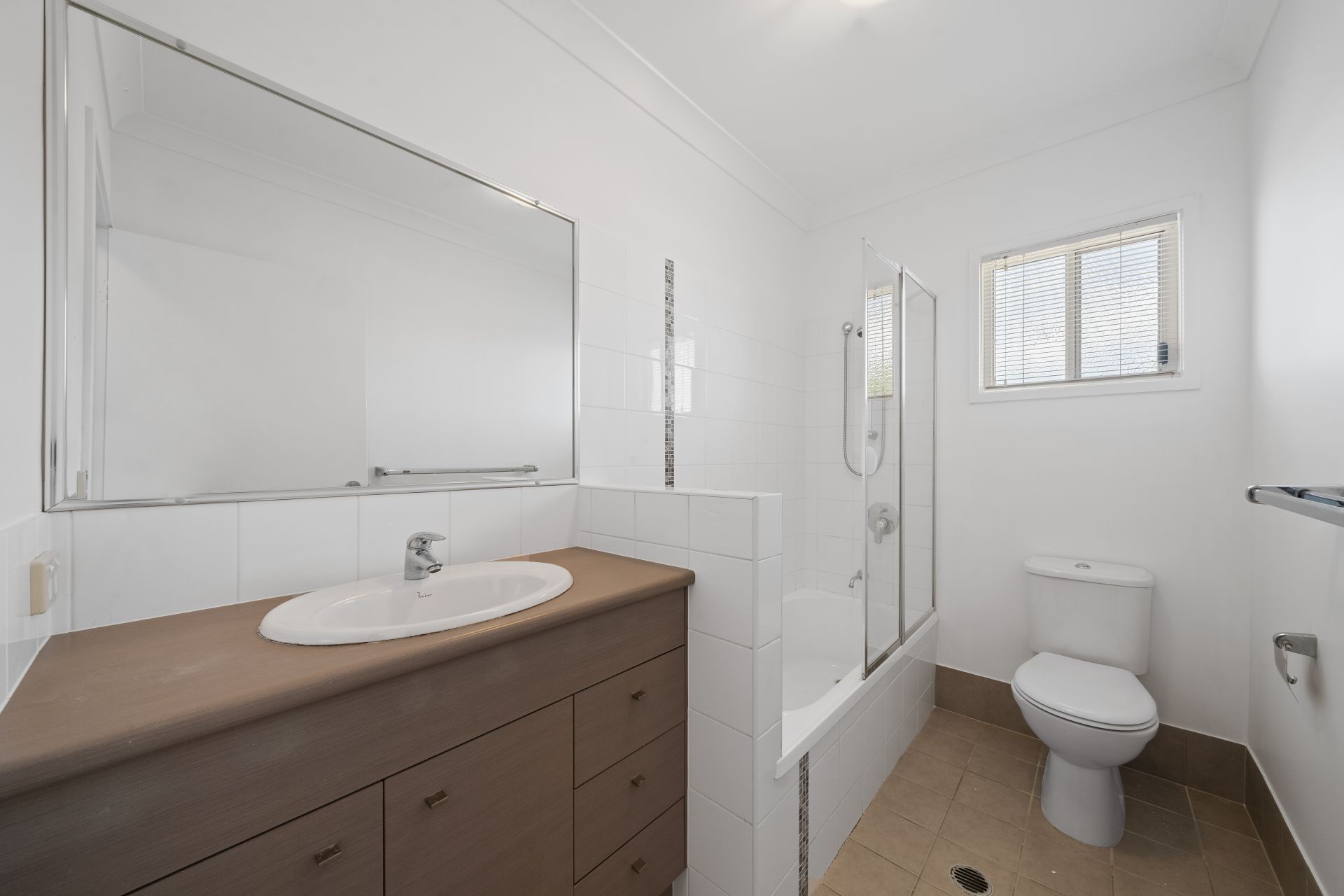 > The main bathroom features single basin vanity with plenty of storage, large vanity mirror, dual towel rail, shower over bath with detachable shower head, frosted window with venetian blind, oyster lighting and toilet.