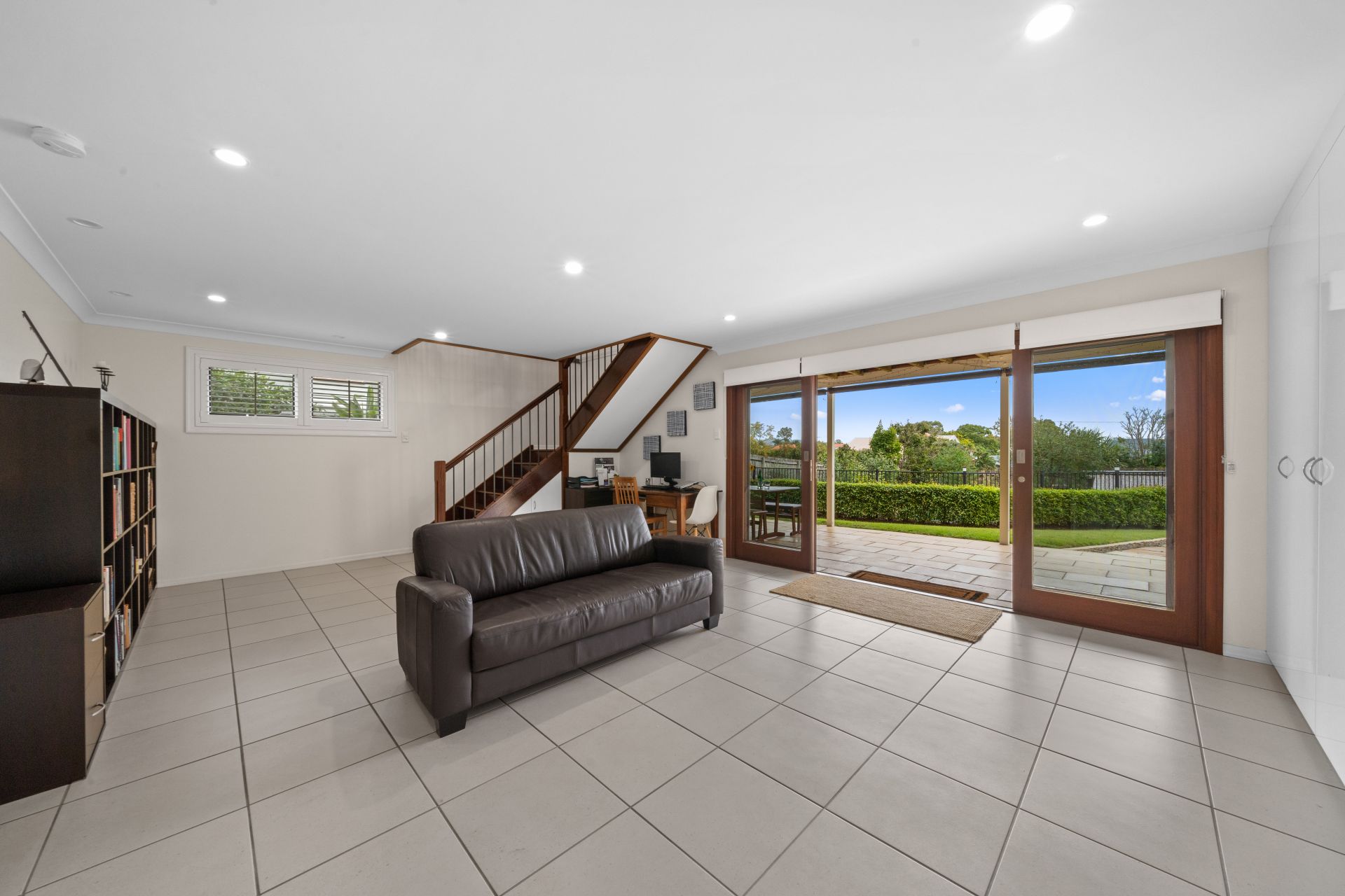 - Located on the lower level is the second living/rumpus room featuring, down-lighting, tiled flooring, awning windows with security mesh, a bank of glass sliding doors, access to the 2-way bathroom and laundry