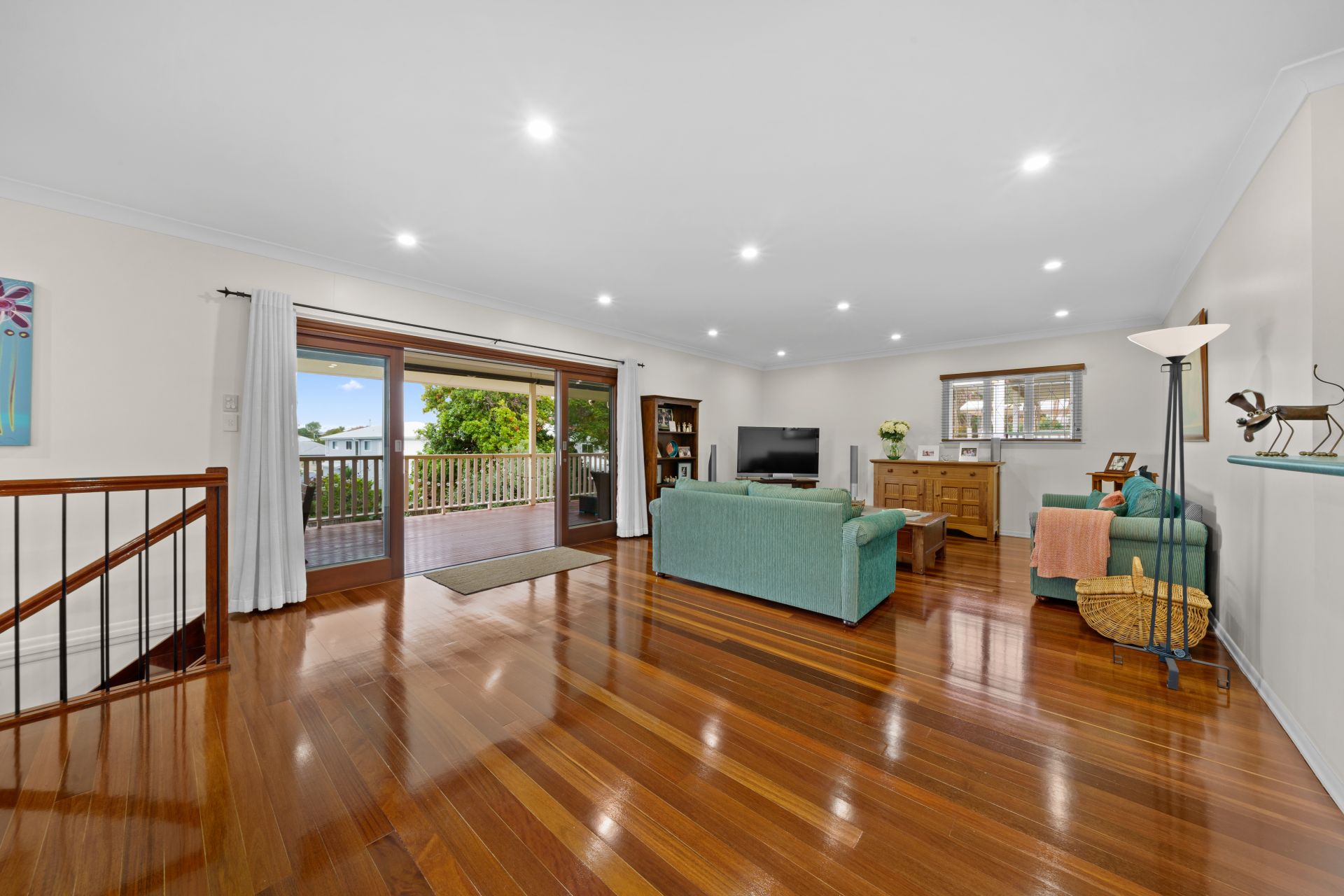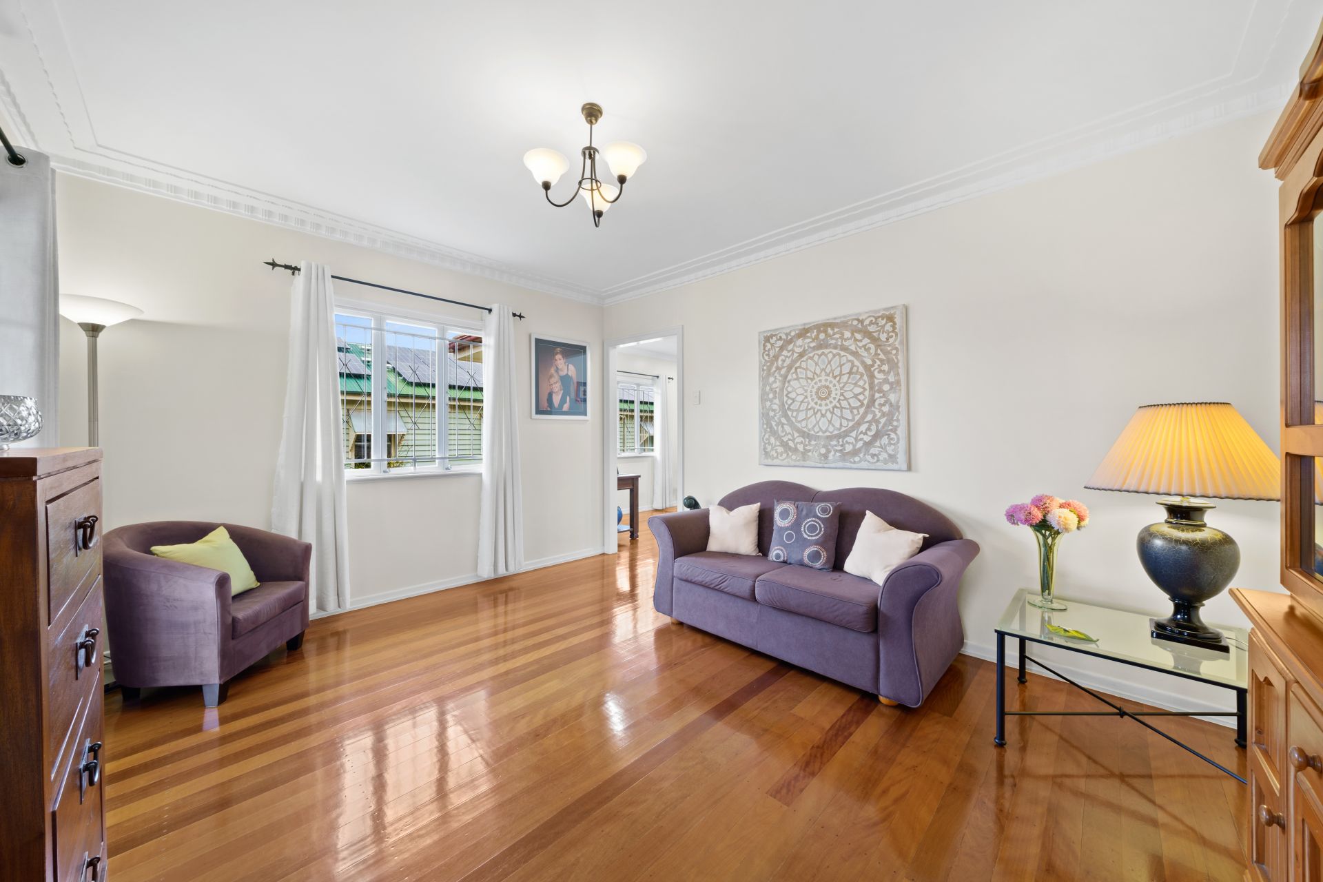 - Located at the front of the home is the lounge room boasting rich timber flooring, extra-high ceilings with ornate cornice, casement windows, security bars, curtains and French doors gaining access to the front landing