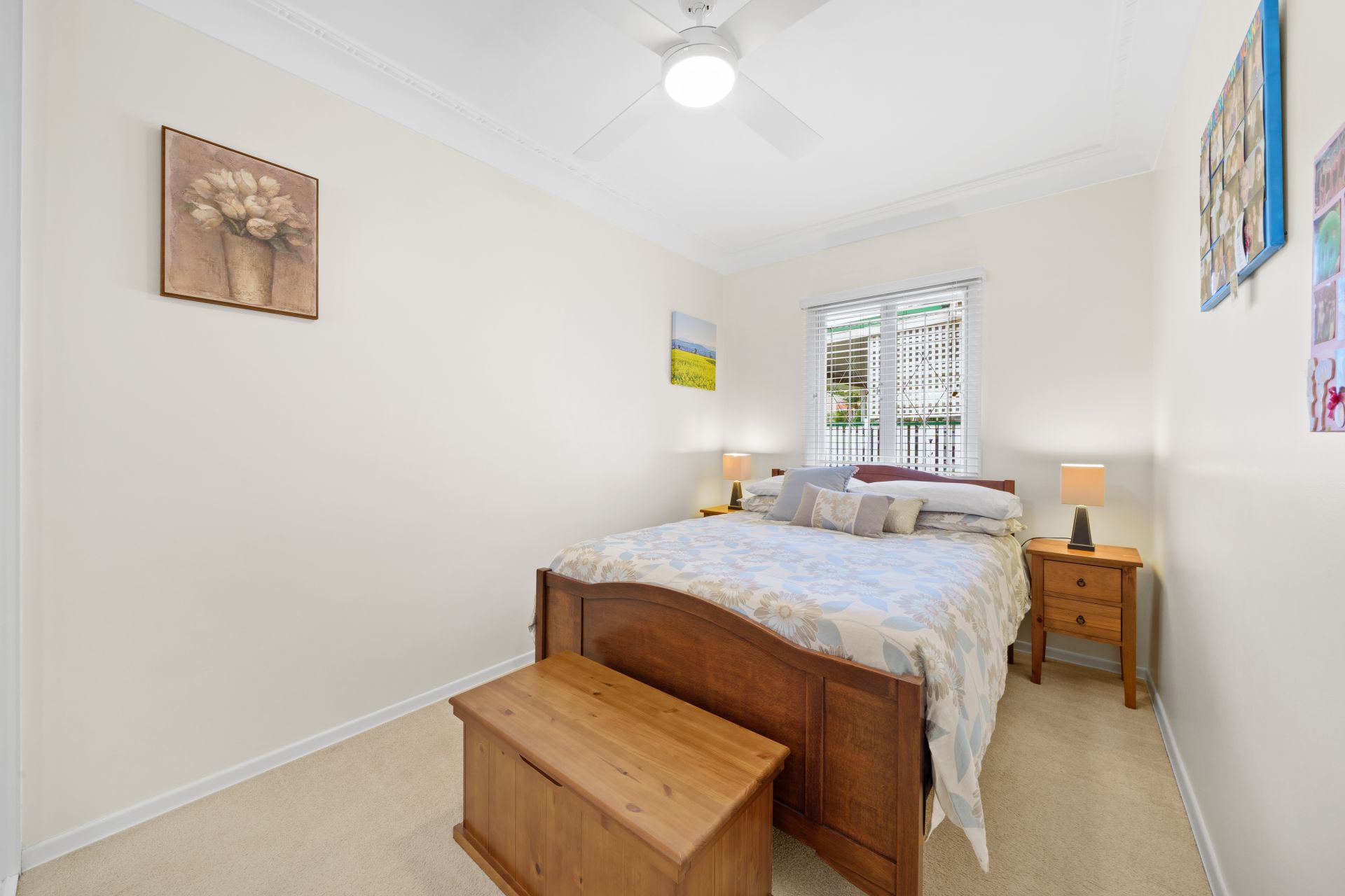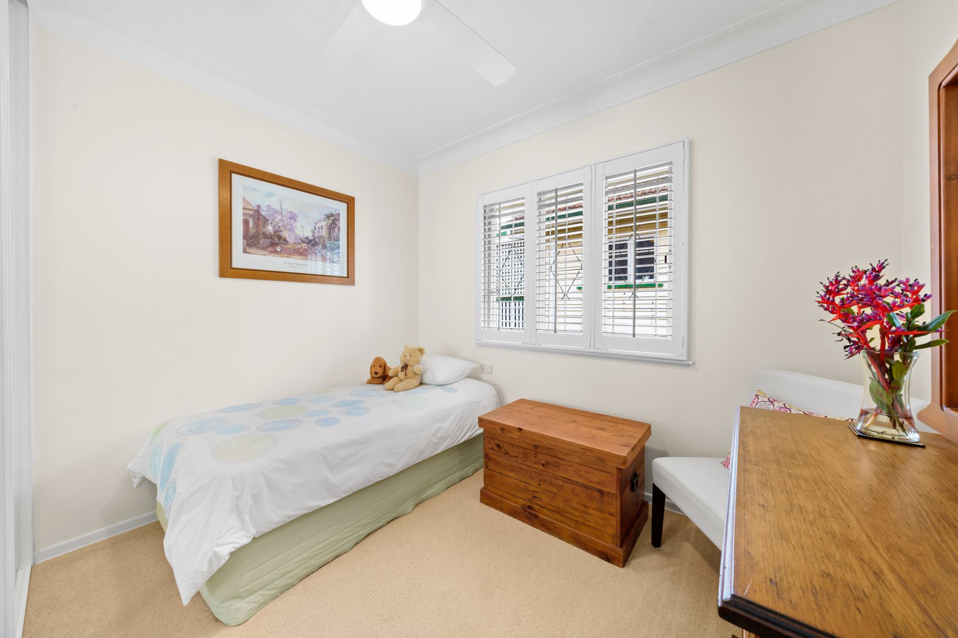 - Bedroom three features extra-high ceilings with ornate cornice, carpet flooring, ceiling fan with in-built lighting, built-in robe, Venetian blind, casement windows with security bars and flyscreens.