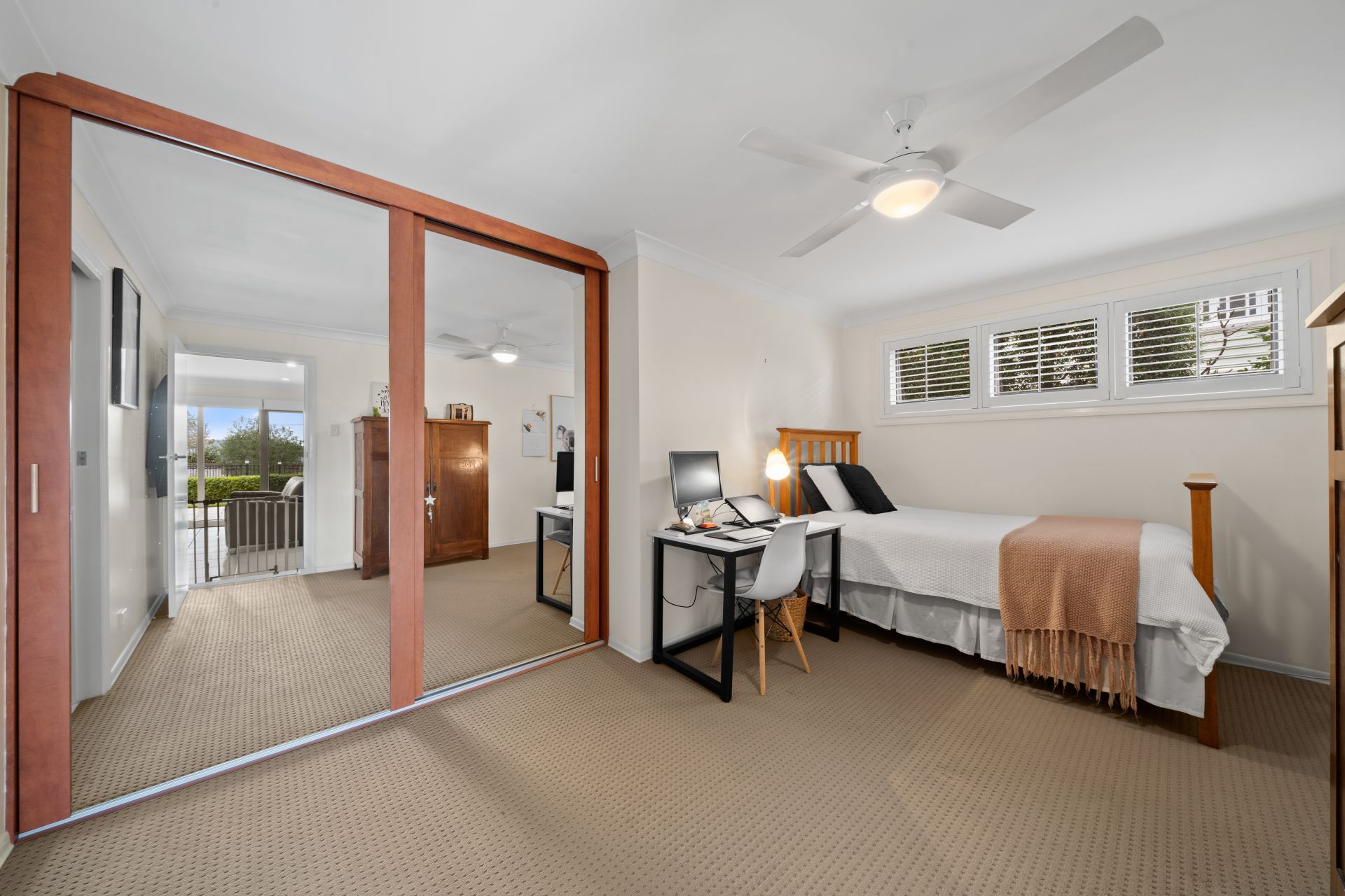 - Bedroom four located on the lower level of the property features carpet flooring, ceiling fan with in-built lighting, built-in-robe, plantation shutters, awning windows with security mesh and access to the 2-way bathroom