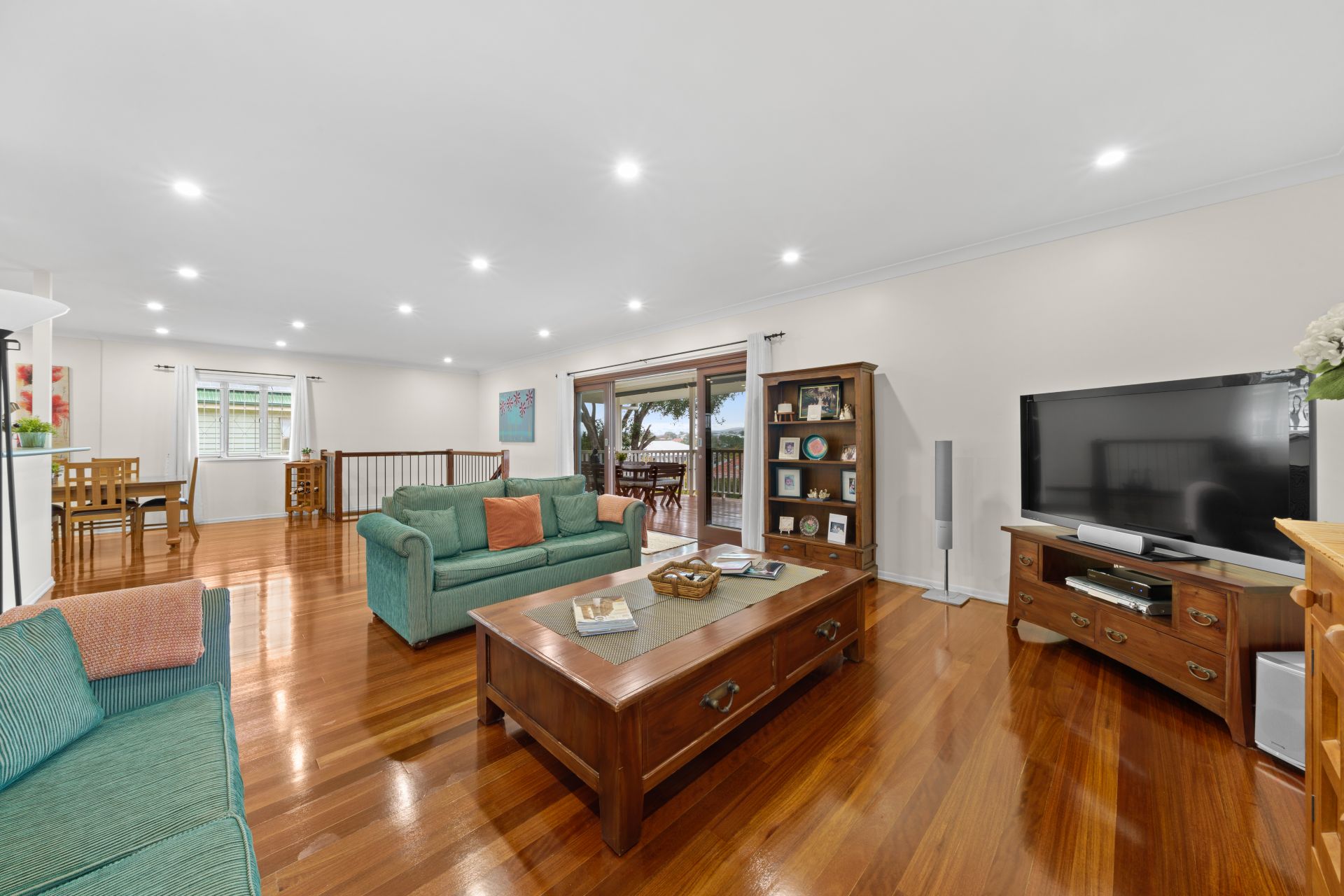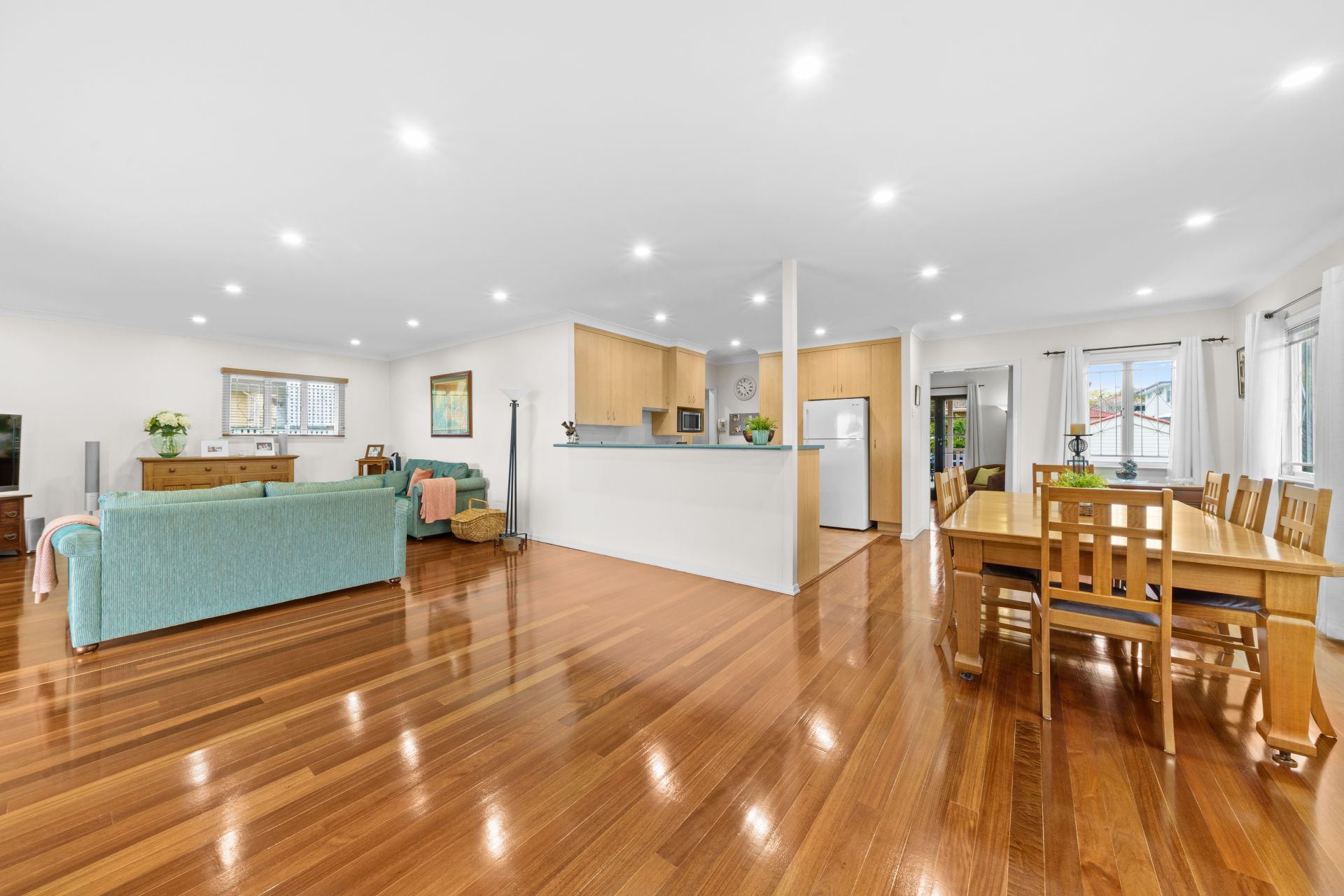 - The open plan main living/dining areas located at the heart of the home flow effortlessly to the kitchen and through to one of the dual outdoor entertaining areas. The light and contemporary colour scheme add to the expansive nature of the home, featuring extra-high ceilings, air-conditioning, down-lighting, rich timber flooring, casement windows, security bars, a combination of Venetian blinds and curtains as well as a bank of glass sliding doors.