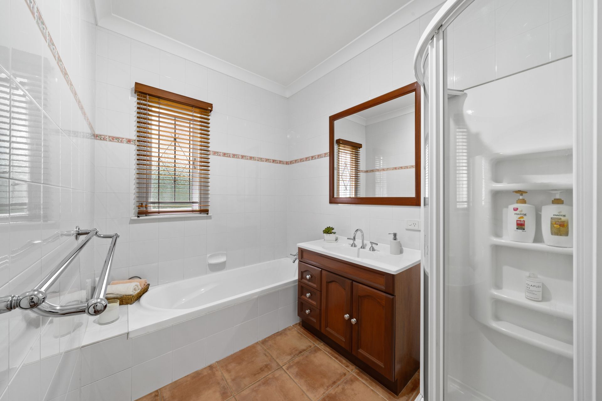 - The main bathroom located on the top-level features chic floor-to-ceiling tiles, shower with detachable showerhead, bath, single basin vanity with plenty of storage, large vanity mirror, extractor/light, Venetian blind, casement window with a security bar, towel racks and separate toilet