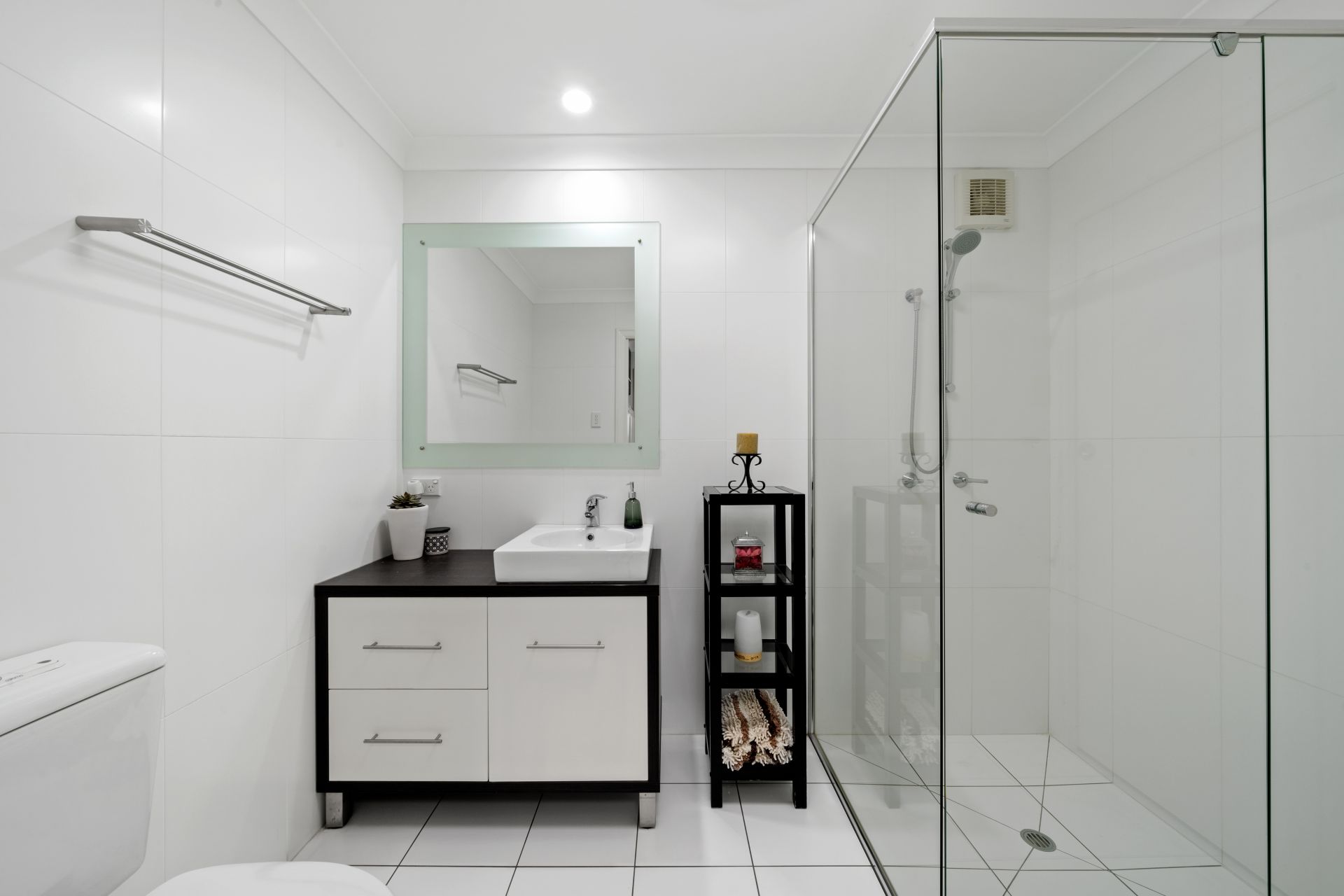 - The 2-way bathroom located on the bottom level features floor to ceiling tiles, shower with detachable showerhead, single basin vanity with plenty of storage, large vanity mirror, extractor/light, dual towel racks and toilet.