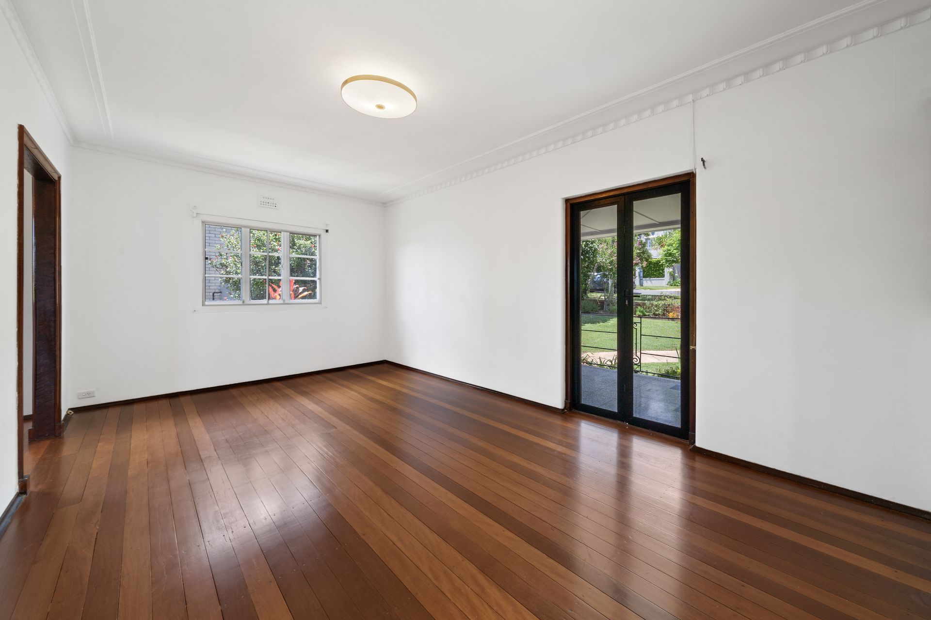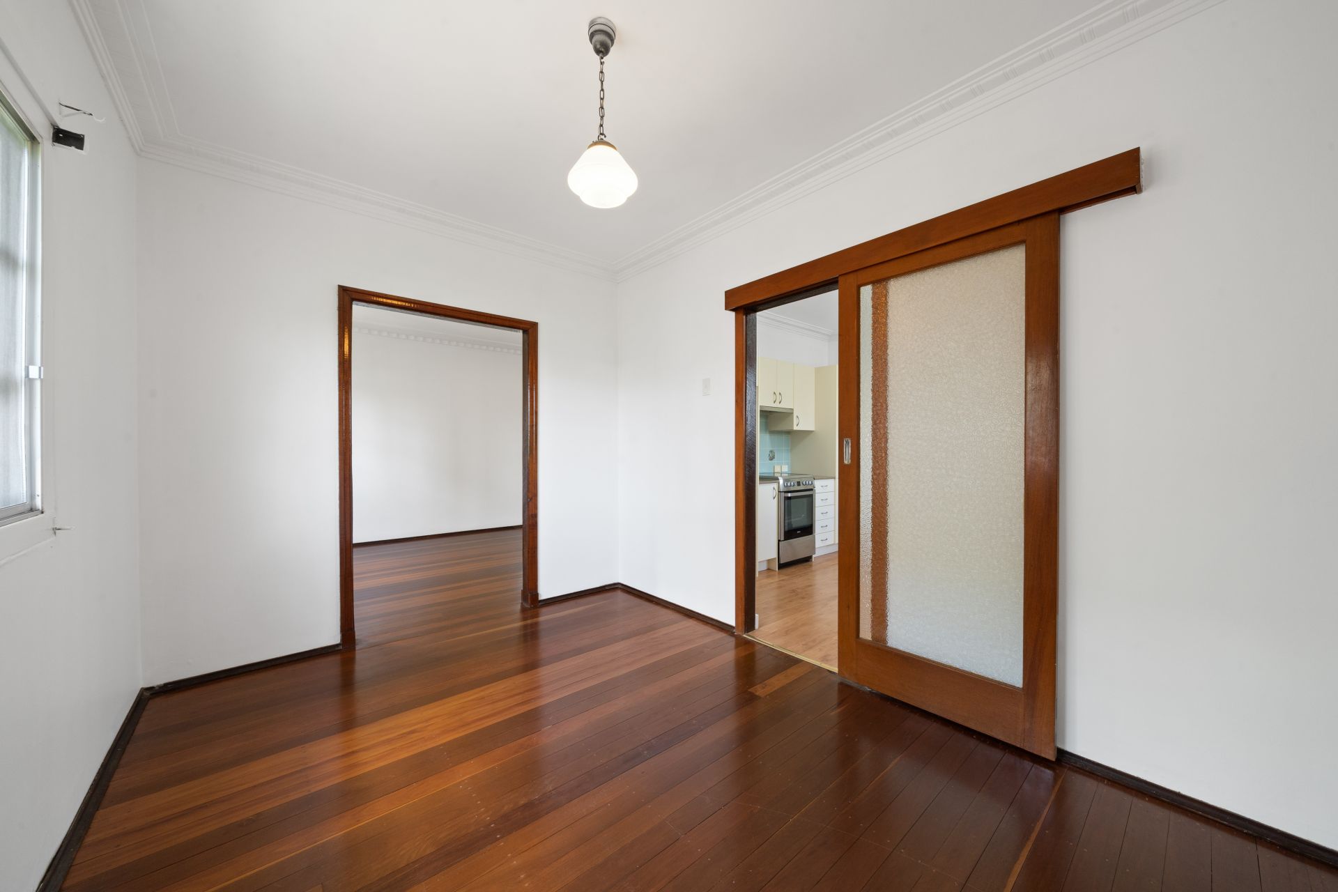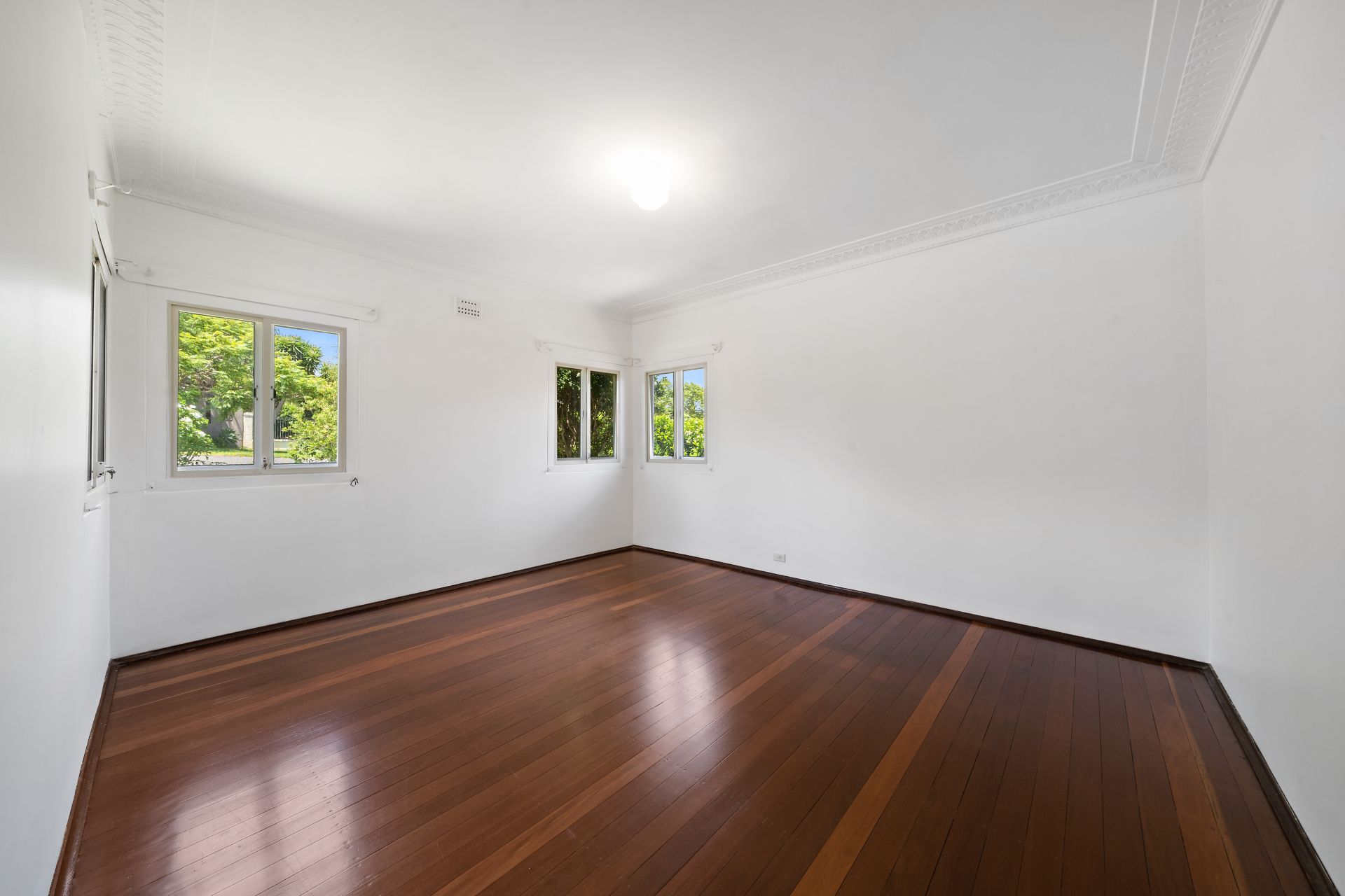 > Bedroom 3 features extra-high ceilings with ornate cornicing, rich timber flooring, standard lighting, casement windows with fly screens.