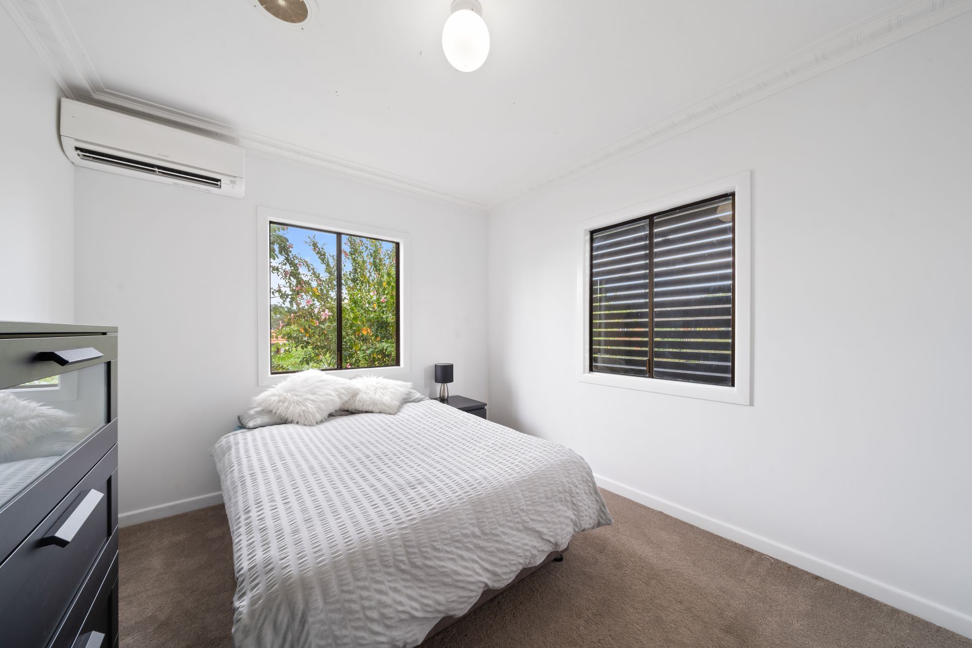 > Bedroom 3 enjoys extra-high ceiling, split system air-conditioning, carpet flooring, standard lighting and sliding windows.