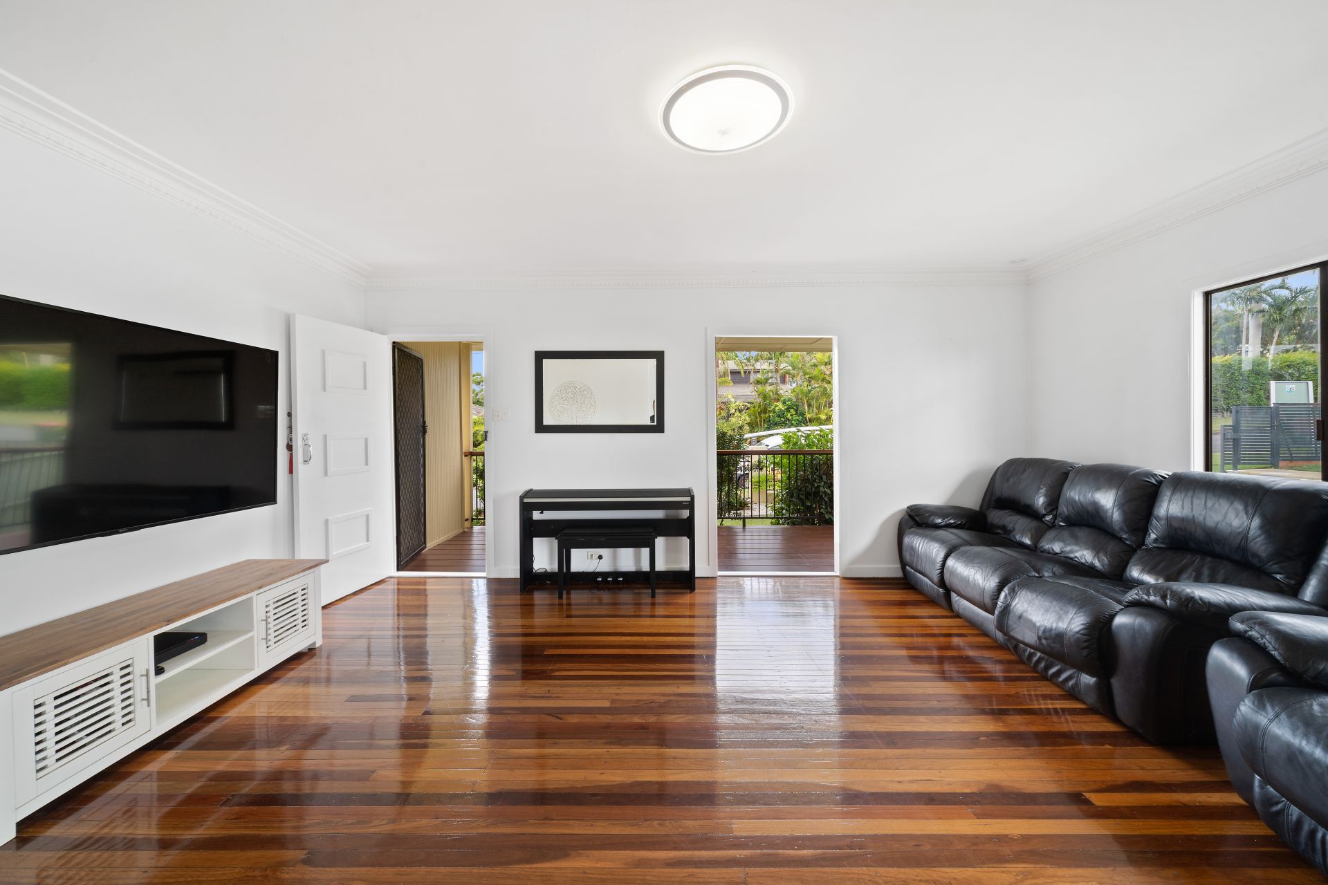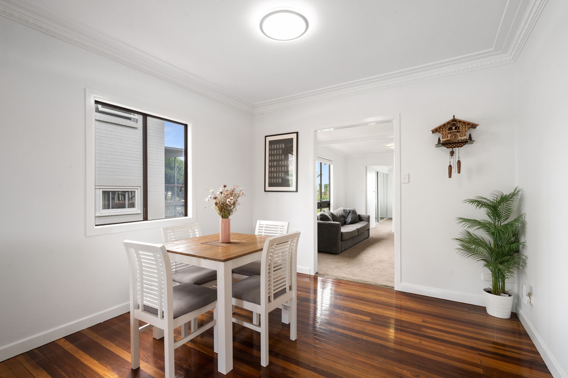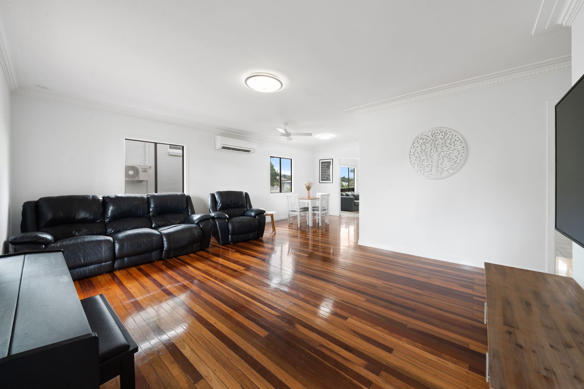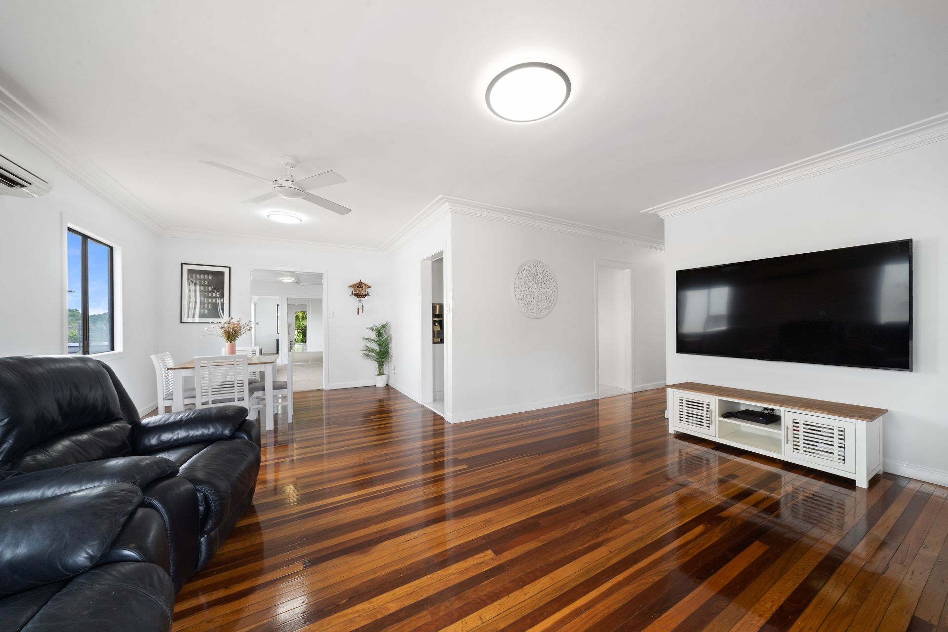 > The open plan living/dining flows effortlessly to the kitchen, through to the living and out to the outdoor entertaining areas. The light and contemporary colour scheme adds to the expansive nature of the home. Boasting split system air-conditioning, pendant lighting, tv wall bracket, extra-high ceilings with ornate cornicing, rich timber flooring, sliding windows as well as French doors giving you access to the front balcony.