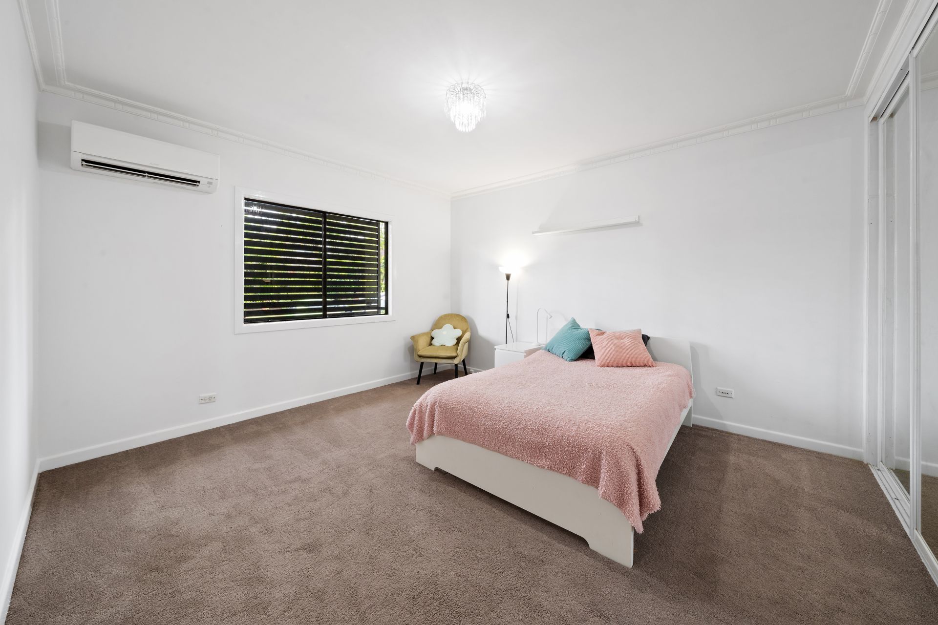 > Bedroom 5 offers extra-high ceiling, split system air-conditioning, ornate cornicing, carpet flooring, pendant lighting, wall mounted shelf, large mirrored built-in robe and sliding window.