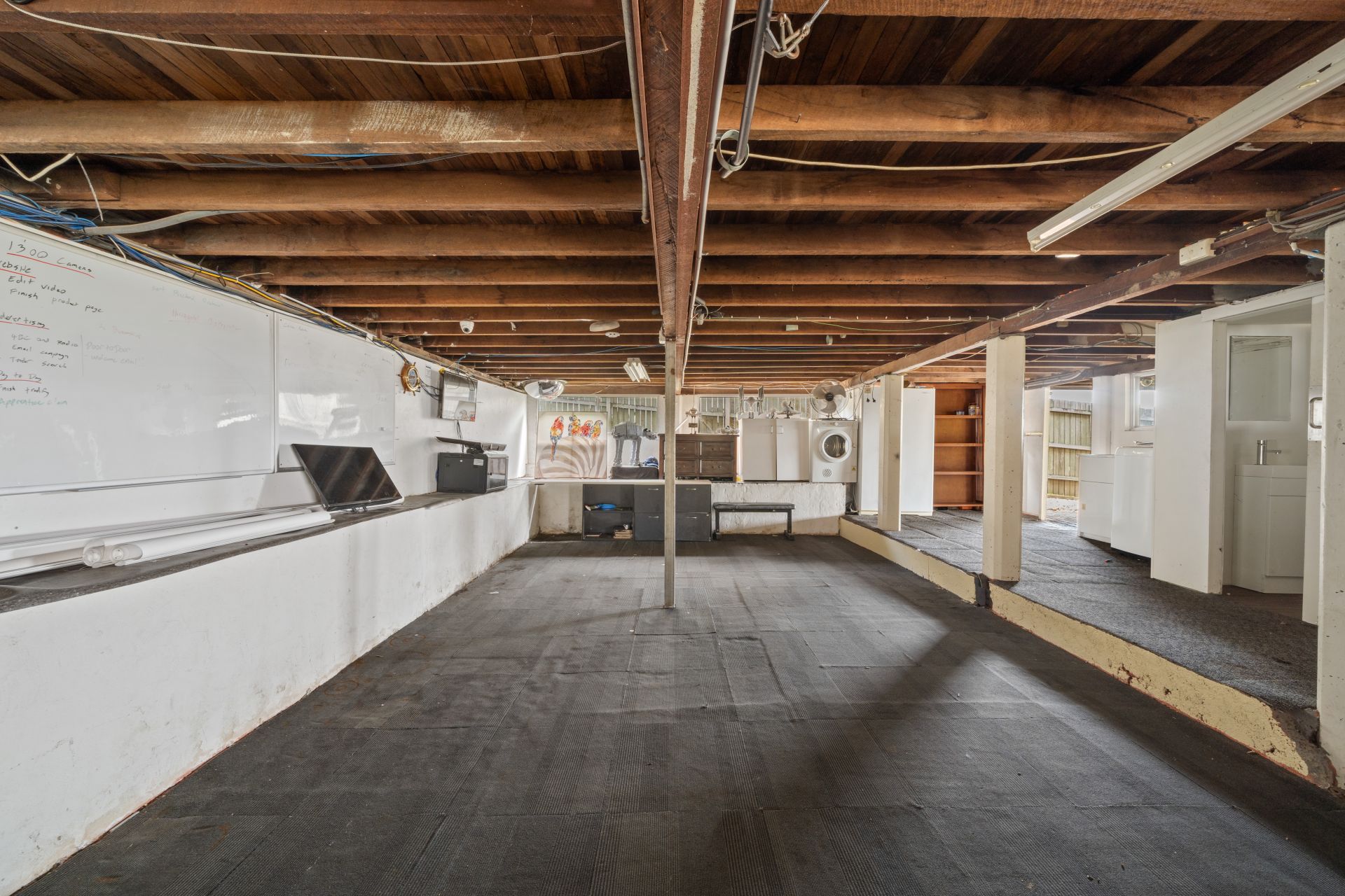 > The enclosed downstairs area offers an abundance of space, perfect for a workshop and storage. Featuring a designated storage room, fluorescent lighting, and wash basin.