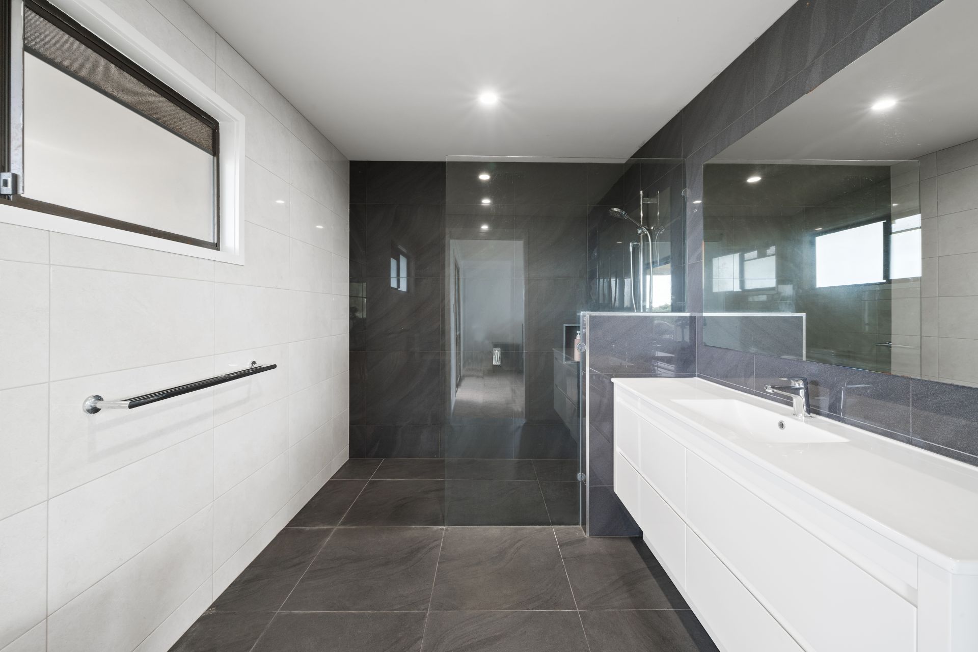 > The ensuite to the master located on the top-level features floor to ceiling tiles, shower with wall niche, walk-in shower with detachable showerhead, large single basin floating vanity with plenty of storage, large wall mounted mirror, down lighting, double towel rail, two wall niches for additional storage, frosted sliding window and toilet.