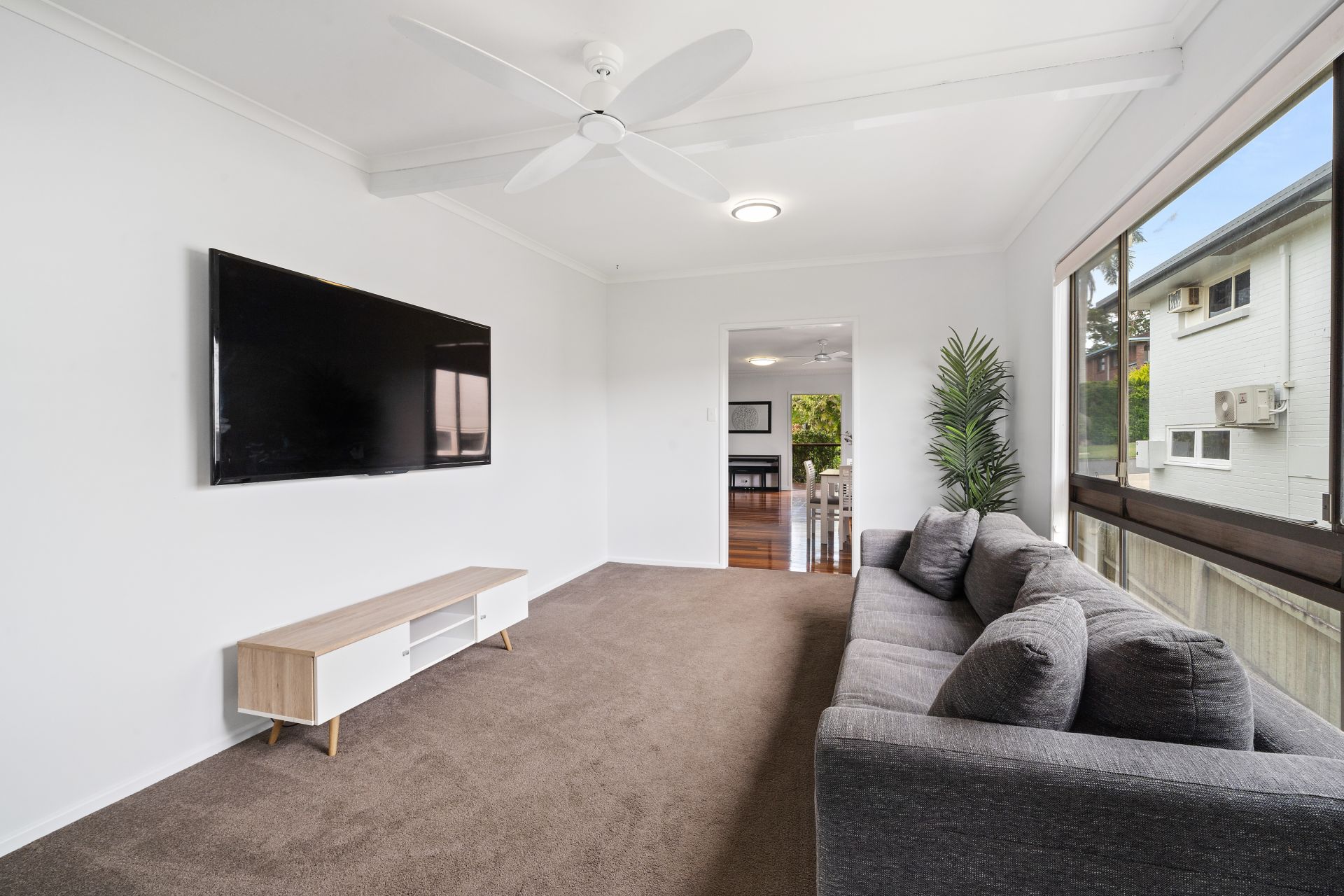 > The separate lounge room located just off the main dining area boasts, carpet flooring, pendant lighting, ceiling fan, mirrored storage cupboard, tv wall bracket and sliding window.