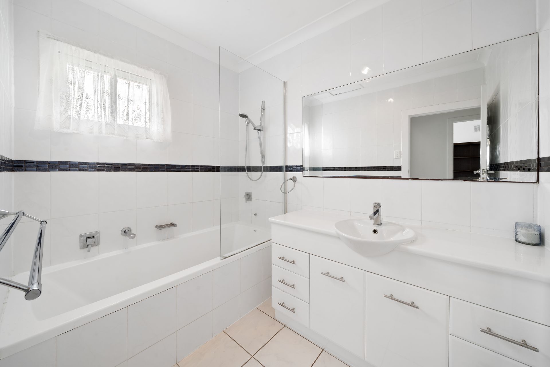 > The main bathroom located on the top-level in the bedroom wing features floor to ceiling tiles, shower over bath configuration with detachable showerhead, large single basin vanity with plenty of storage, large wall mounted mirror, extractor/heat/light combo, tile flooring, double towel rail, hand towel ring, sliding window with sheer curtain and separate toilet.