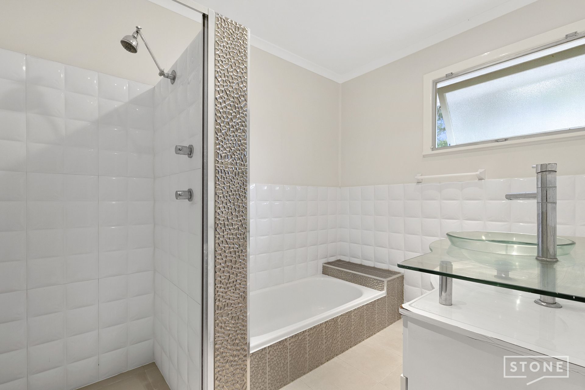- Bathroom centrally located featuring corner shower plus a separate bathtub, bevelled tiles, single basin with glass top, wall mirror and screen. Separate toilet.