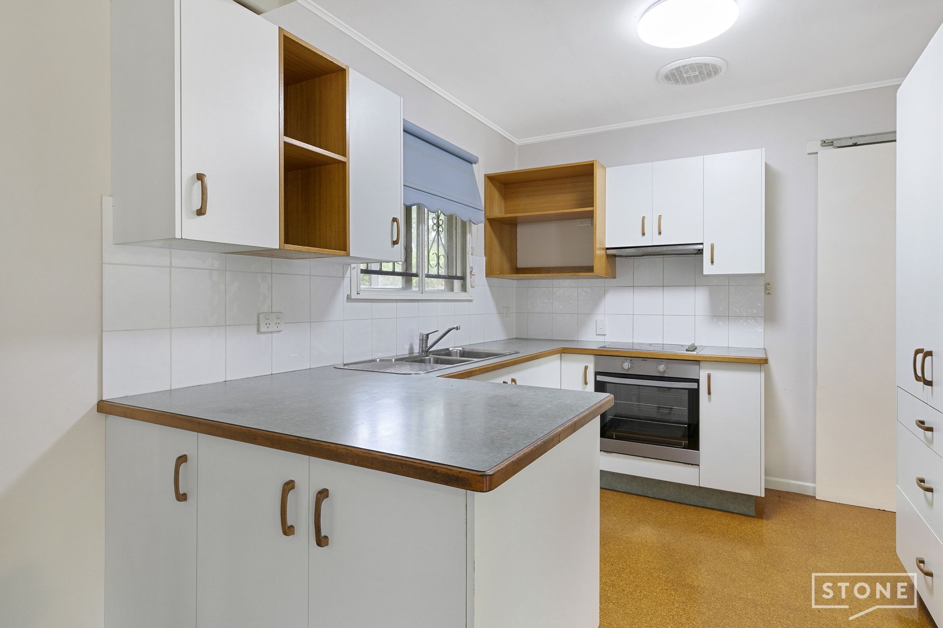 - Kitchen neatly tucked away at the back of the home with views of the backyard, cork flooring, laminate cupboards and benchtops, stainless steel oven and 4 burner cooktop.