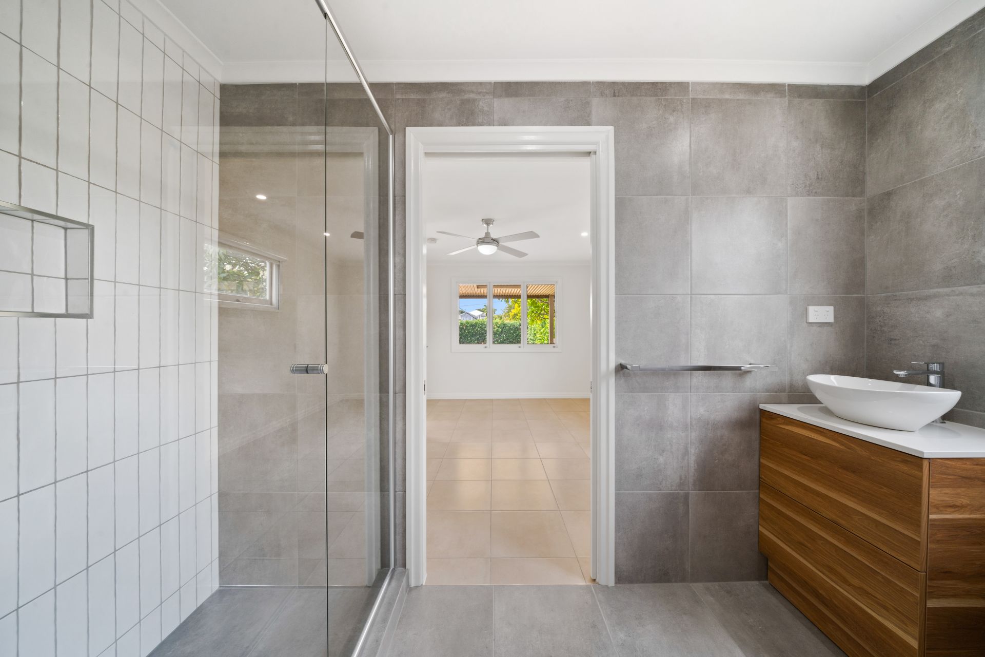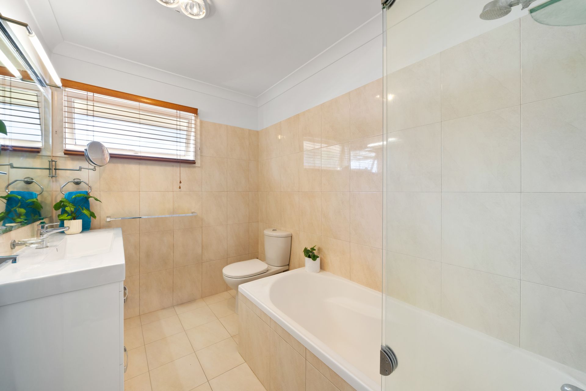 > The main bathroom located upstairs features a shower over bath with detachable showerhead, vanity with plenty of storage, large wall mounted mirror, dual towel rails, combination exhaust fan/heat lights, high casement window with venetian blind and toilet.