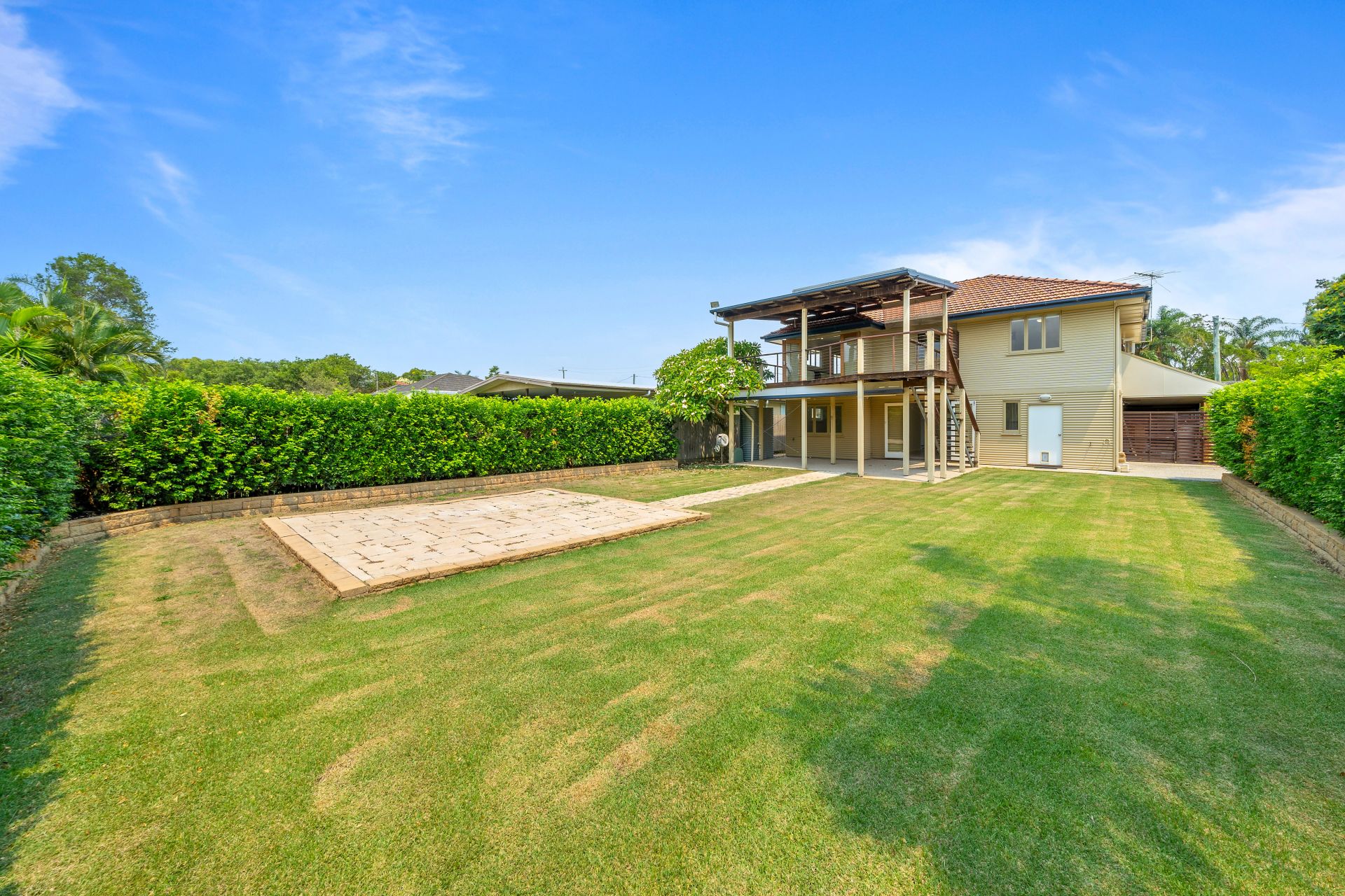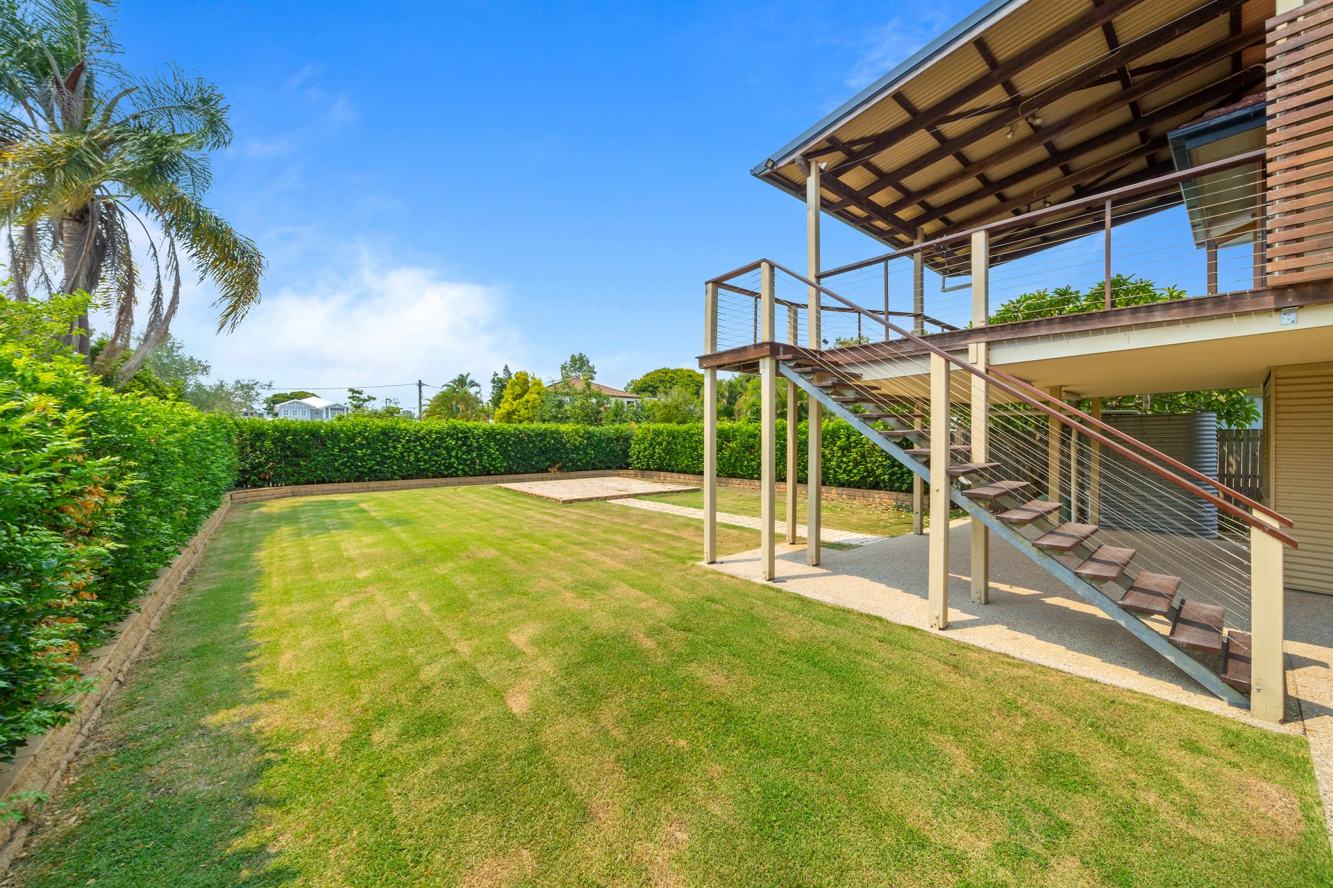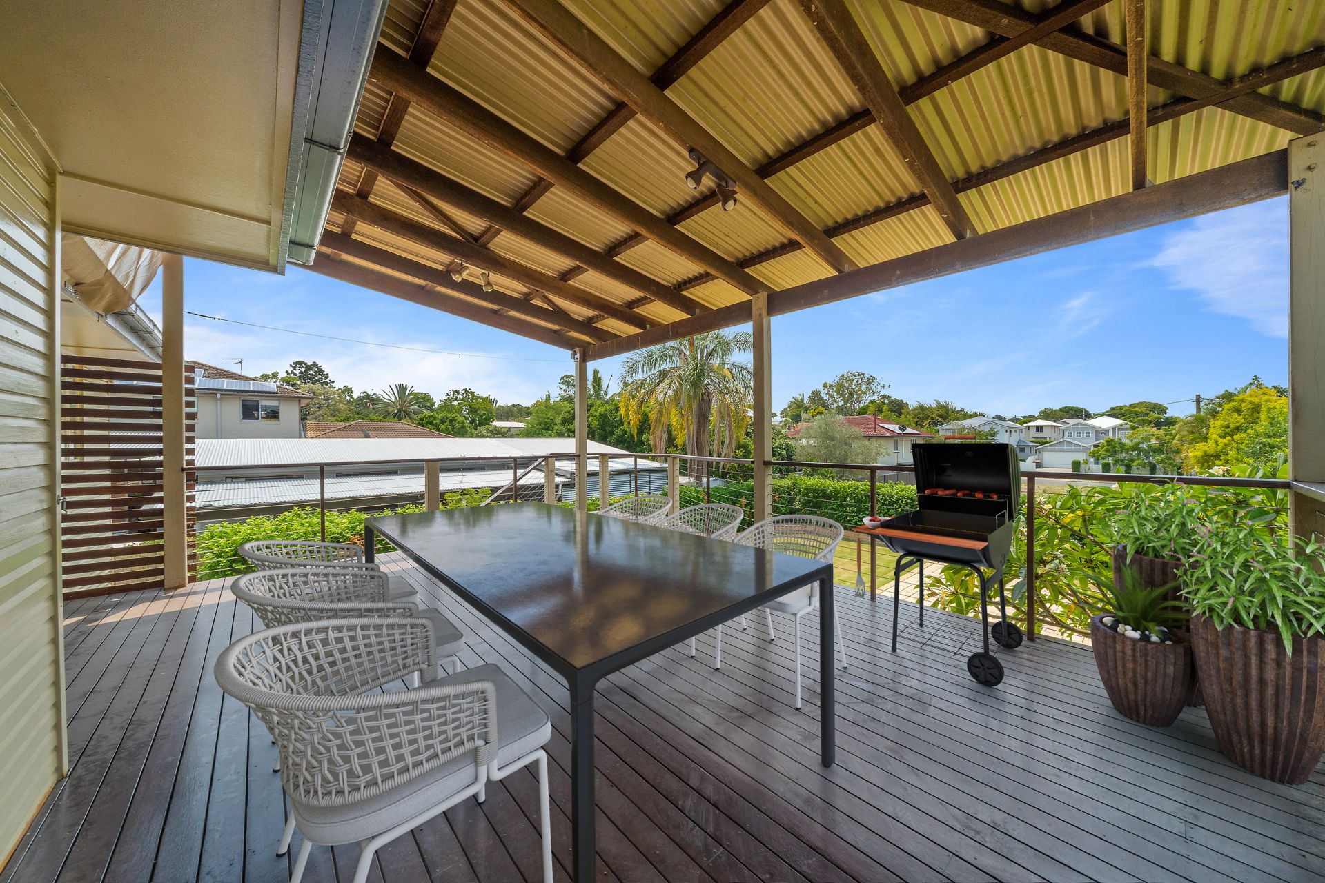 > The rear covered deck with access from the kitchen and external stairs to the backyard is an excellent spot for outdoor entertaining, with ample space for outdoor furniture and a BBQ.