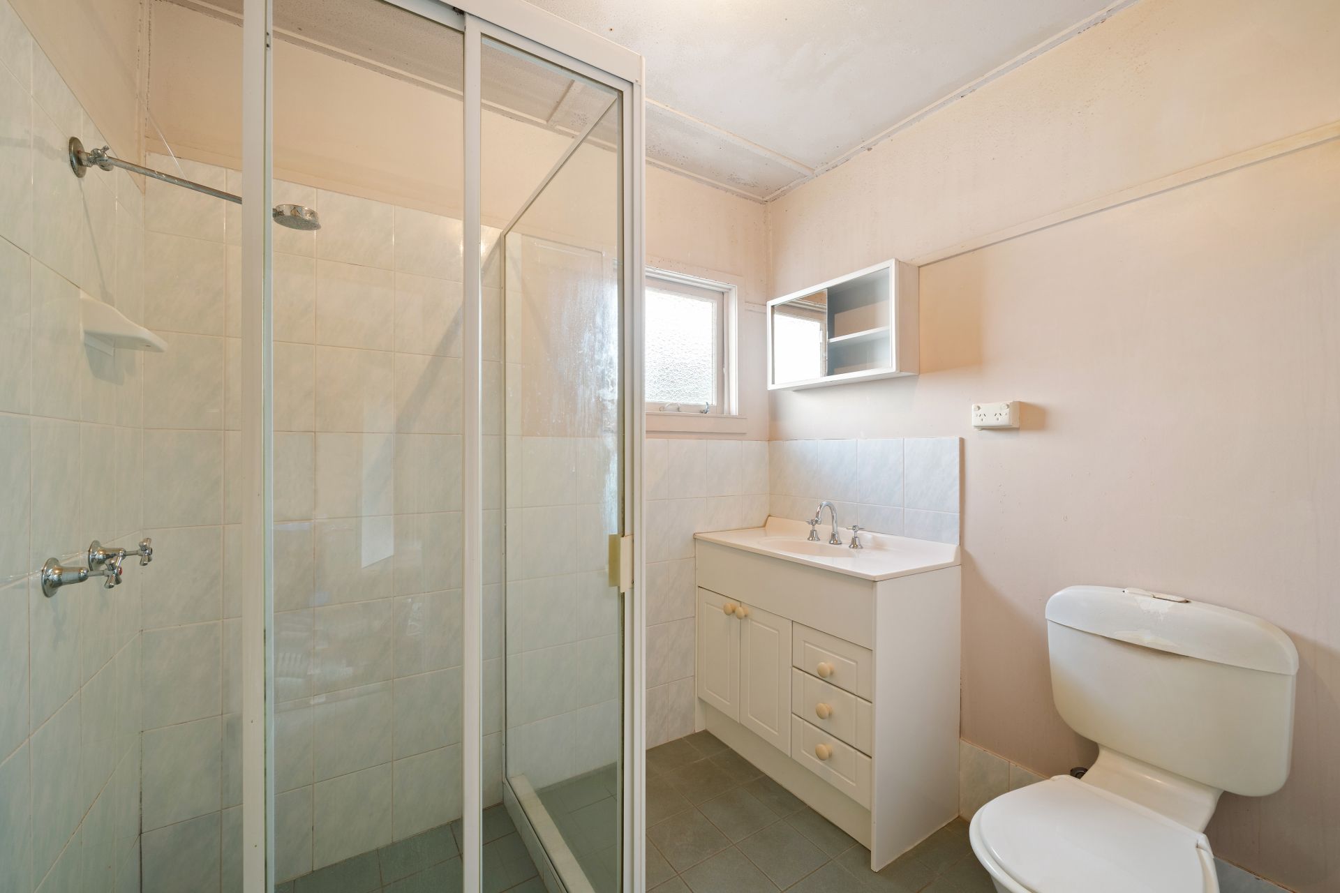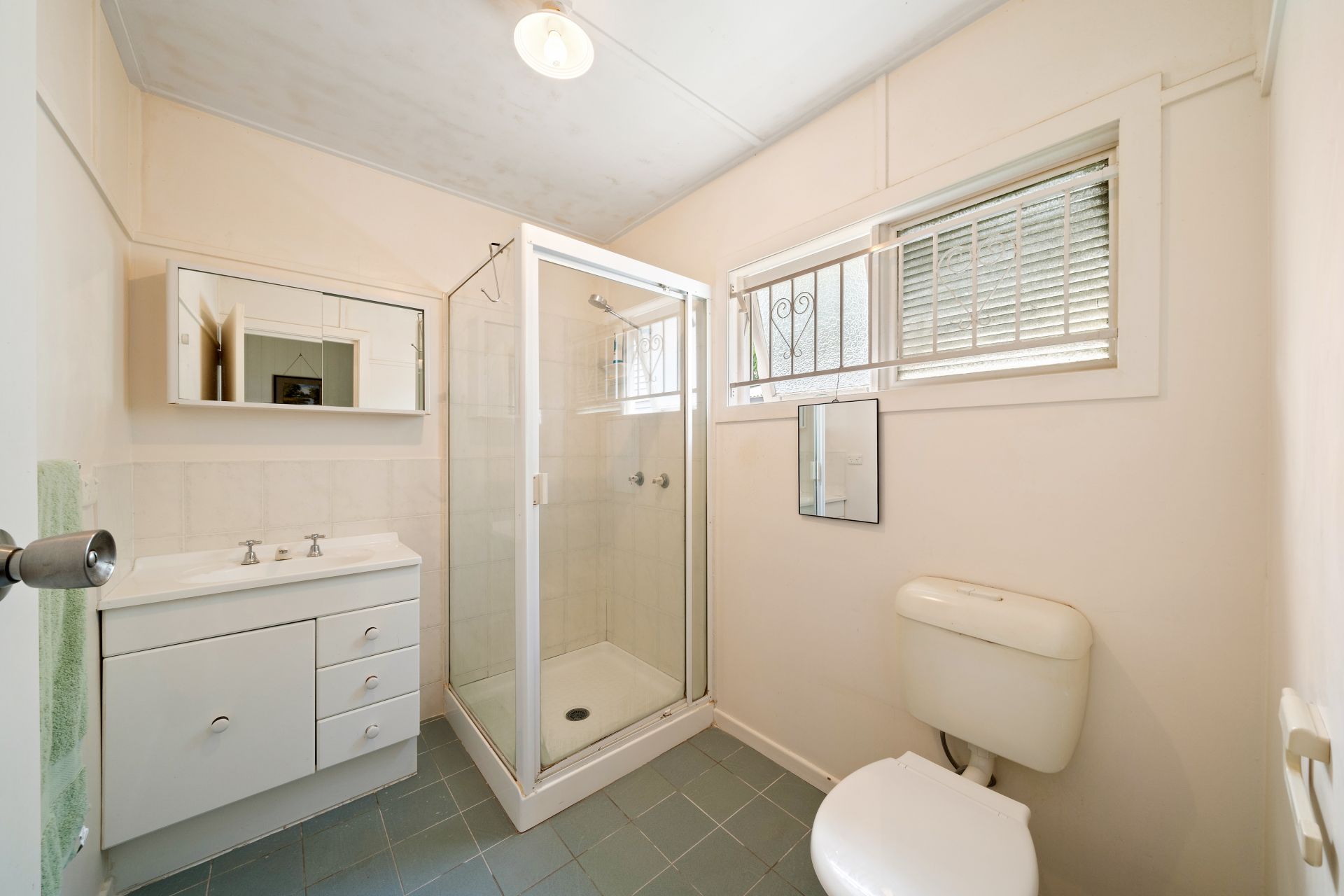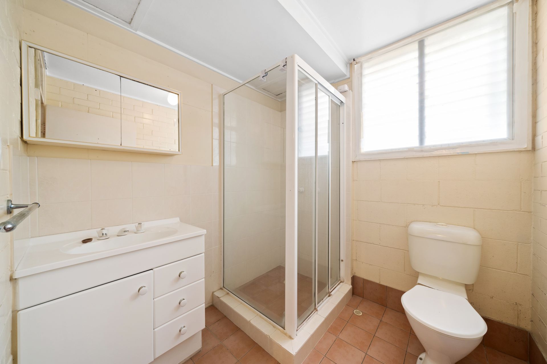 > The bathroom features a shower with fixed shower head, single basin vanity with plenty of storage, mirrored cabinet, standard lighting, tile flooring and splashback, awning window, towel rails and toilet.