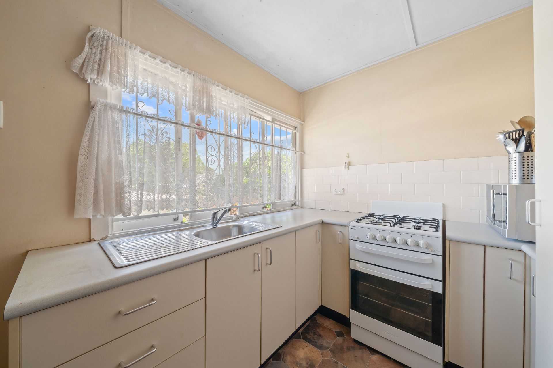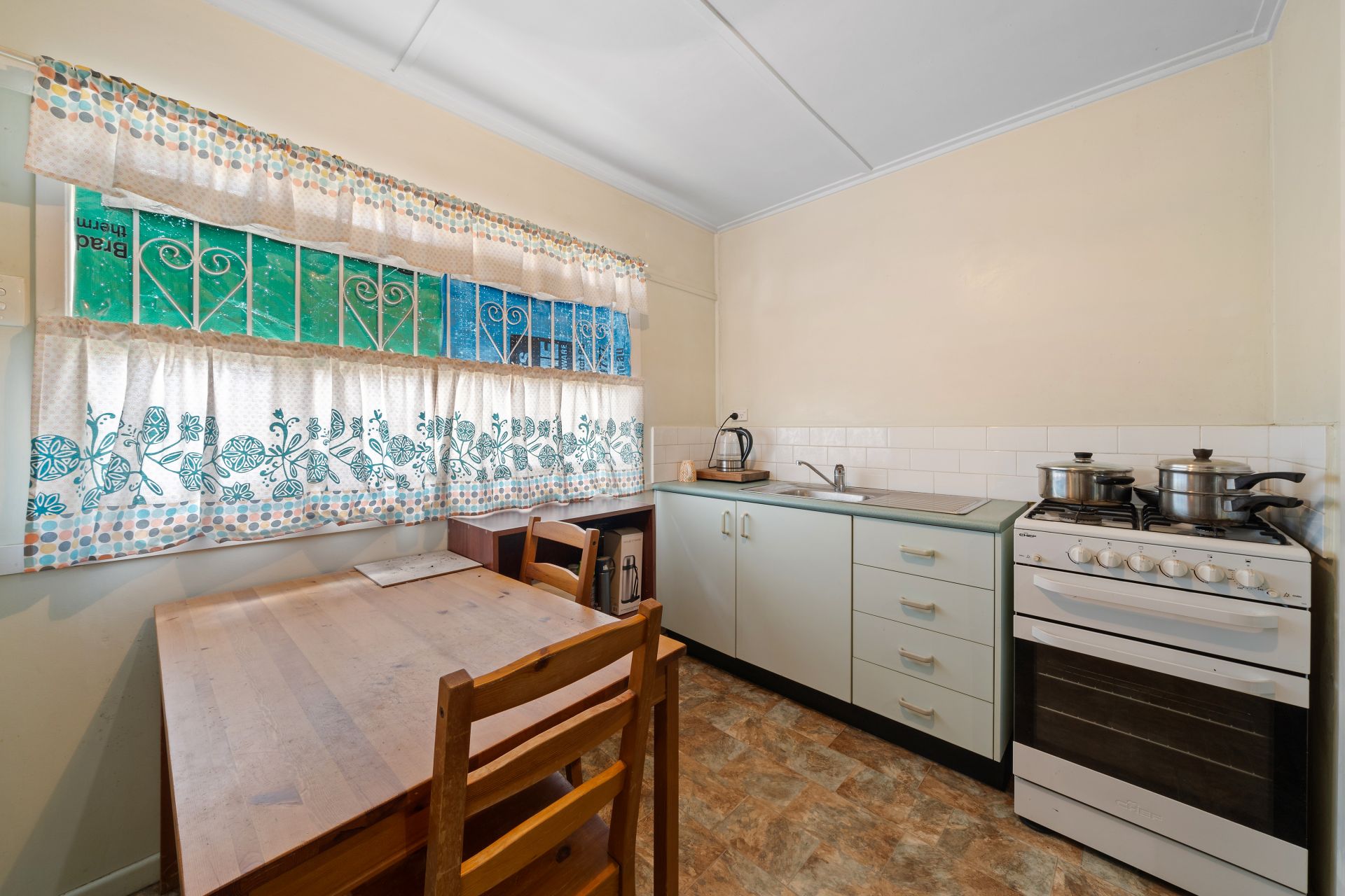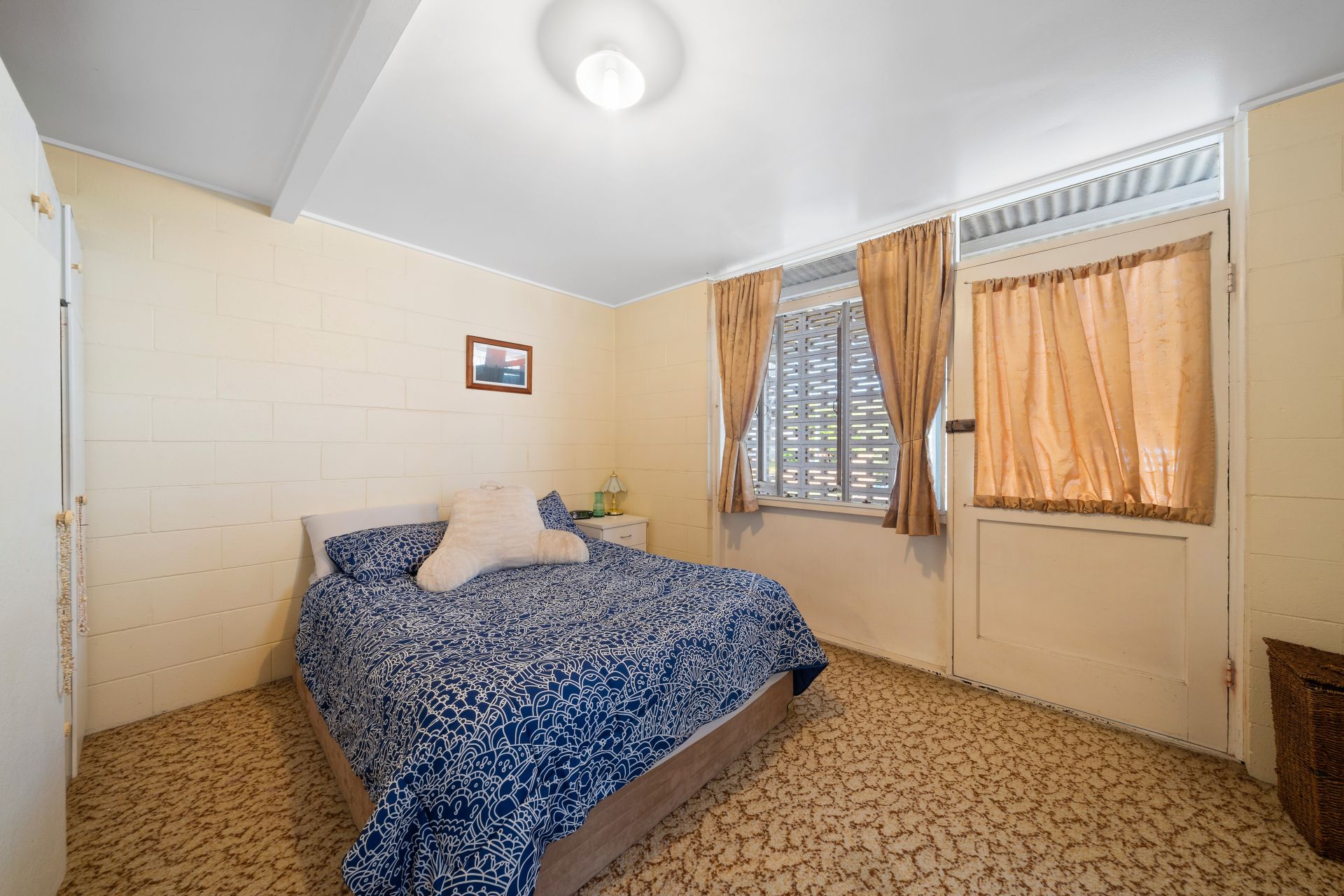 > The open living area flows effortlessly from the entrance and kitchen/dining area through to the bedroom. Featuring carpet flooring, VJ panelling, picture railing, pendant lighting, casement windows, security bars, curtains, and external access to yard via stairs.