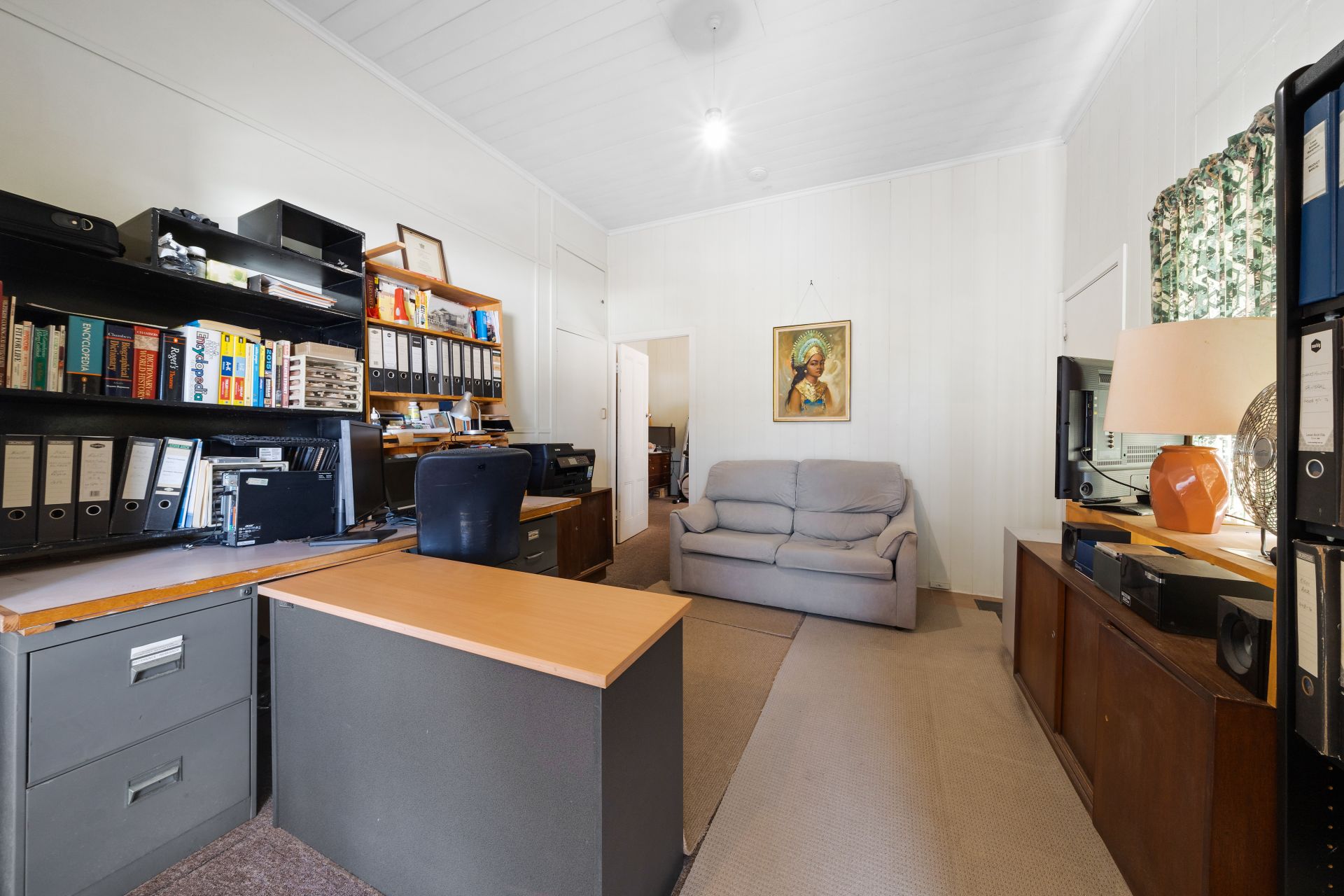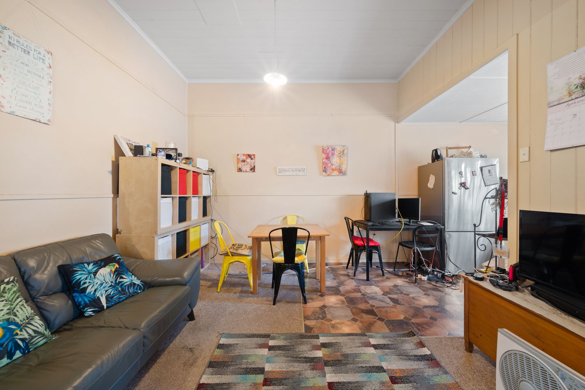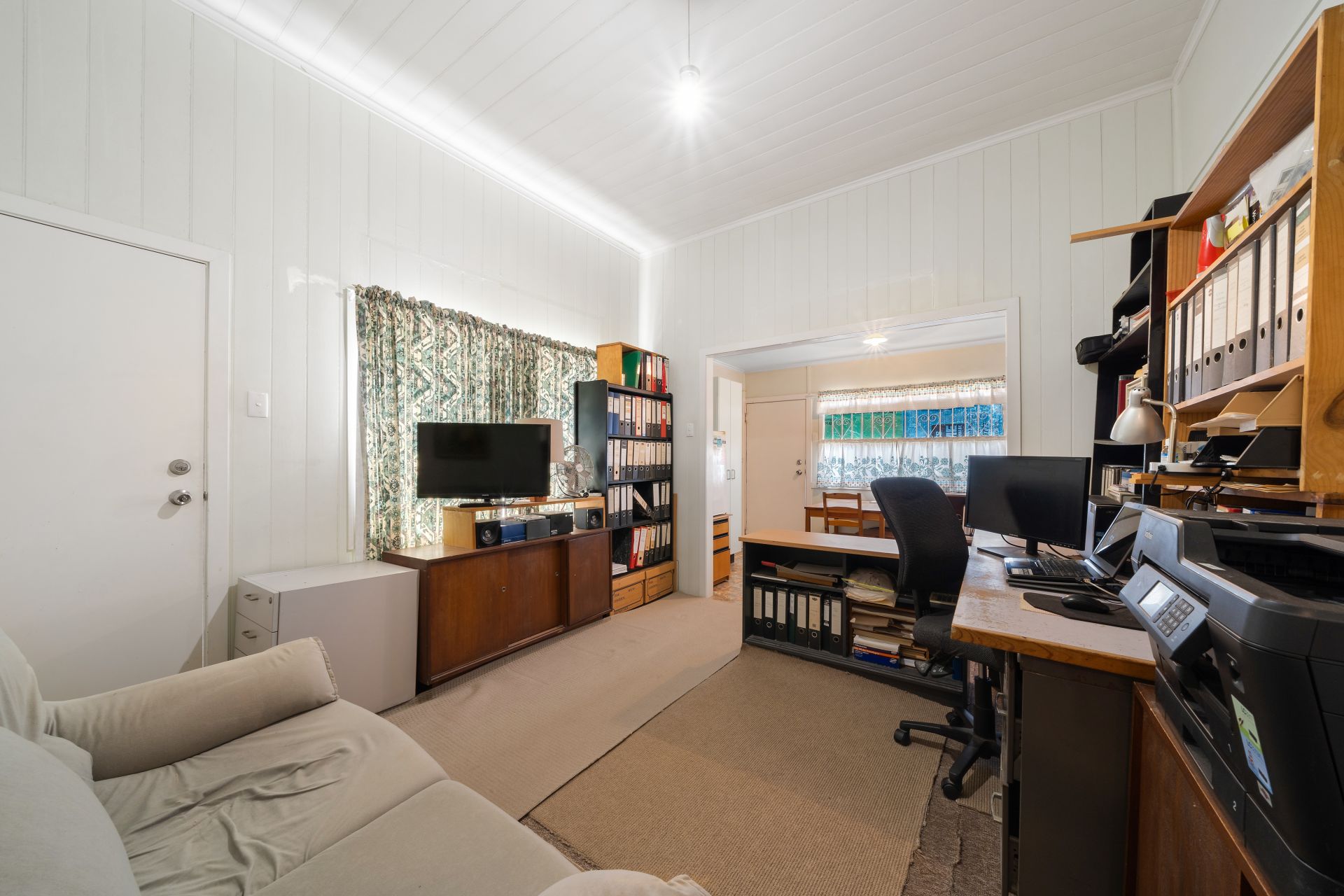 > The open living/dining area situated in the heart of the home flows effortlessly from the entrance and kitchen through to the bedroom. Features extra-high ceilings, a combination of carpet and linoleum flooring, VJ panelling, picture railing, pendant lighting, casement windows, curtains, and external access to yard via stairs.