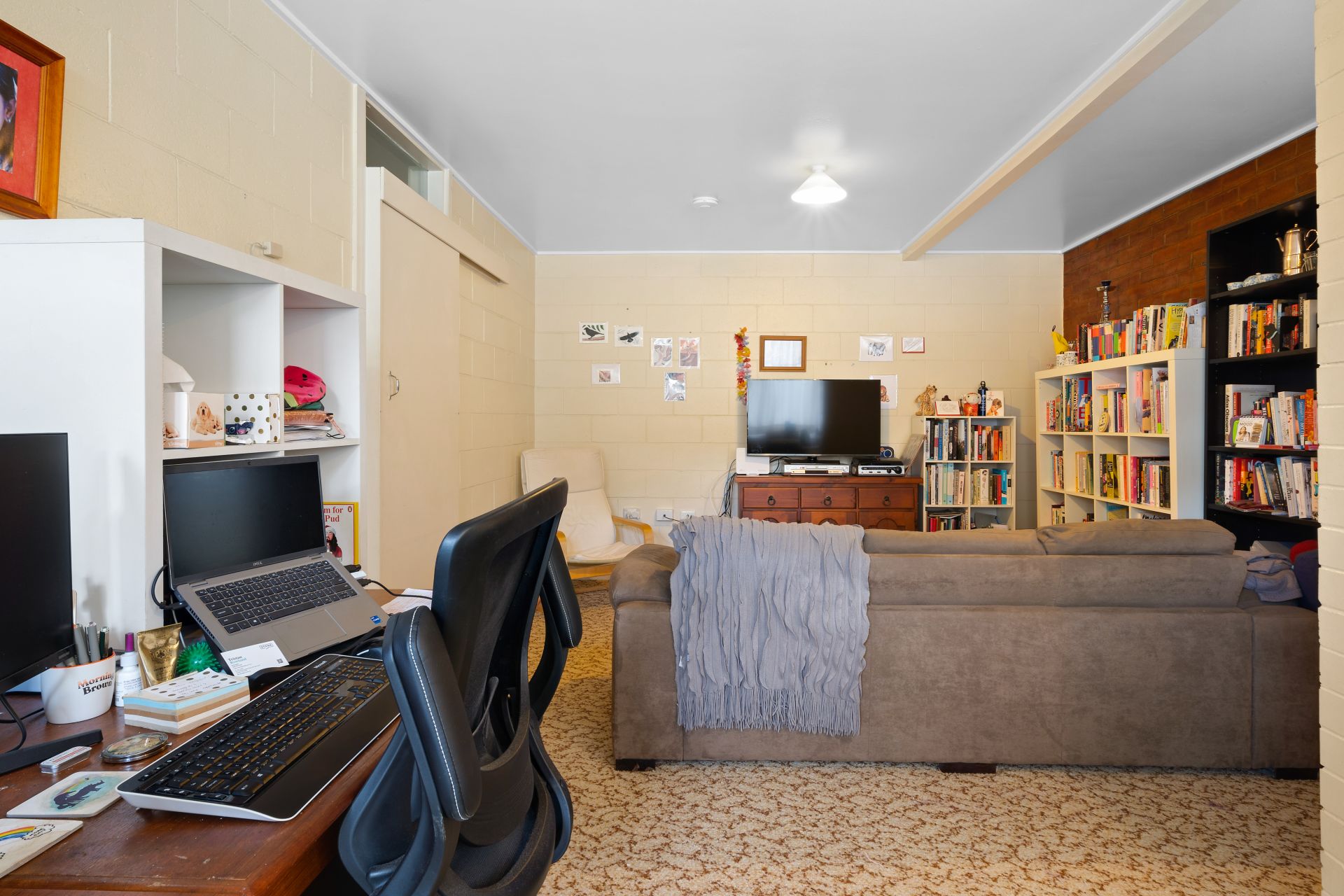 > The open living area flows effortlessly from the entrance and kitchen area through to the bedroom. Featuring carpet flooring, standard lighting, and sliding door access to storeroom.
